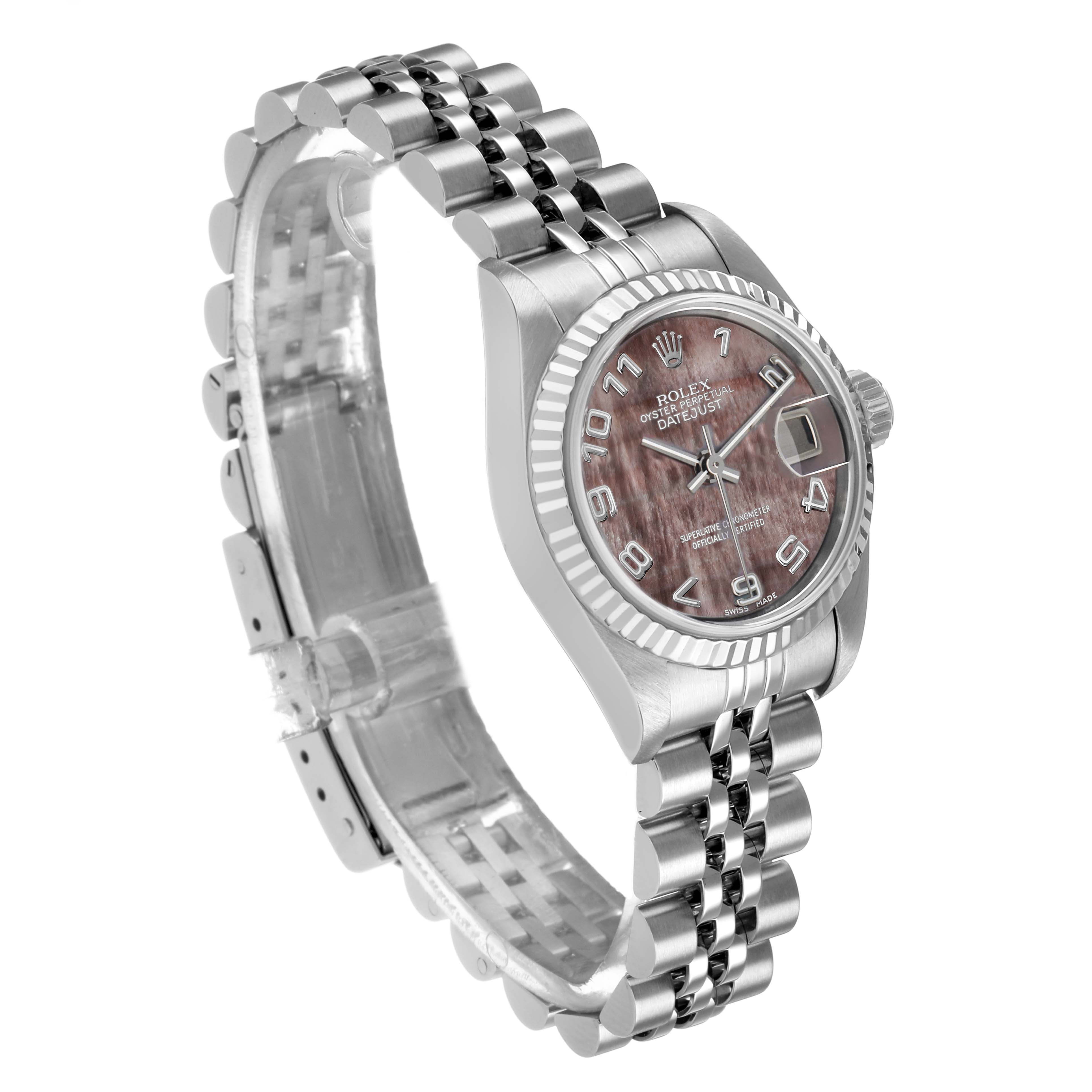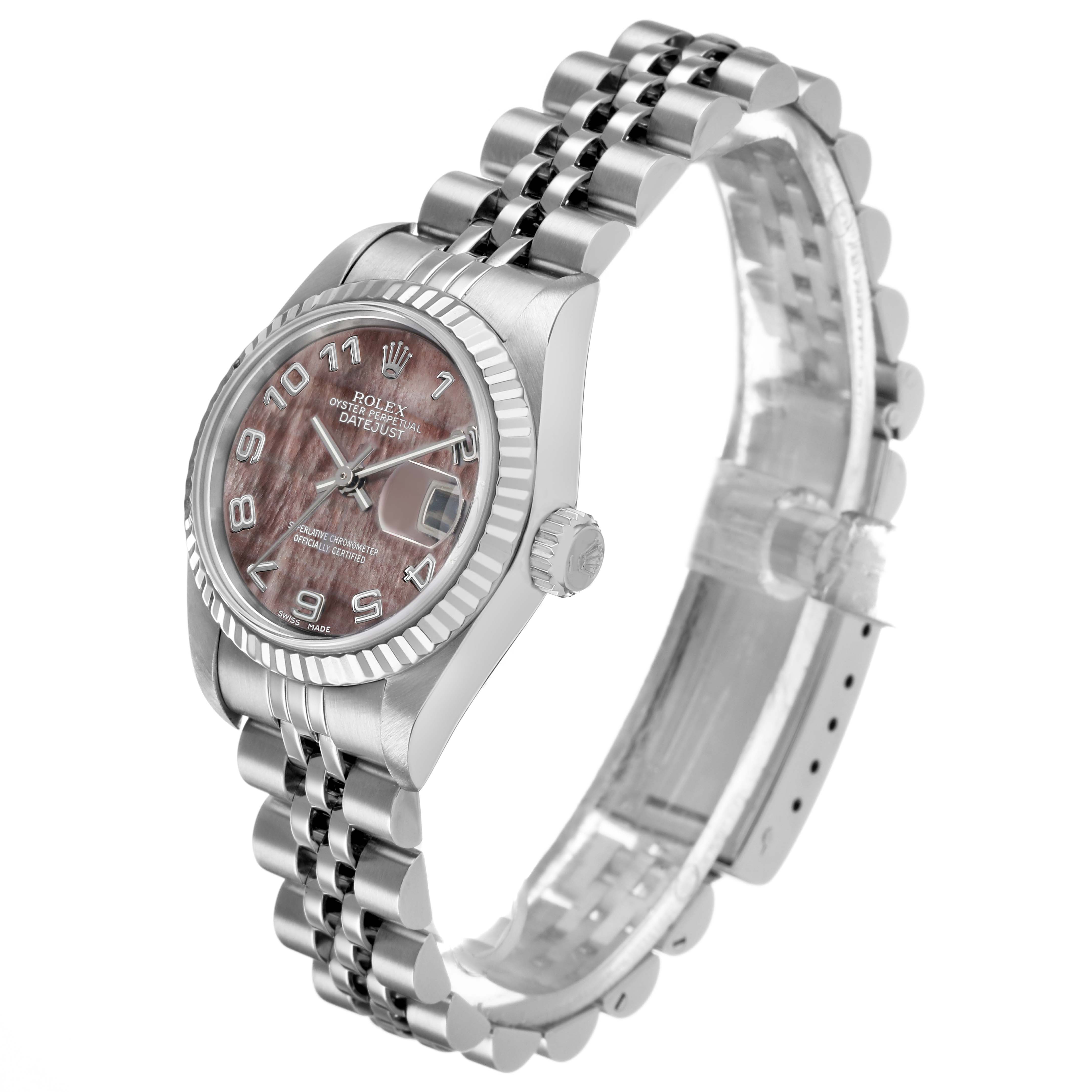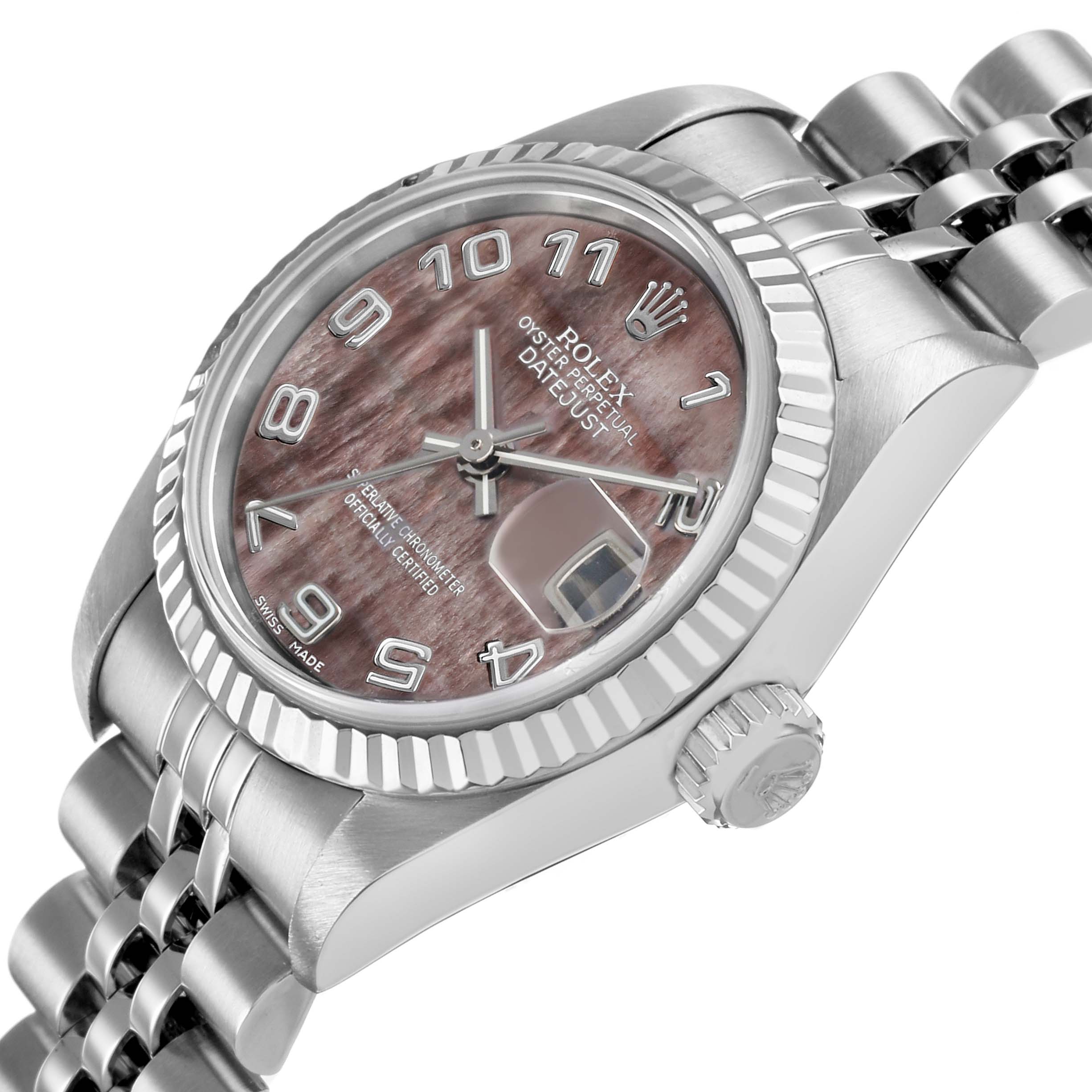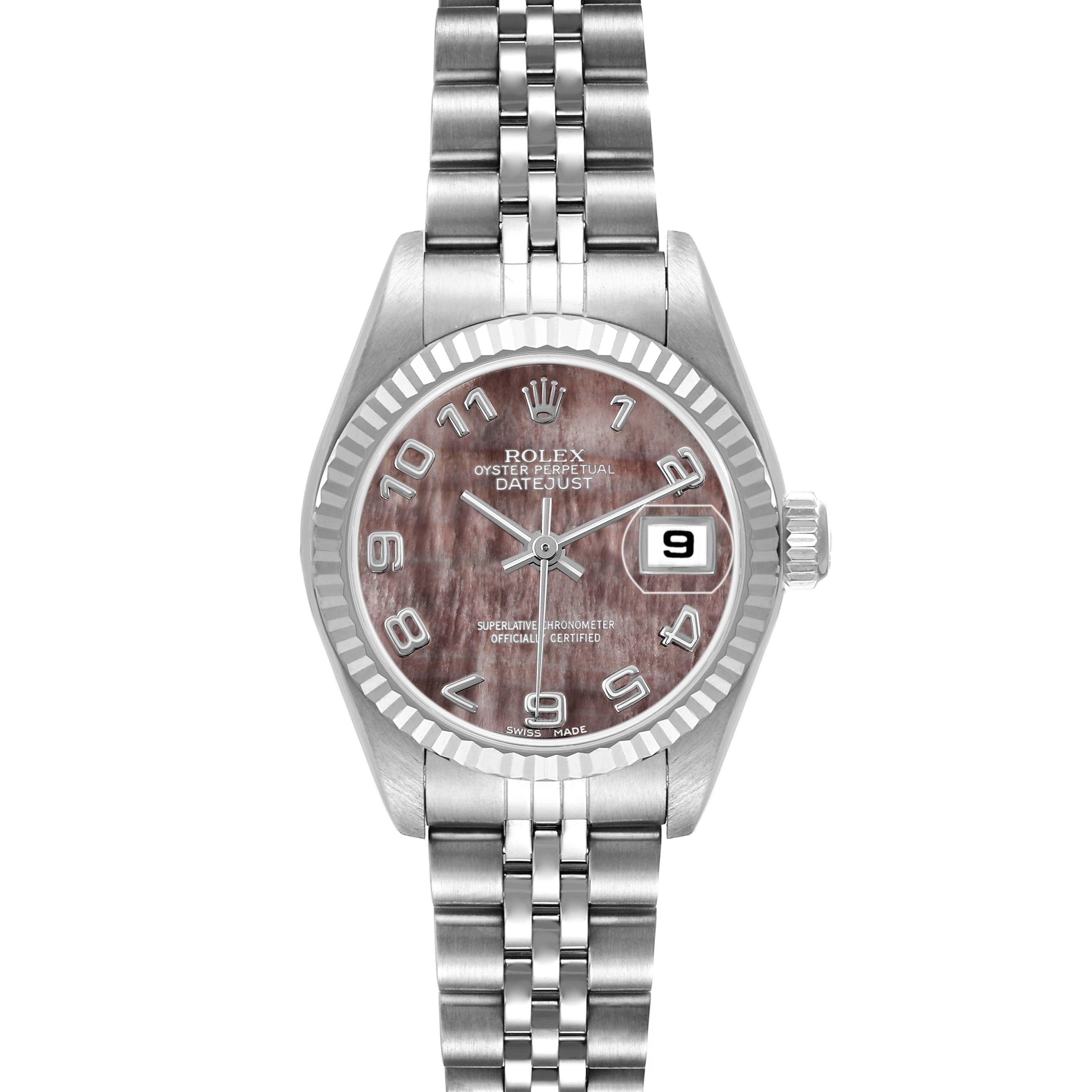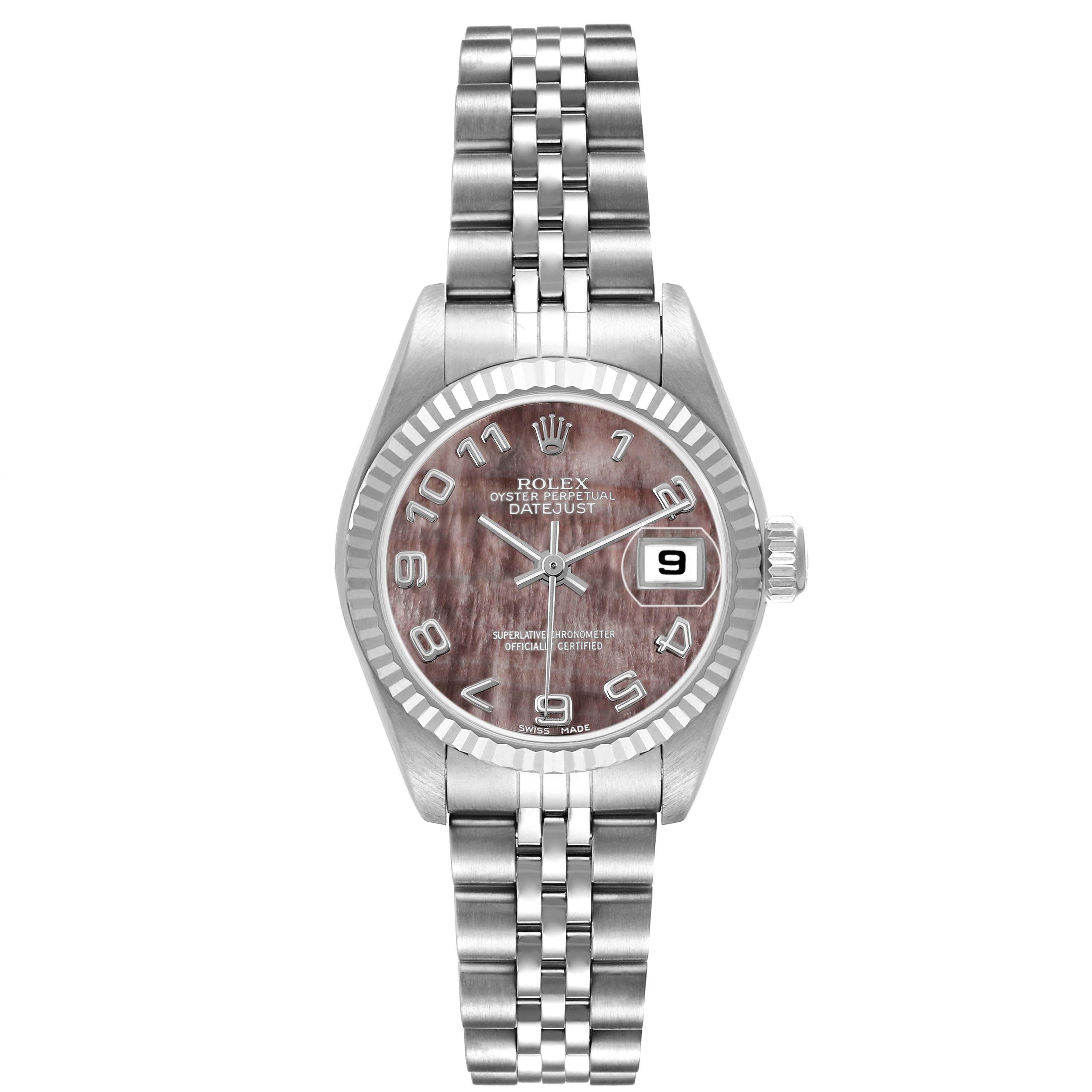 Rolex Datejust Mother of Pearl Steel White Gold Ladies Watch 79174. Officially certified chronometer automatic self-winding movement. Stainless steel oyster case 26.0 mm in diameter. Rolex logo on the crown. 18K white gold fluted bezel. Scratch resistant sapphire crystal with cyclops magnifier. Mother-of-pearl dial with baton hands and raised Arabic numeral hour markers. Date calendar at the 3 o'clock aperture. Stainless steel jubilee bracelet with a fold-over clasp. Fits a 6.5" wrist.