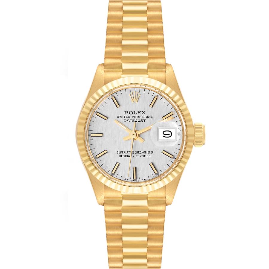 Rolex Datejust President Silver Dial Yellow Gold Vintage Ladies Watch 6917. Automatic self-winding movement. 18K yellow gold oyster case 24 mm in diameter. Rolex logo on the crown. 18k yellow gold fluted bezel. Acrylic crystal with cyclops magnifier. Silver dial with raised yellow gold baton hour markers. 18k yellow gold president bracelet with hidden clasp. Fits 5 3/4" wrist.