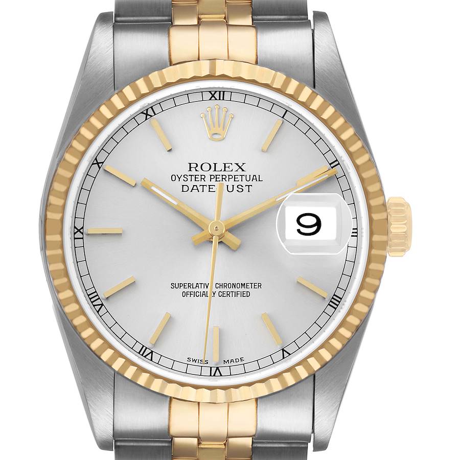 Rolex Datejust Silver Dial Steel Yellow Gold Mens Watch 16233 Papers. Officially certified chronometer automatic self-winding movement. Stainless steel oyster case 36.0 mm in diameter. Rolex logo on the 18k yellow gold crown. 18k yellow gold fluted bezel. Scratch resistant sapphire crystal with a cyclops magnifier. Silver dial with yellow gold baton hands and hour markers. Date calendar at the 3 o'clock aperture. Stainless steel and 18k yellow gold jubilee bracelet with a fold-over clasp. Fits a 7" wrist.