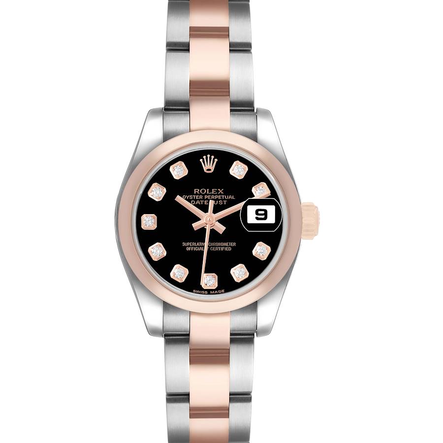 Rolex Datejust Steel Rose Gold Black Diamond Dial Ladies Watch 179161. Officially certified chronometer automatic self-winding movement. Stainless steel oyster case 26.0 mm in diameter. Rolex logo on the 18K rose gold crown. 18k rose gold smooth domed bezel. Scratch resistant sapphire crystal with a cyclops magnifier. Black dial with original Rolex factory diamond markers and rose gold hands. Date calendar at the 3 o'clock aperture. Stainless steel and 18k rose gold oyster bracelet with oysterlock clasp. Fits a 7" wrist.