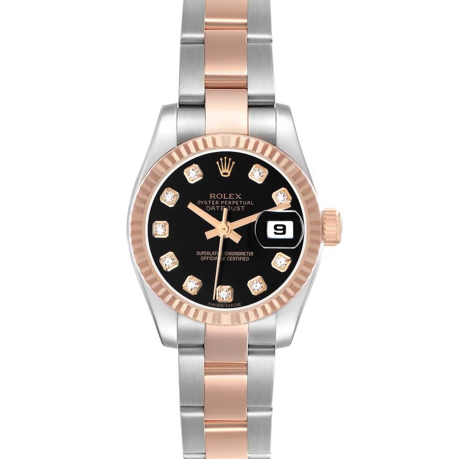Rolex Datejust Steel Rose Gold Black Diamond Dial Ladies Watch 179171 Card. Officially certified chronometer automatic self-winding movement. Stainless steel oyster case 26.0 mm in diameter. Rolex logo on the 18k Everose rose gold crown. 18k Everose rose gold fluted bezel. Scratch resistant sapphire crystal with a cyclops magnifier. Black dial with original Rolex factory diamond hour markers and rose gold baton hands. Date calendar at the 3 o'clock aperture. Stainless steel and 18k rose gold oyster bracelet with a hidden clasp. Fits a 6" wrist.