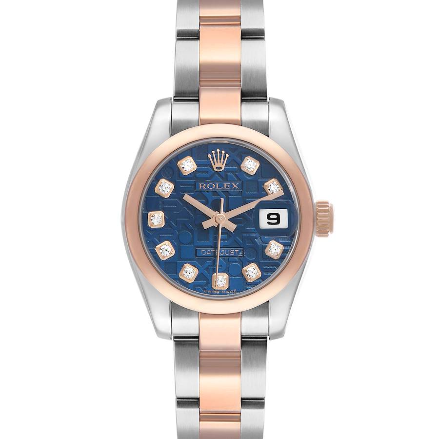 Rolex Datejust Steel Rose Gold Diamond Dial Ladies Watch 179161 Box Card. Officially certified chronometer automatic self-winding movement. Stainless steel oyster case 26.0 mm in diameter. Rolex logo on the 18K rose gold crown. 18k rose gold smooth domed bezel. Scratch resistant sapphire crystal with a cyclops magnifier. Blue jubilee anniversary dial with original Rolex factory diamond markers and rose gold hands. Date calendar at the 3 o'clock aperture. Stainless steel and 18k rose gold oyster bracelet with a folding clasp. Fits a 6 3/4" wrist.