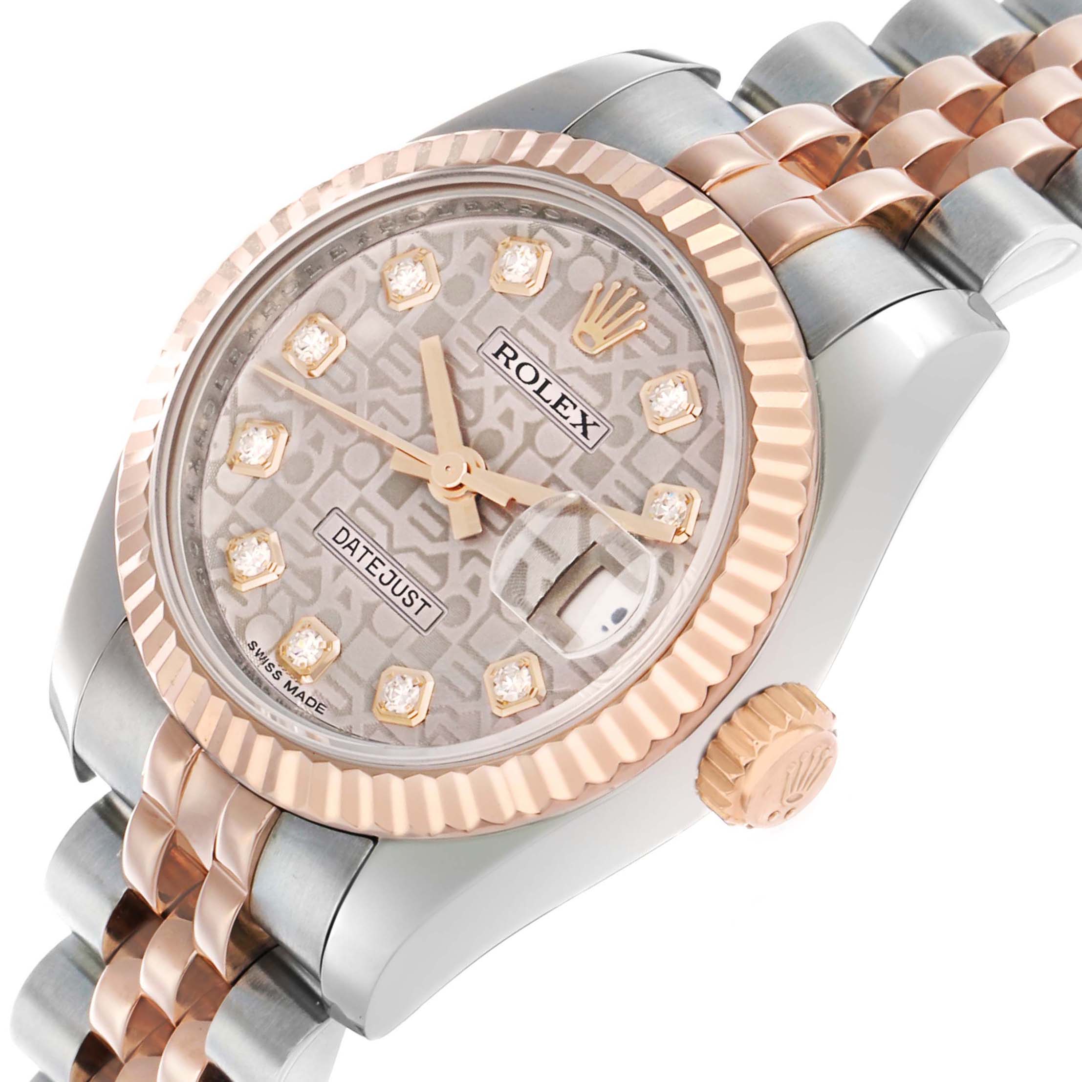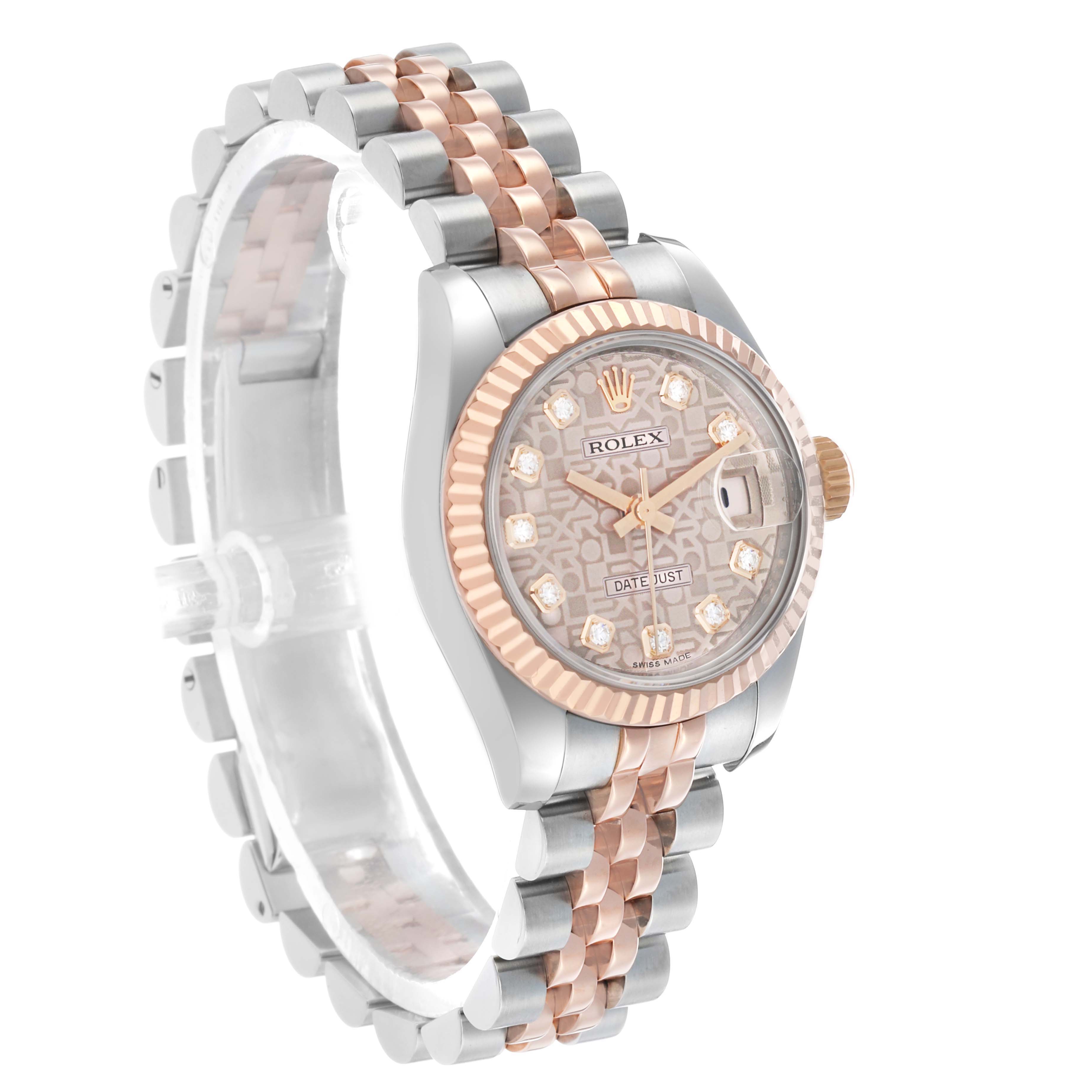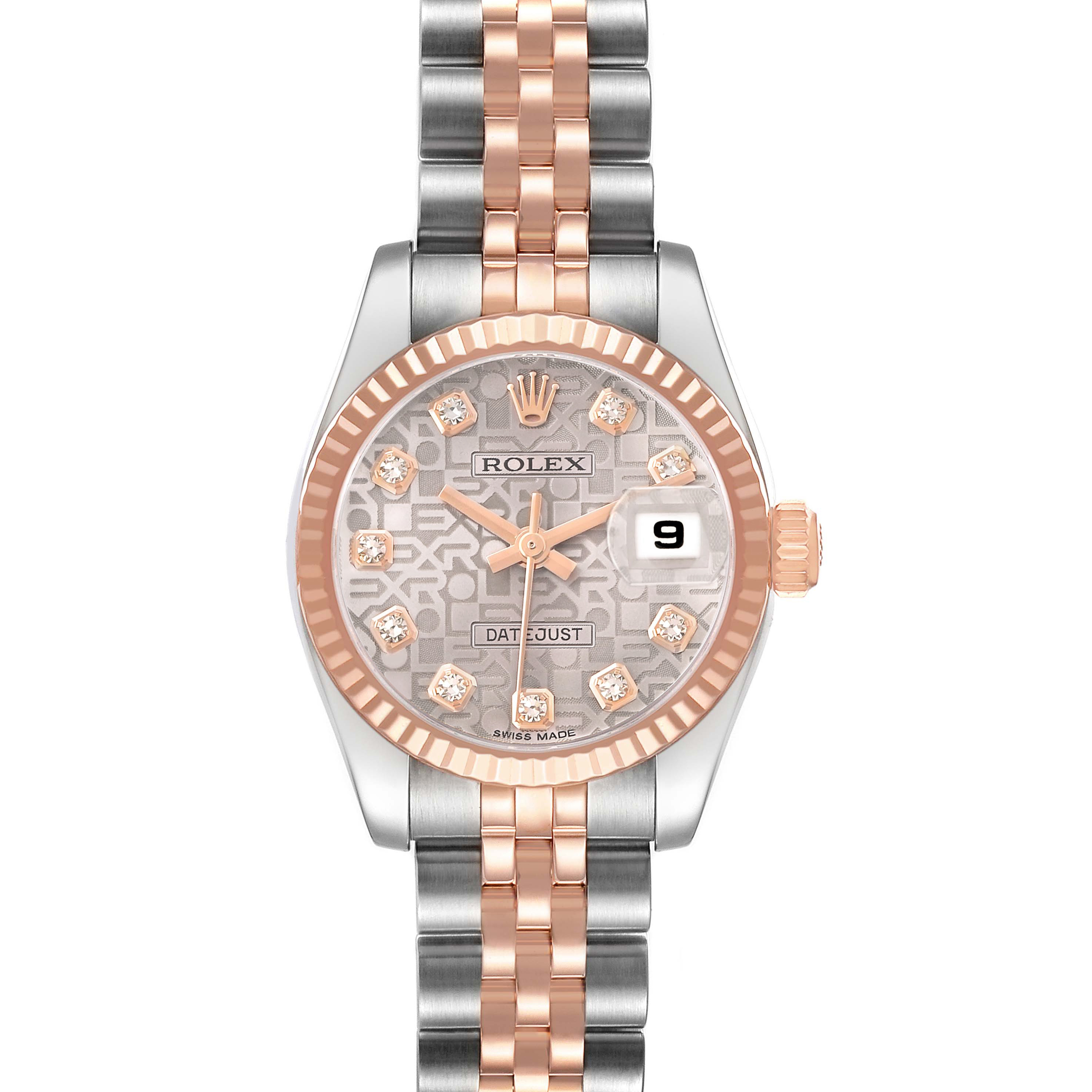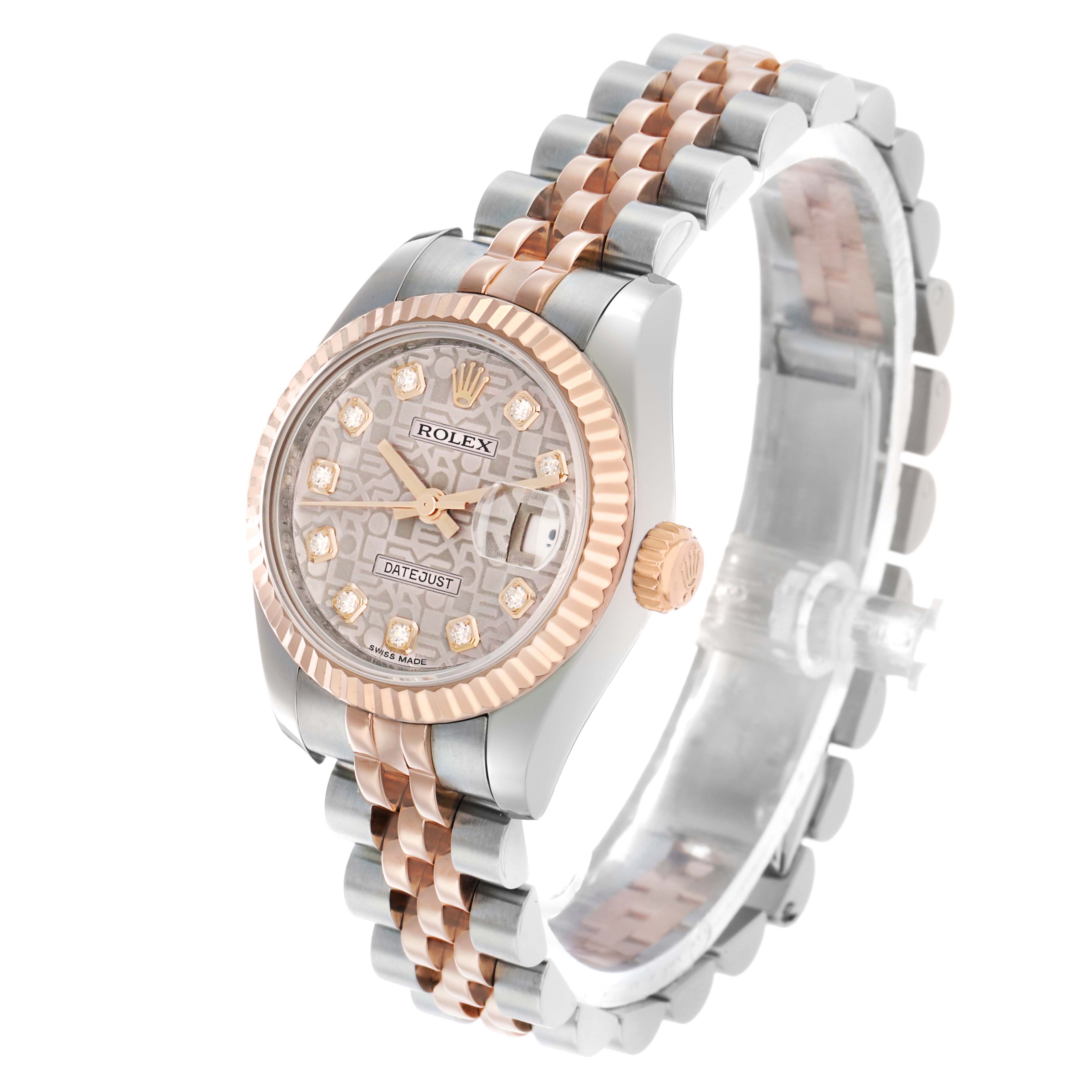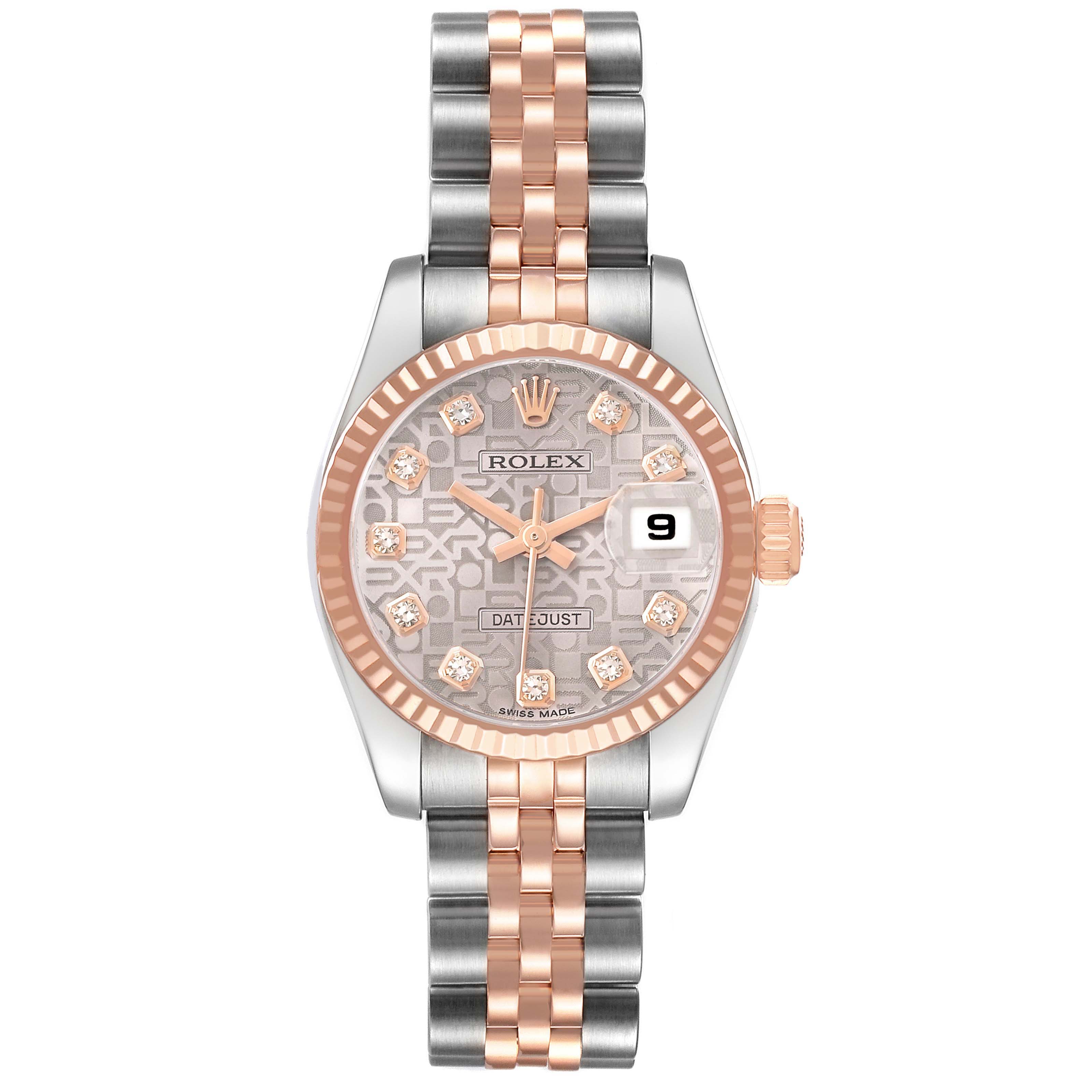 Rolex Datejust Steel Rose Gold Diamond Ladies Watch 179171. Officially certified chronometer automatic self-winding movement. Stainless steel oyster case 26.0 mm in diameter. Rolex logo on 18K rose gold crown. 18k rose gold fluted bezel. Scratch resistant sapphire crystal with cyclops magnifier. Silver jubilee anniversary dial with 18k rose gold baton hands and original Rolex factory diamond hour markers. Date calendar at the 3 o'clock aperture. Stainless steel and 18k rose gold jubilee bracelet with a hidden clasp. Fits a 6.5" wrist.