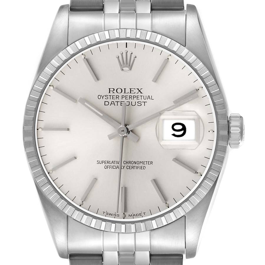 Rolex Datejust Steel Silver Dial Engine Turned Bezel Mens Watch 16220. Officially certified chronometer automatic self-winding movement. Stainless steel oyster case 36.0 mm in diameter. Rolex logo on the crown. Stainless steel engine-turned bezel. Scratch resistant sapphire crystal with a cyclops magnifier. Silver dial with raised silver-toned baton hour markers and luminescent hands. Stick minute markers on the outer rim. Date window at the 3 o'clock aperture. Stainless steel jubilee bracelet with a fold-over clasp. Fits a 7" wrist.