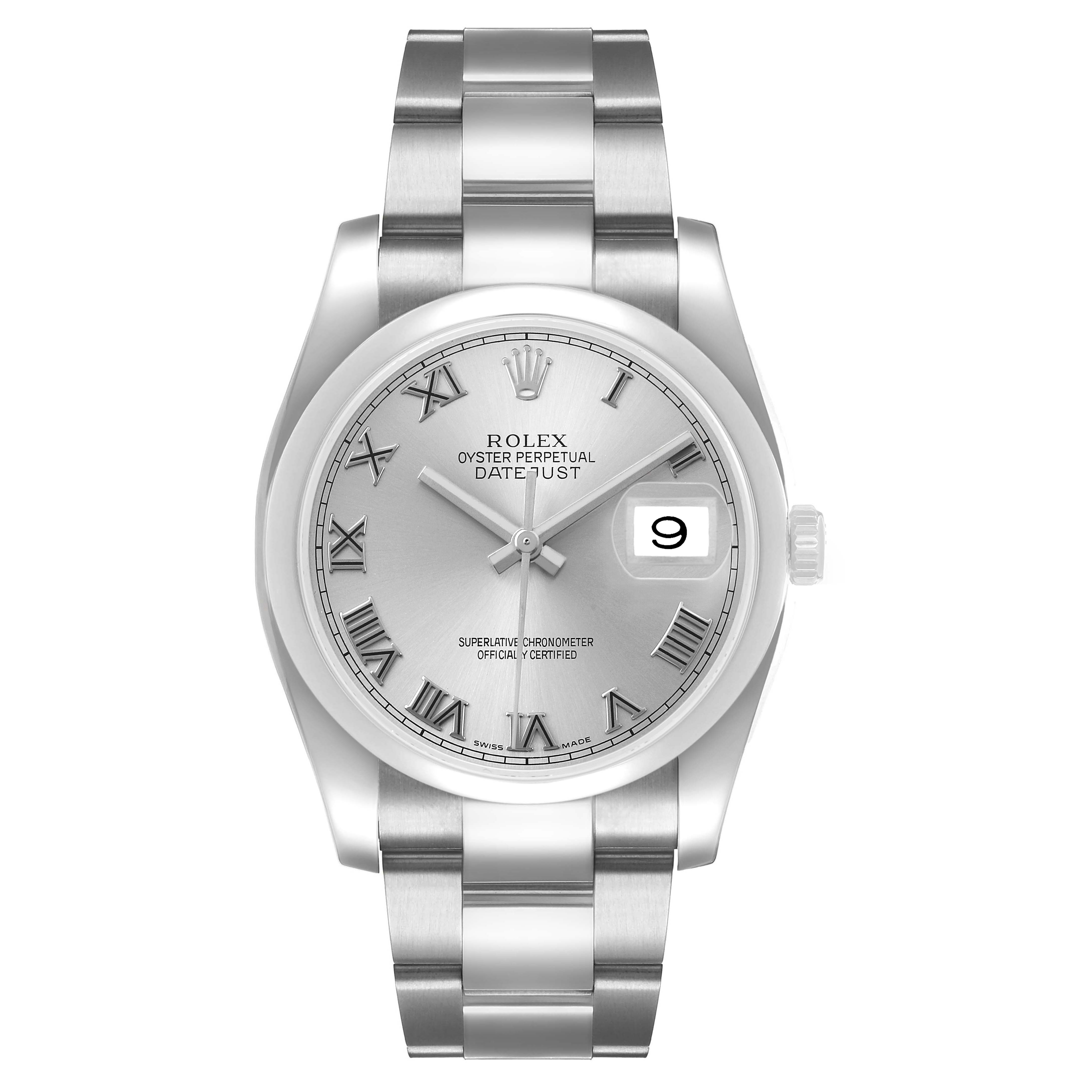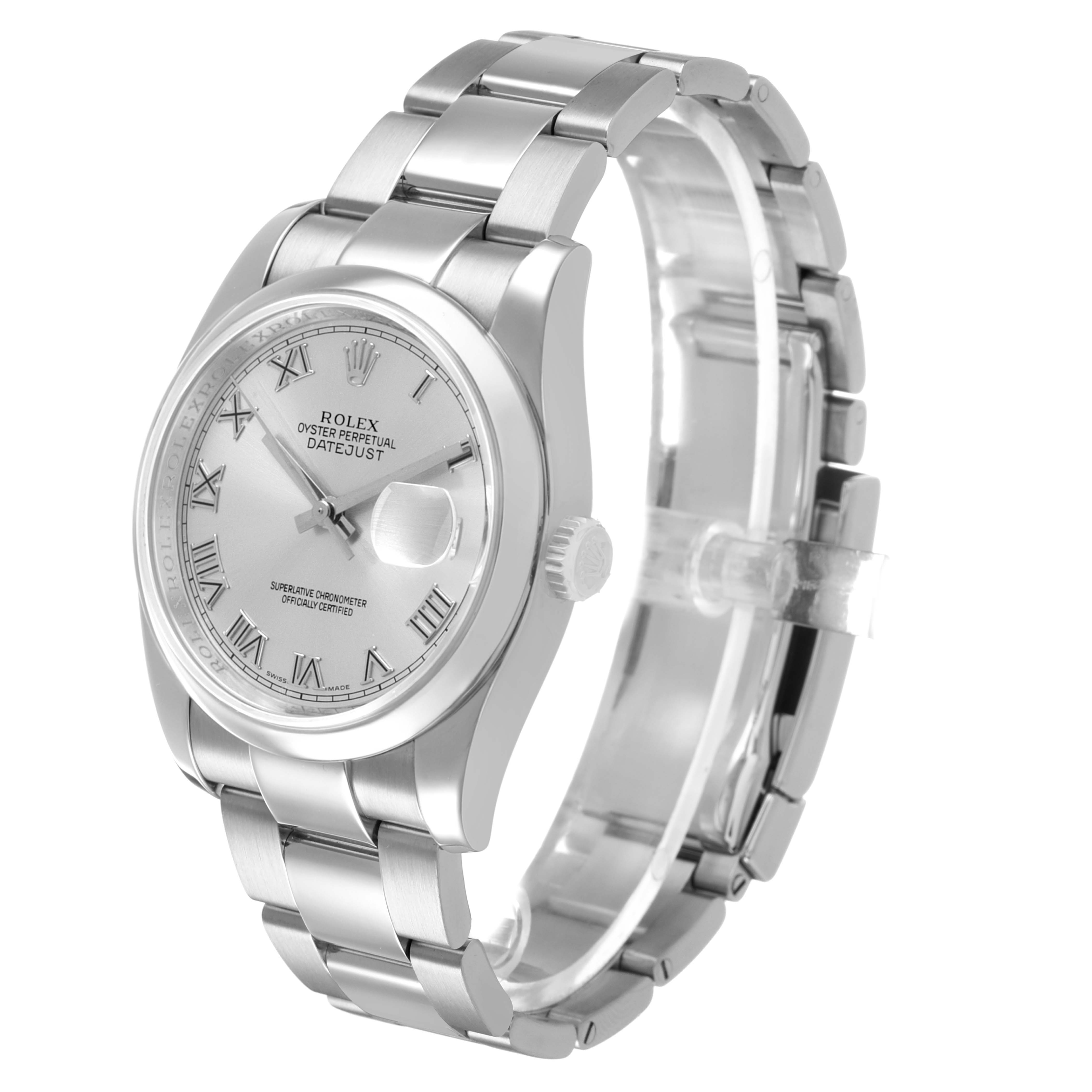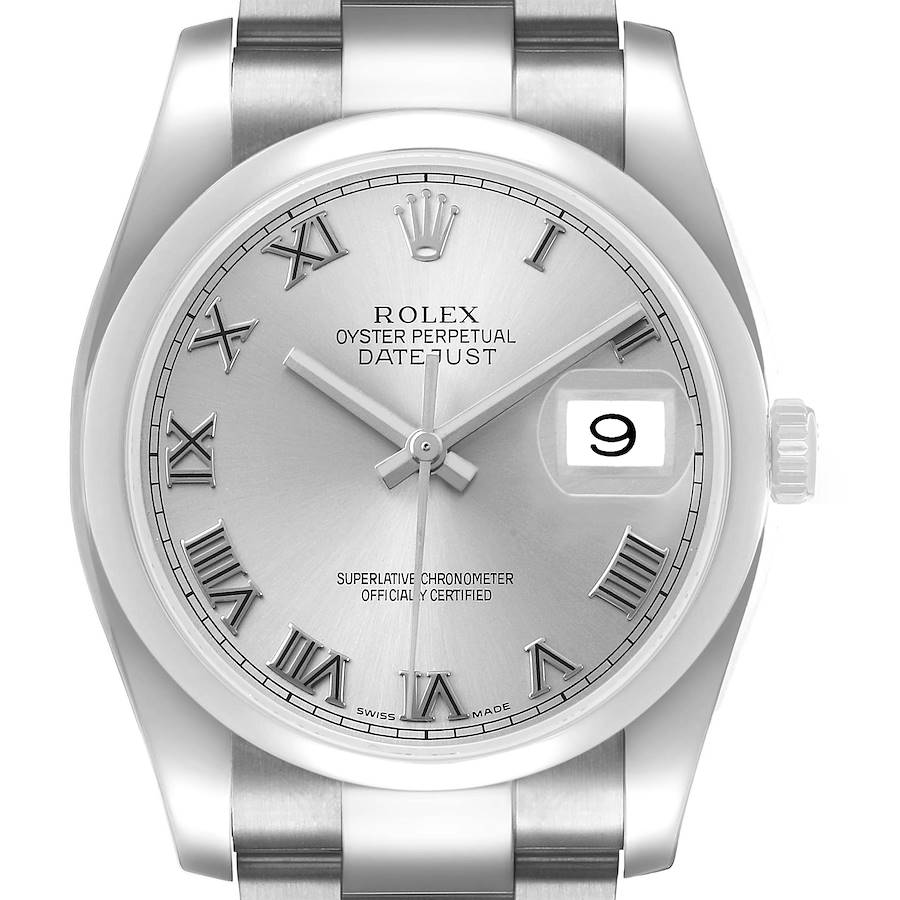 Rolex Datejust Steel Silver Roman Dial Mens Watch 116200 Card. Officially certified chronometer self-winding movement. Stainless steel Oyster case 36.0 mm in diameter. Rolex logo on a crown. Stainless steel smooth domed bezel. Scratch resistant sapphire crystal with cyclops magnifier. Silver dial with raised Roman numeral hour markers and baton hands. Date window at 3 o'clock aperture. Stainless steel Oyster bracelet with a folding clasp. Fits a 7.5" wrist.