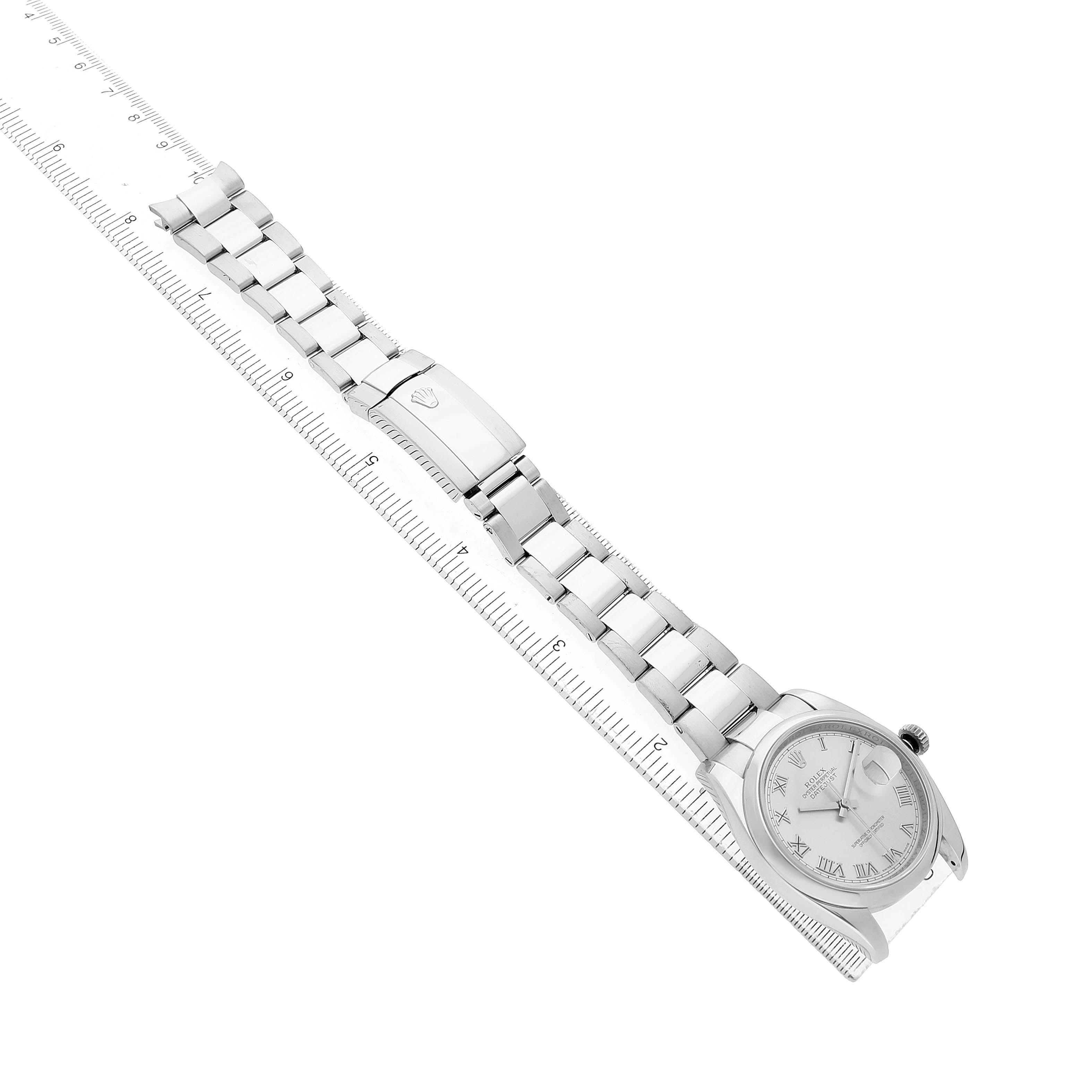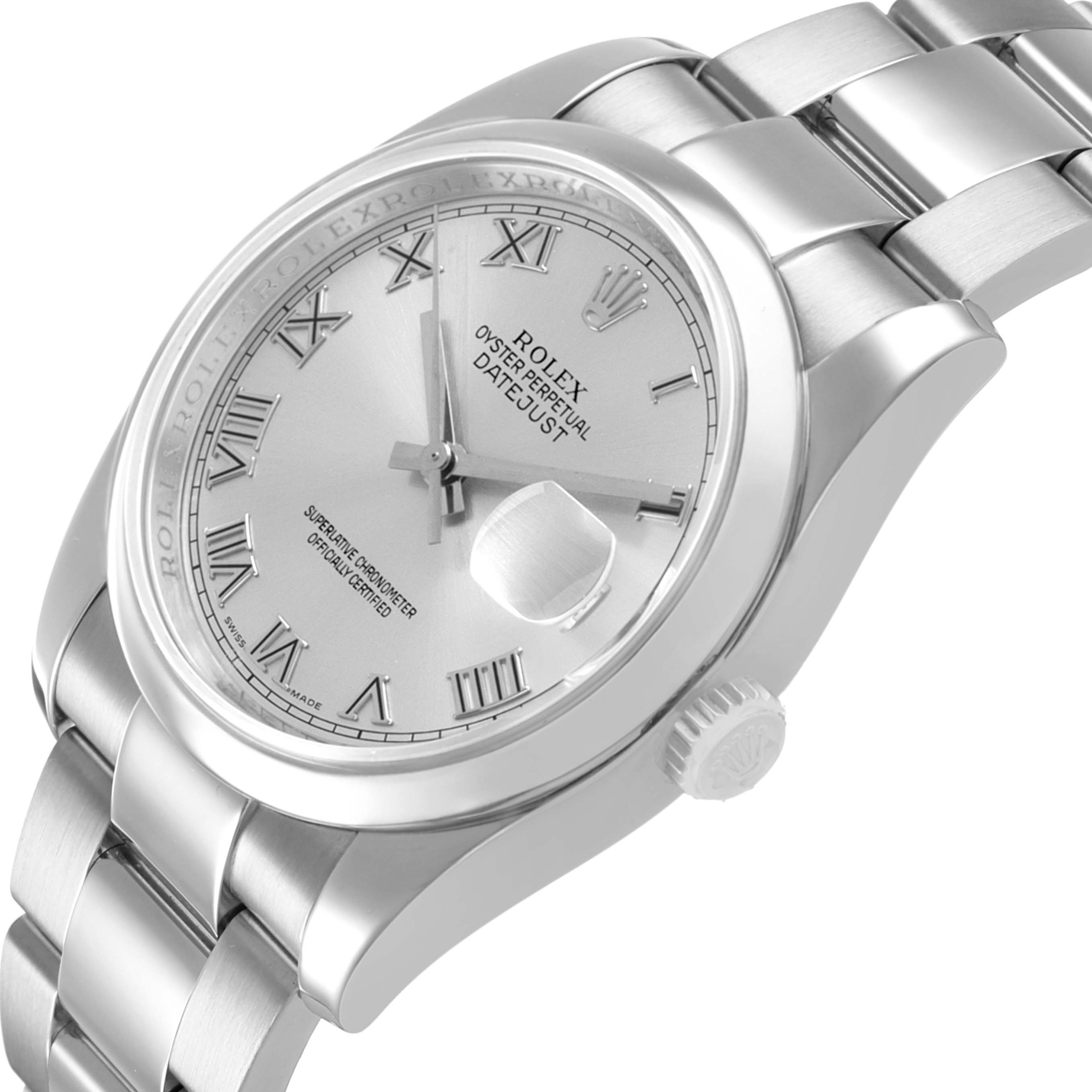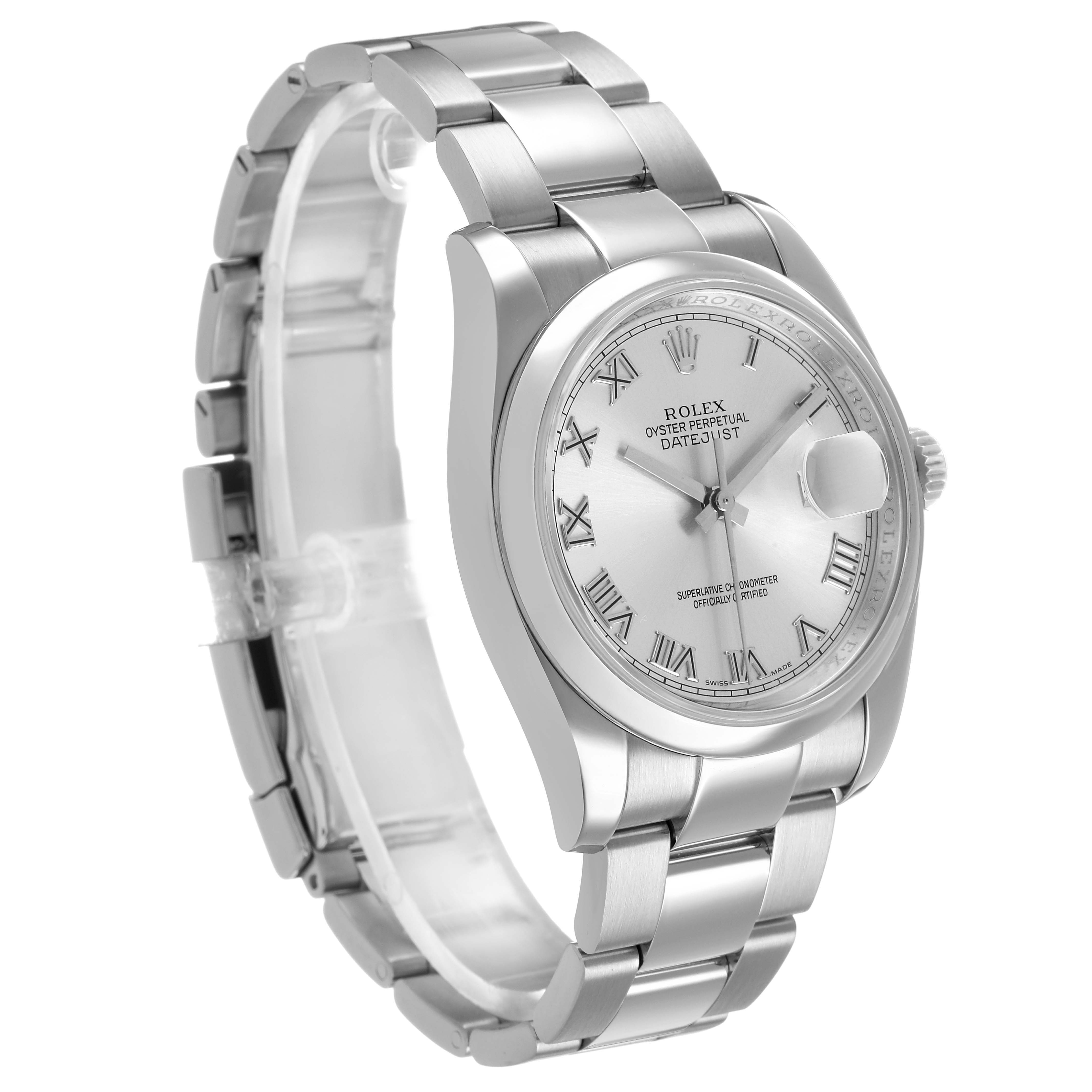 Rolex Datejust Steel Silver Roman Dial Mens Watch 116200 Card. Officially certified chronometer self-winding movement. Stainless steel Oyster case 36.0 mm in diameter. Rolex logo on a crown. Stainless steel smooth domed bezel. Scratch resistant sapphire crystal with cyclops magnifier. Silver dial with raised Roman numeral hour markers and baton hands. Date window at 3 o'clock aperture. Stainless steel Oyster bracelet with a folding clasp. Fits a 7.5" wrist.