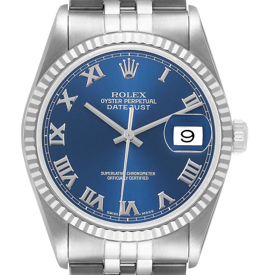Rolex Datejust Steel White Gold Blue Dial Mens Watch 16234. Officially certified chronometer automatic self-winding movement. Stainless steel oyster case 36.0 mm in diameter. Rolex logo on the crown. 18k white gold fluted bezel. Scratch resistant sapphire crystal with a cyclops magnifier. Blue dial with raised white gold Roman numeral hour markers. Date calendar at the 3 o'clock aperture. Outer white railroad minute track. Stainless steel jubilee bracelet with a fold-over clasp. Fits a 7" wrist.