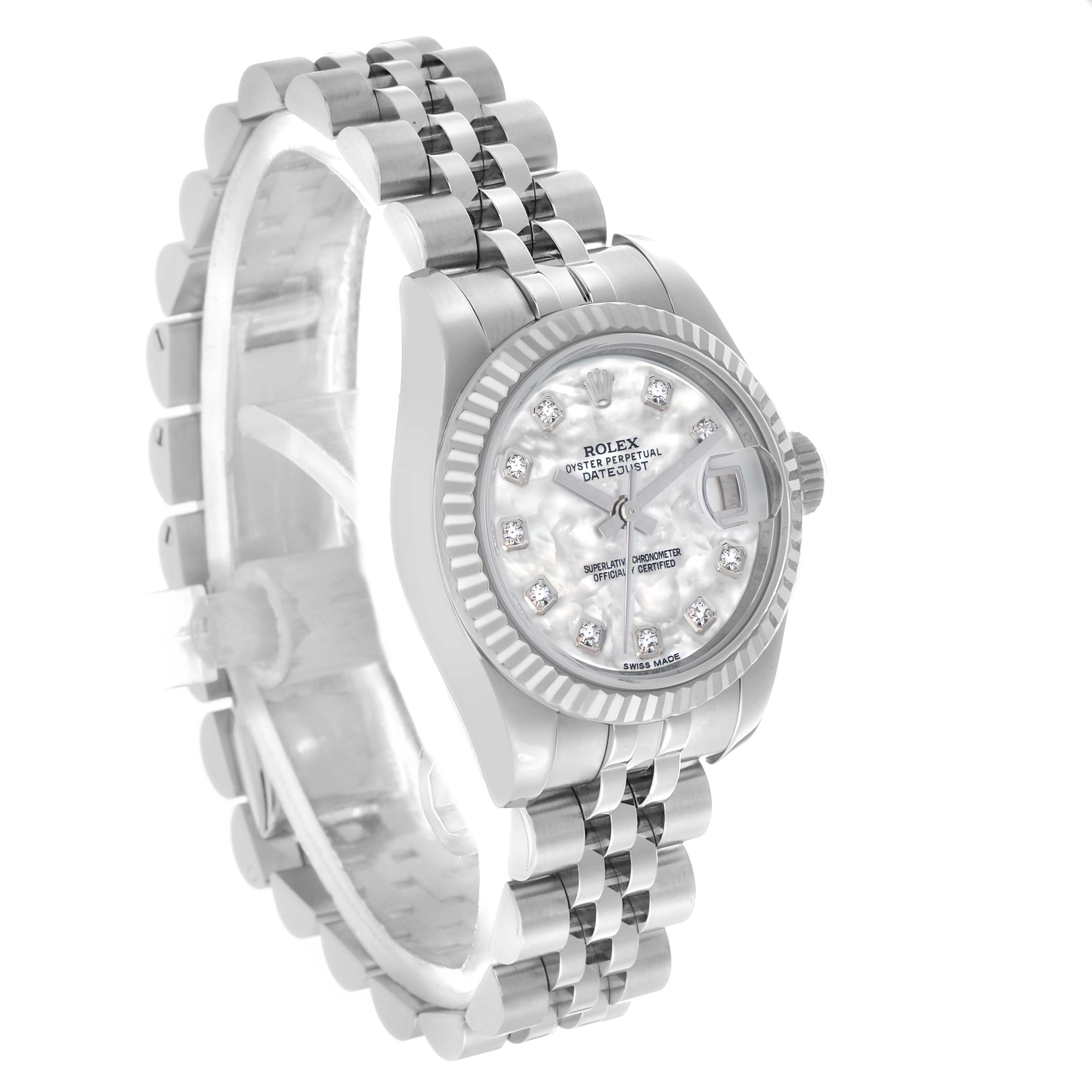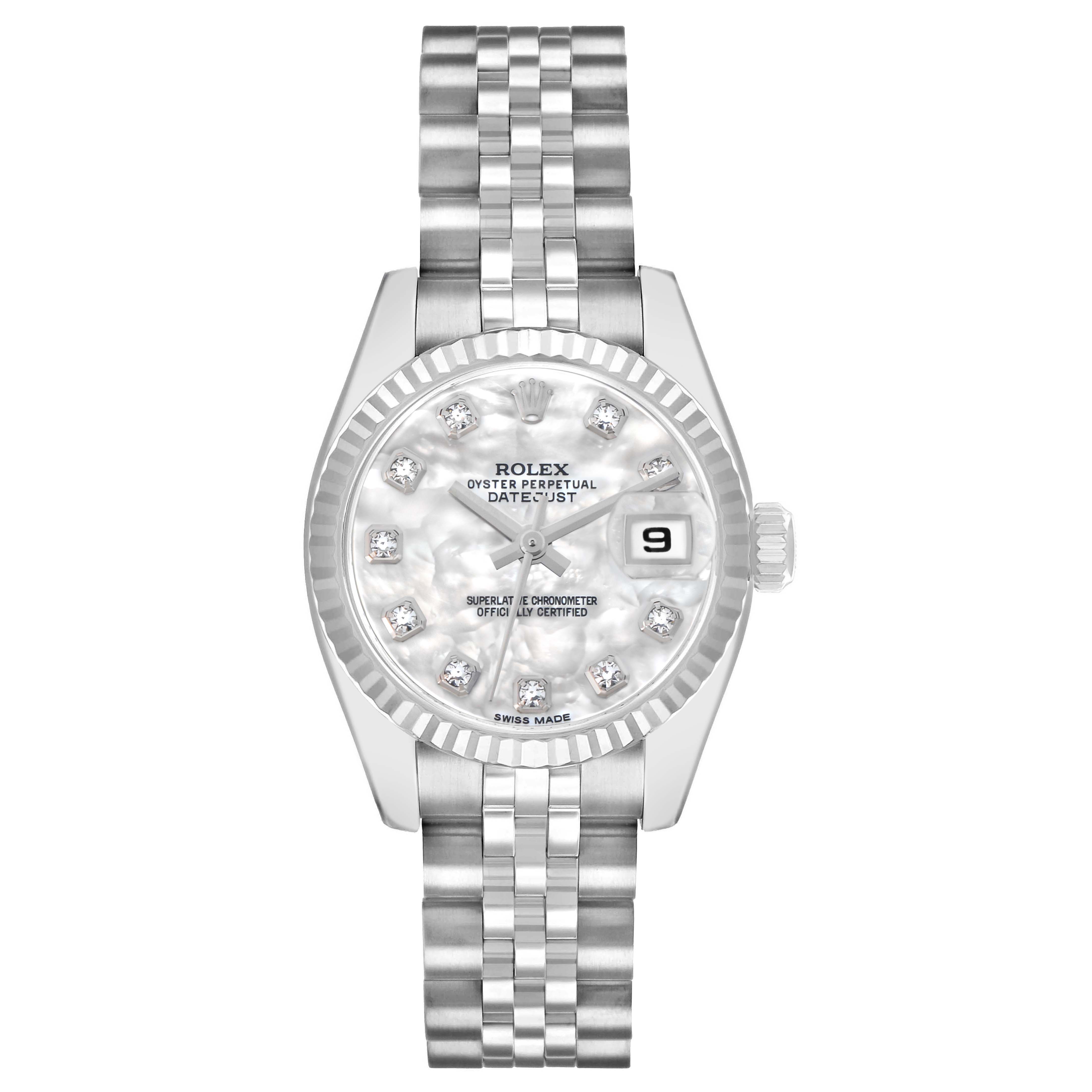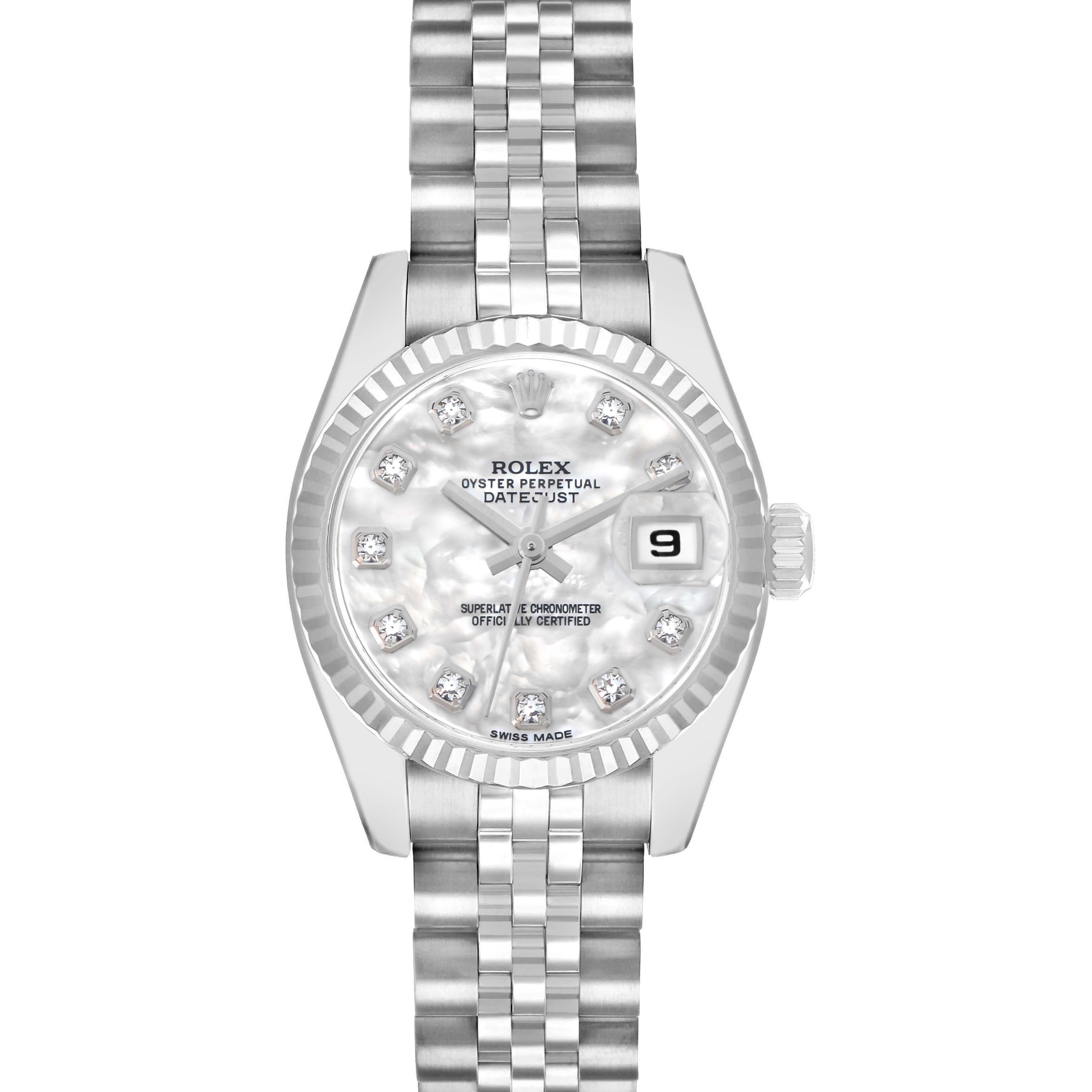 Rolex Datejust Steel White Gold Diamond Mother Of Pearl Ladies Watch 179174. Officially certified chronometer, automatic self-winding movement. Stainless steel oyster case 26.0 mm in diameter. Rolex logo on the crown. 18K white gold fluted bezel. Scratch-resistant sapphire crystal with cyclops magnifier. Mother of Pearl dial with white gold baton hands and original Rolex factory diamond hour markers. Date calendar at the 3 o'clock aperture. Stainless steel jubilee bracelet with a hidden clasp. Fits a 6 1/4" wrist.