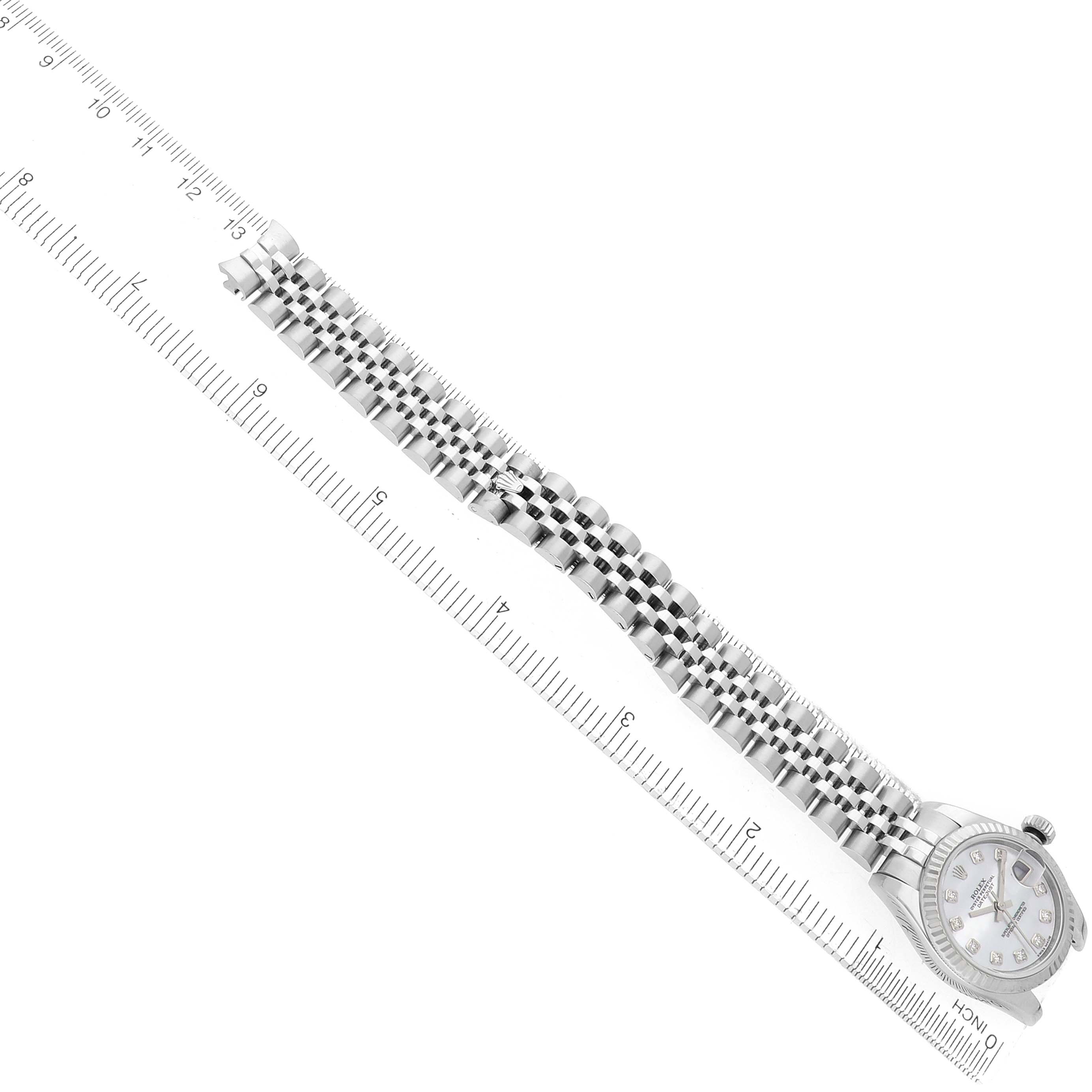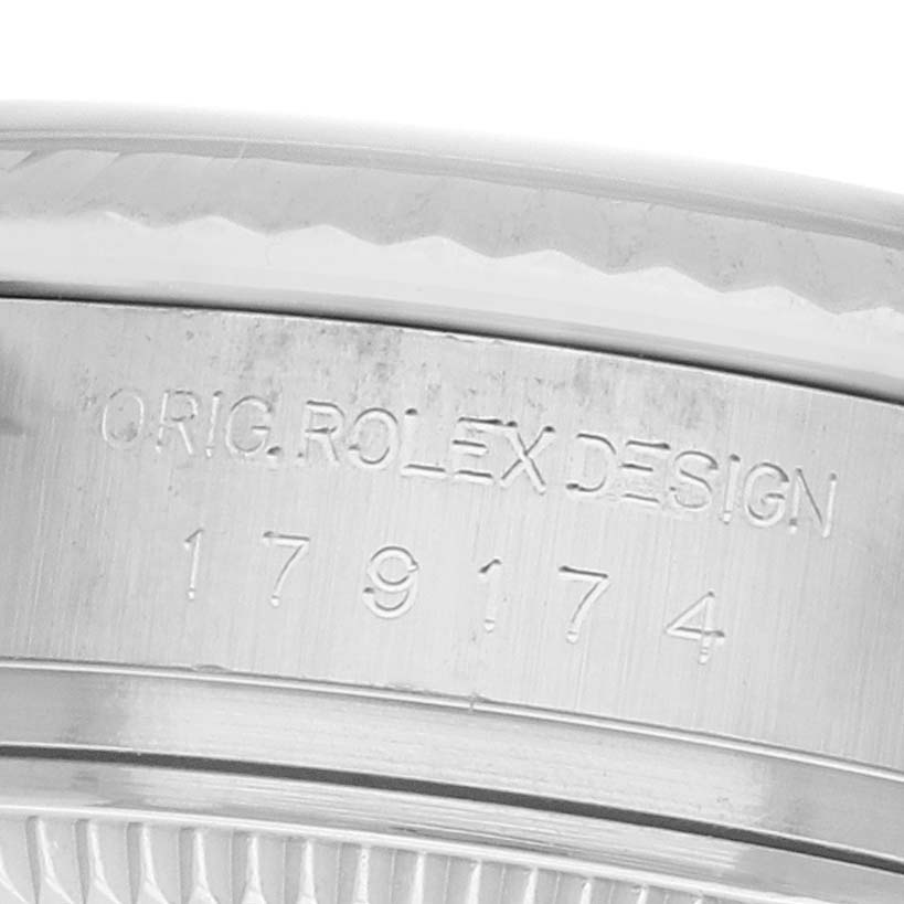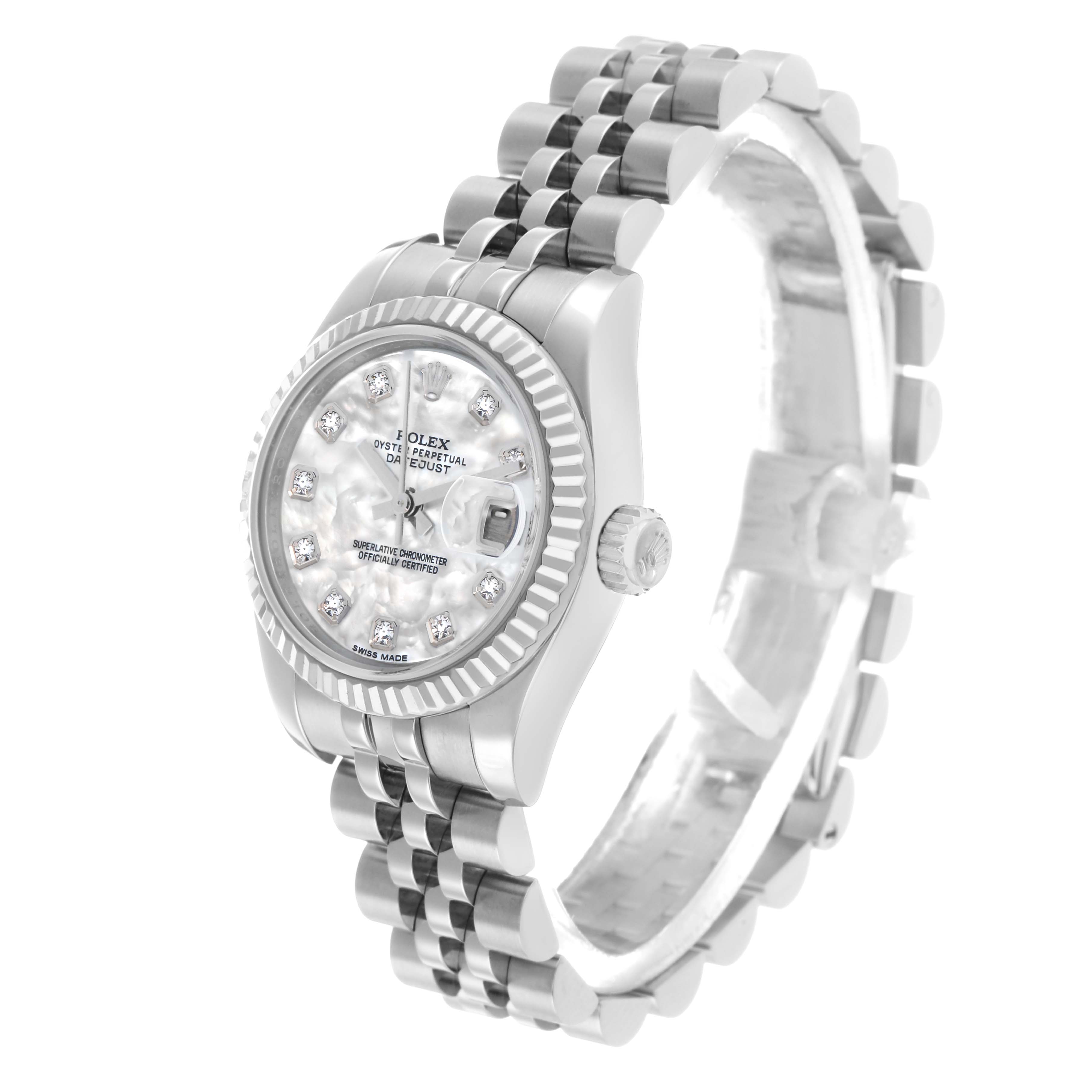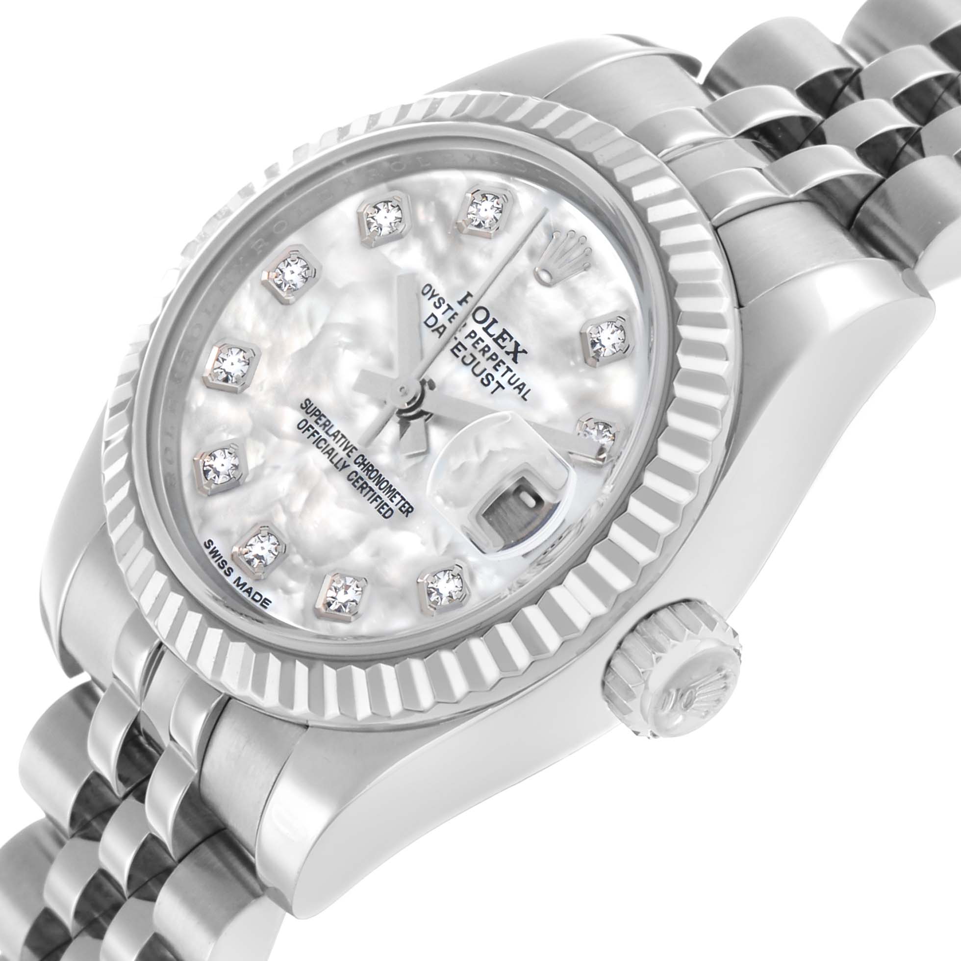 Rolex Datejust Steel White Gold Diamond Mother Of Pearl Ladies Watch 179174. Officially certified chronometer, automatic self-winding movement. Stainless steel oyster case 26.0 mm in diameter. Rolex logo on the crown. 18K white gold fluted bezel. Scratch-resistant sapphire crystal with cyclops magnifier. Mother of Pearl dial with white gold baton hands and original Rolex factory diamond hour markers. Date calendar at the 3 o'clock aperture. Stainless steel jubilee bracelet with a hidden clasp. Fits a 6 1/4" wrist.