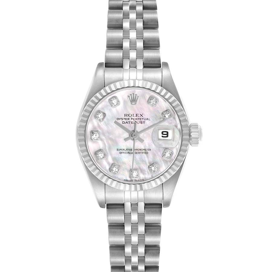 Rolex Datejust Steel White Gold MOP Diamond Dial Ladies Watch 79174 Papers. Officially certified chronometer automatic self-winding movement. Stainless steel oyster case 26.0 mm in diameter. Rolex logo on the crown. 18K white gold fluted bezel. Scratch resistant sapphire crystal with a cyclops magnifier. Mother-of-pearl dial with original Rolex factory diamond hour markers and white gold baton hands. Date calendar at the 3 o'clock aperture. Stainless steel jubilee bracelet with a fold-over clasp. Fits a 6 1/4" wrist.