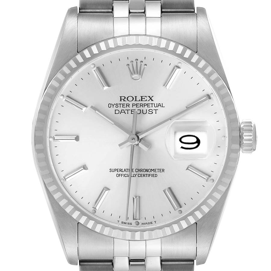 Rolex Datejust Steel White Gold Silver Dial Mens Watch 16234. Officially certified chronometer automatic self-winding movement. Stainless steel oyster case 36.0 mm in diameter. Rolex logo on the crown. 18K white gold fluted bezel. Scratch resistant sapphire crystal with a cyclops magnifier. Silver dial with white gold baton hour markers baton hands. Date calendar at the 3 o'clock aperture. Outer minute marker track. Stainless steel jubilee bracelet with a fold-over clasp. Fits an 8" wrist.