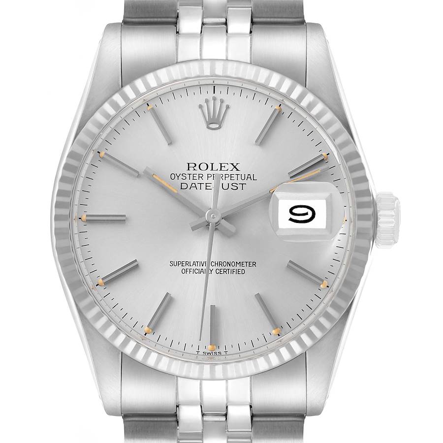 Rolex Datejust Steel White Gold Silver Dial Vintage Mens Watch 16014. Officially certified chronometer automatic self-winding movement. Stainless steel oyster case 36.0 mm in diameter. Rolex logo on the crown. 18k white gold fluted bezel. Acrylic crystal with a cyclops magnifier. Silver dial with baton hands and hour markers. Date calendar at the 3 o'clock aperture. Stainless steel jubilee bracelet with a fold-over clasp. Fits an 8" wrist.