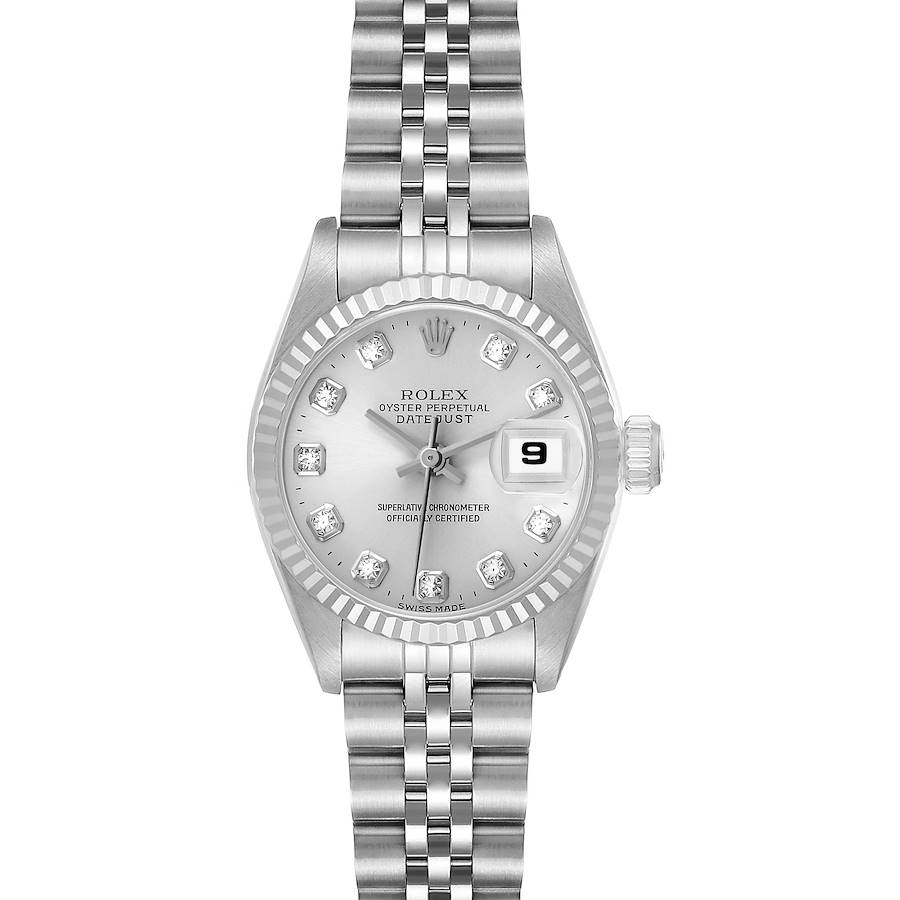 Rolex Datejust Steel White Gold Silver Diamond Dial Ladies Watch 69174. Officially certified chronometer automatic self-winding movement. Stainless steel oyster case 26.0 mm in diameter. Rolex logo on the crown. 18k white gold fluted bezel. Scratch resistant sapphire crystal with a cyclops magnifier. Silver dial with original Rolex factory diamond hour markers and baton hands. Date calendar at the 3 o'clock aperture. Stainless steel jubilee bracelet with a fold-over clasp. Fits a 6 1/4" wrist.