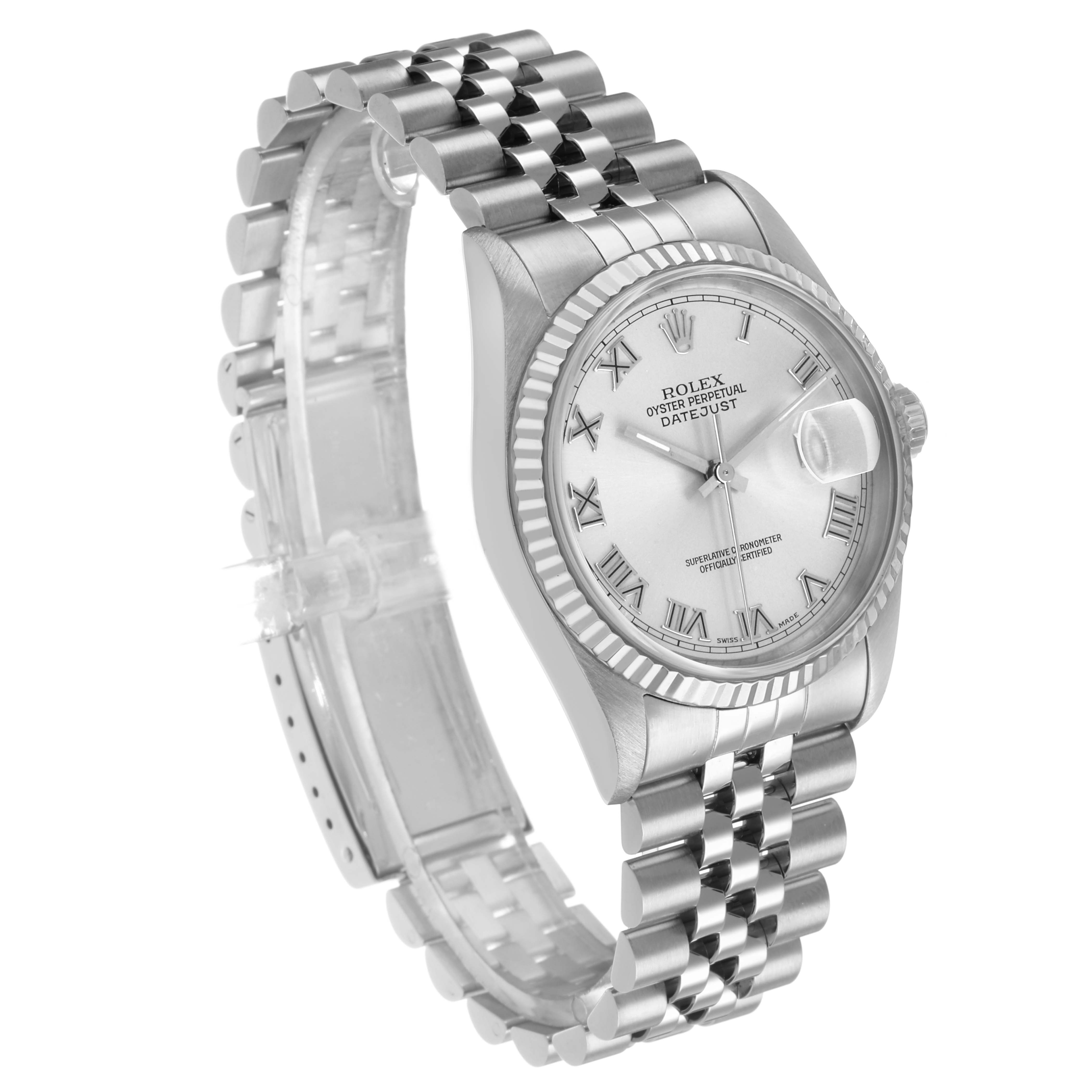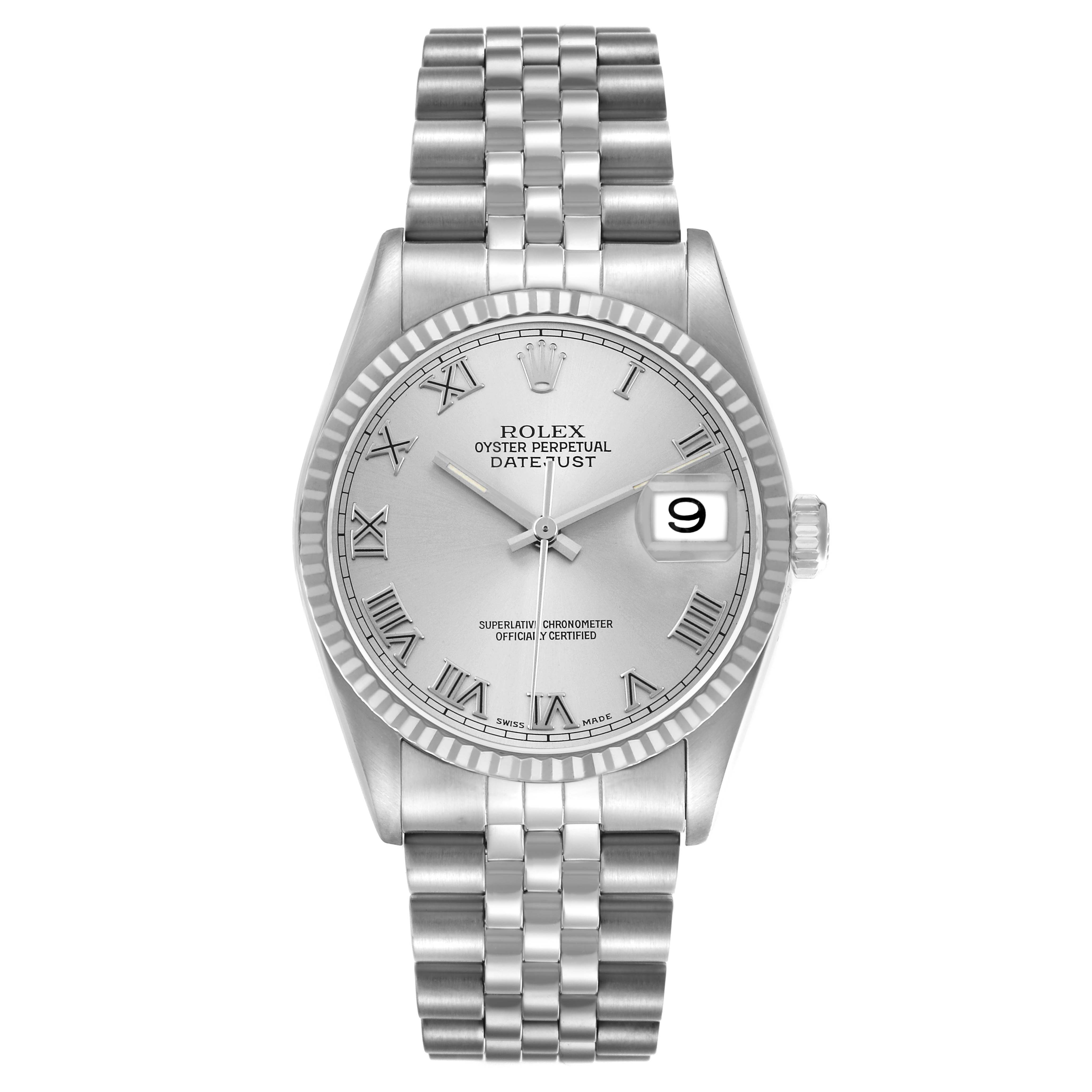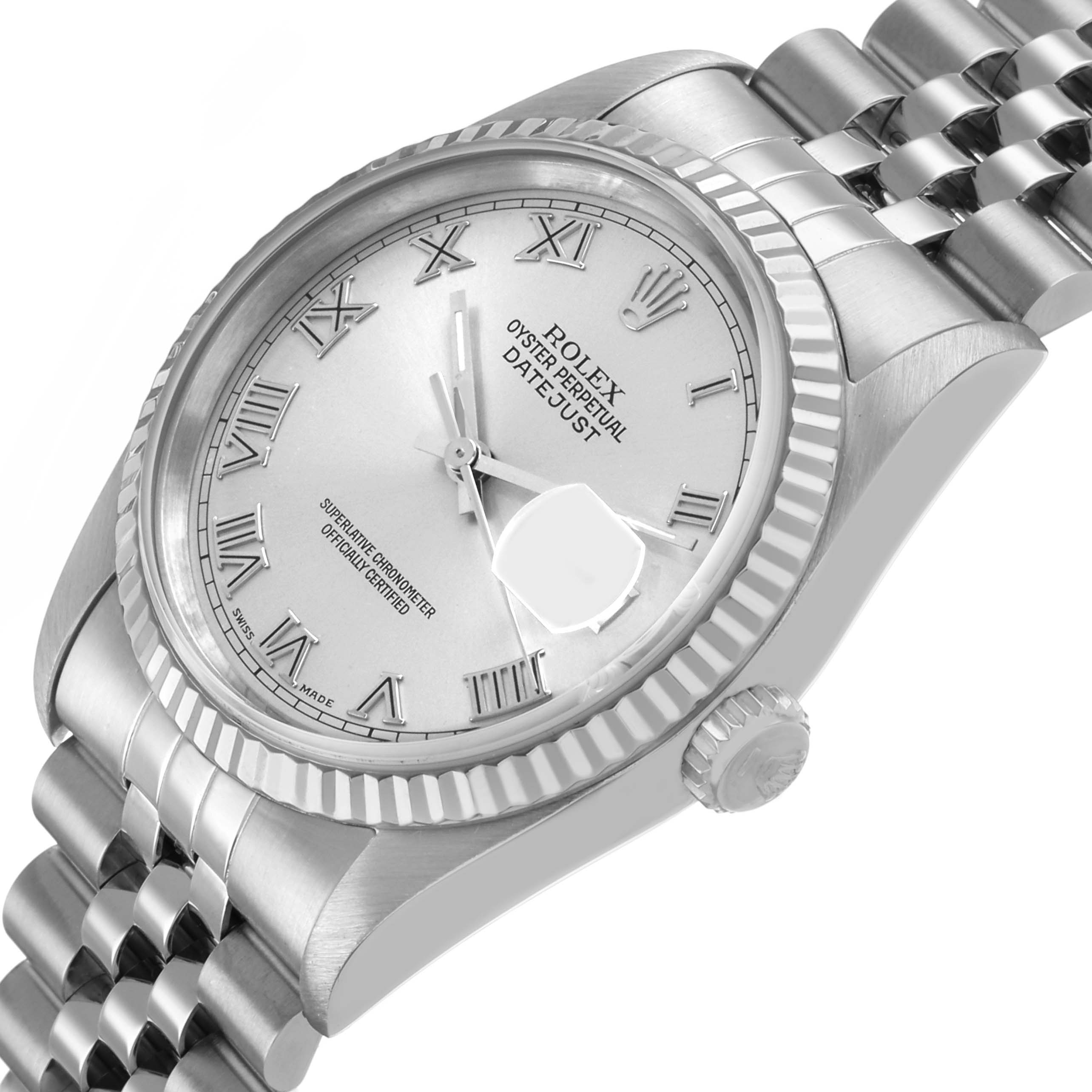 Rolex Datejust Steel White Gold Silver Roman Dial Mens Watch 16234. Officially certified chronometer automatic self-winding movement. Stainless steel oyster case 36.0 mm in diameter. Rolex logo on the crown. 18K white gold fluted bezel. Scratch resistant sapphire crystal with a cyclops magnifier. Silver dial with raised Roman numeral hour markers and baton hands. Date calendar at the 3 o'clock aperture. Outer minute marker track. Stainless steel jubilee bracelet with a foldover clasp. Fits a 7.5" wrist.