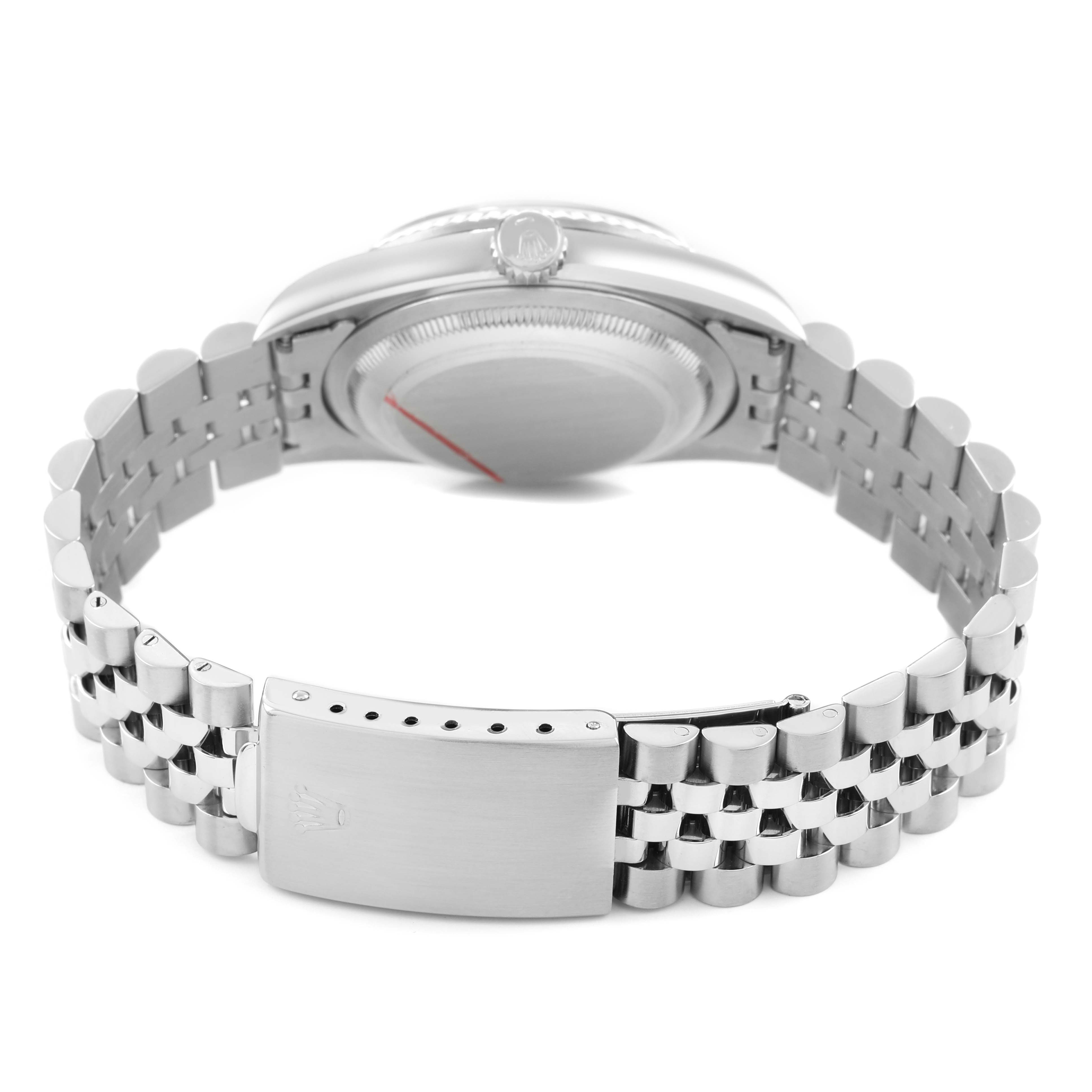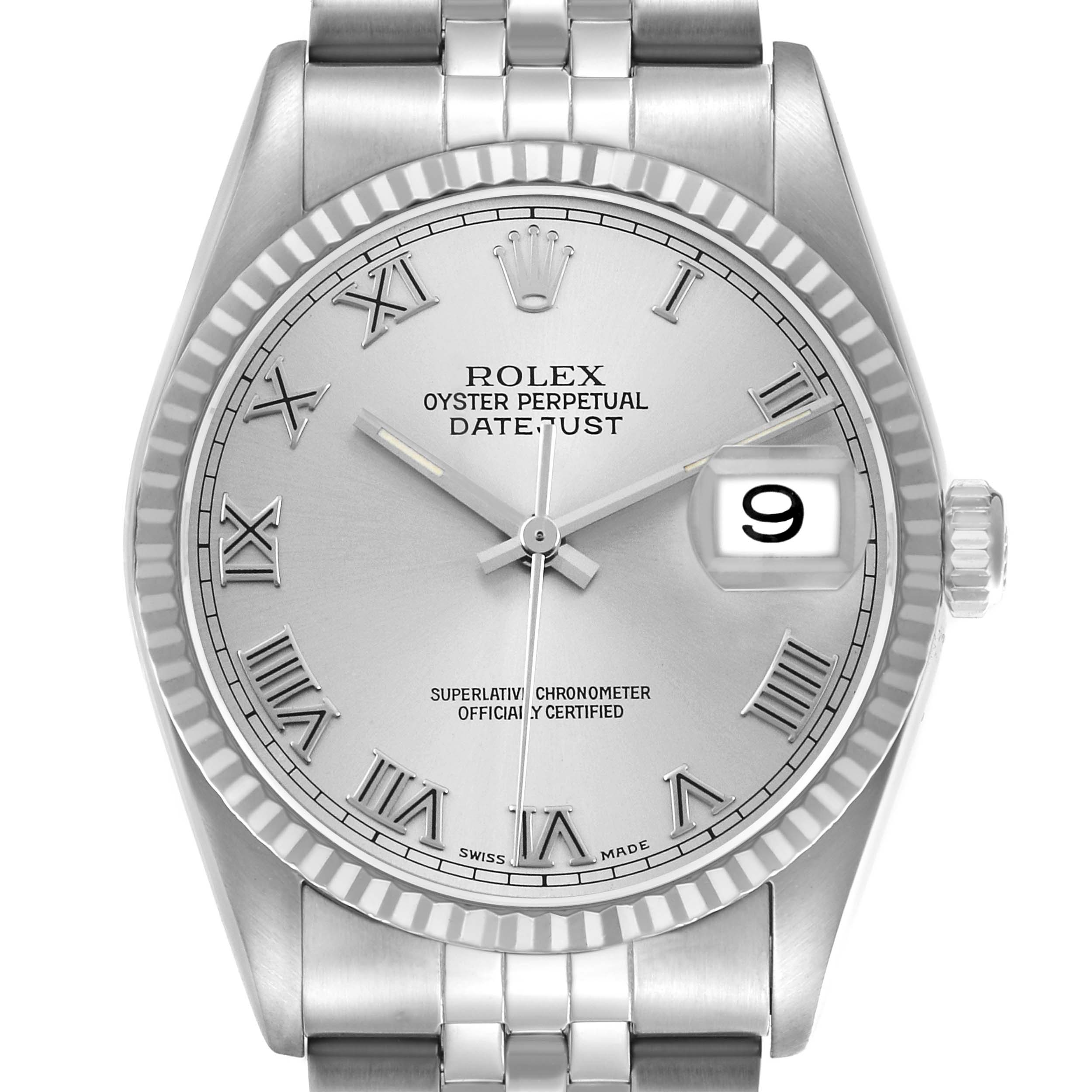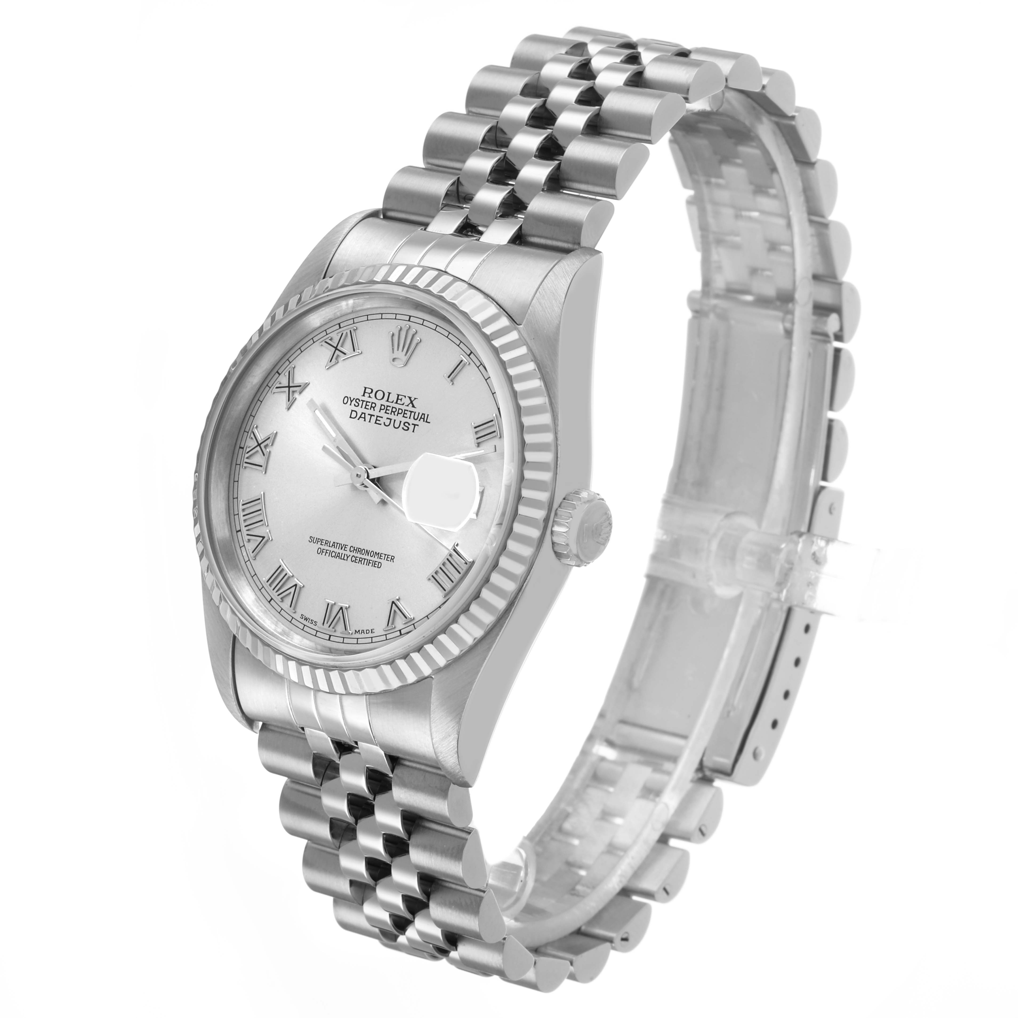 Rolex Datejust Steel White Gold Silver Roman Dial Mens Watch 16234. Officially certified chronometer automatic self-winding movement. Stainless steel oyster case 36.0 mm in diameter. Rolex logo on the crown. 18K white gold fluted bezel. Scratch resistant sapphire crystal with a cyclops magnifier. Silver dial with raised Roman numeral hour markers and baton hands. Date calendar at the 3 o'clock aperture. Outer minute marker track. Stainless steel jubilee bracelet with a foldover clasp. Fits a 7.5" wrist.