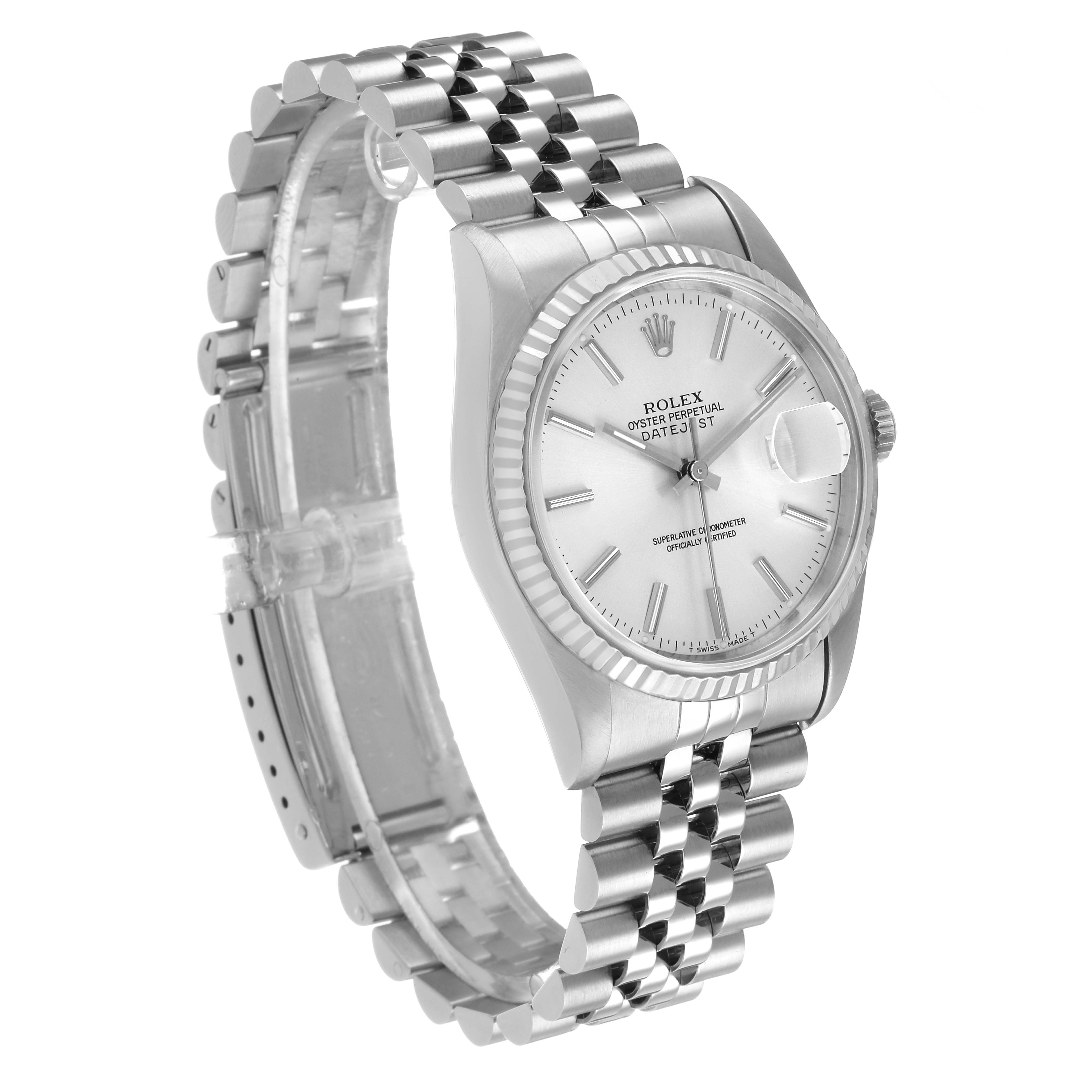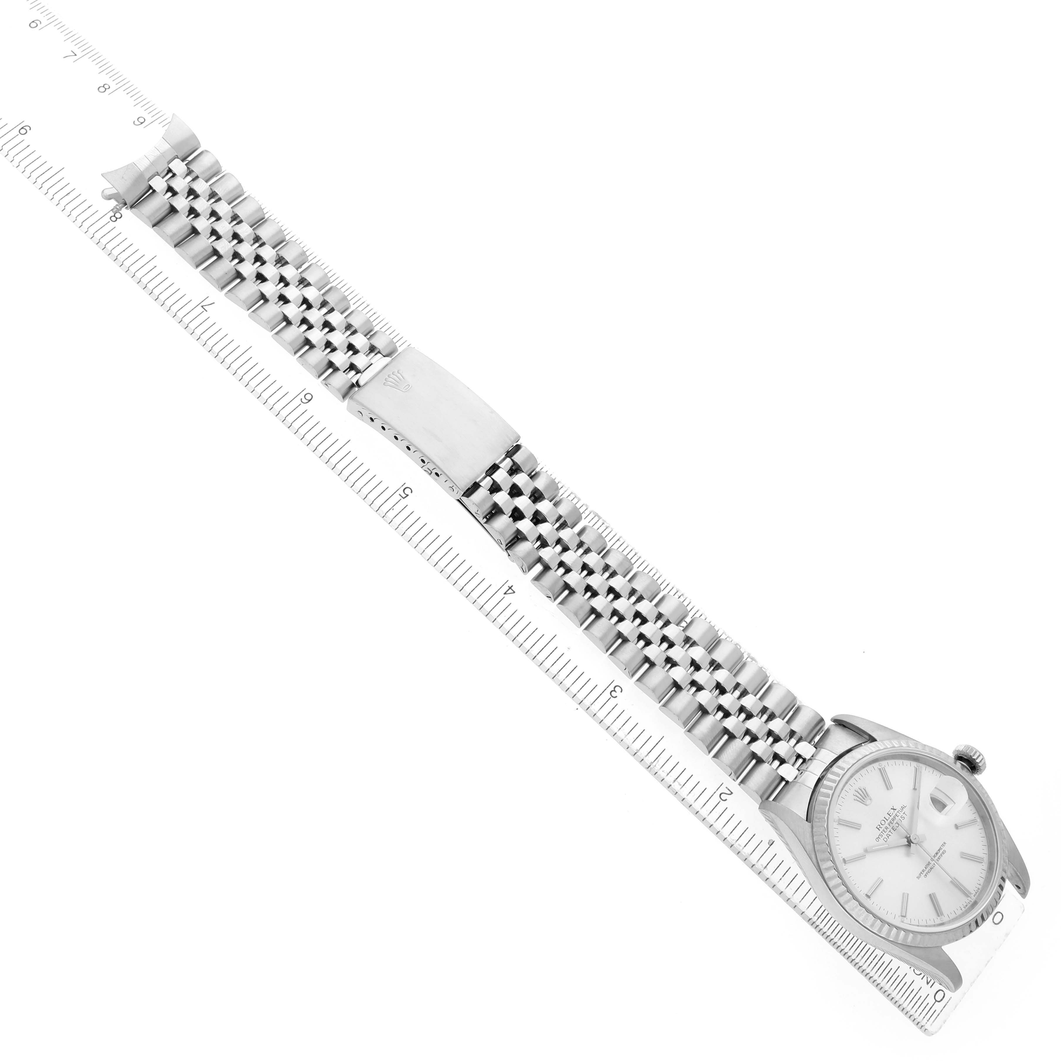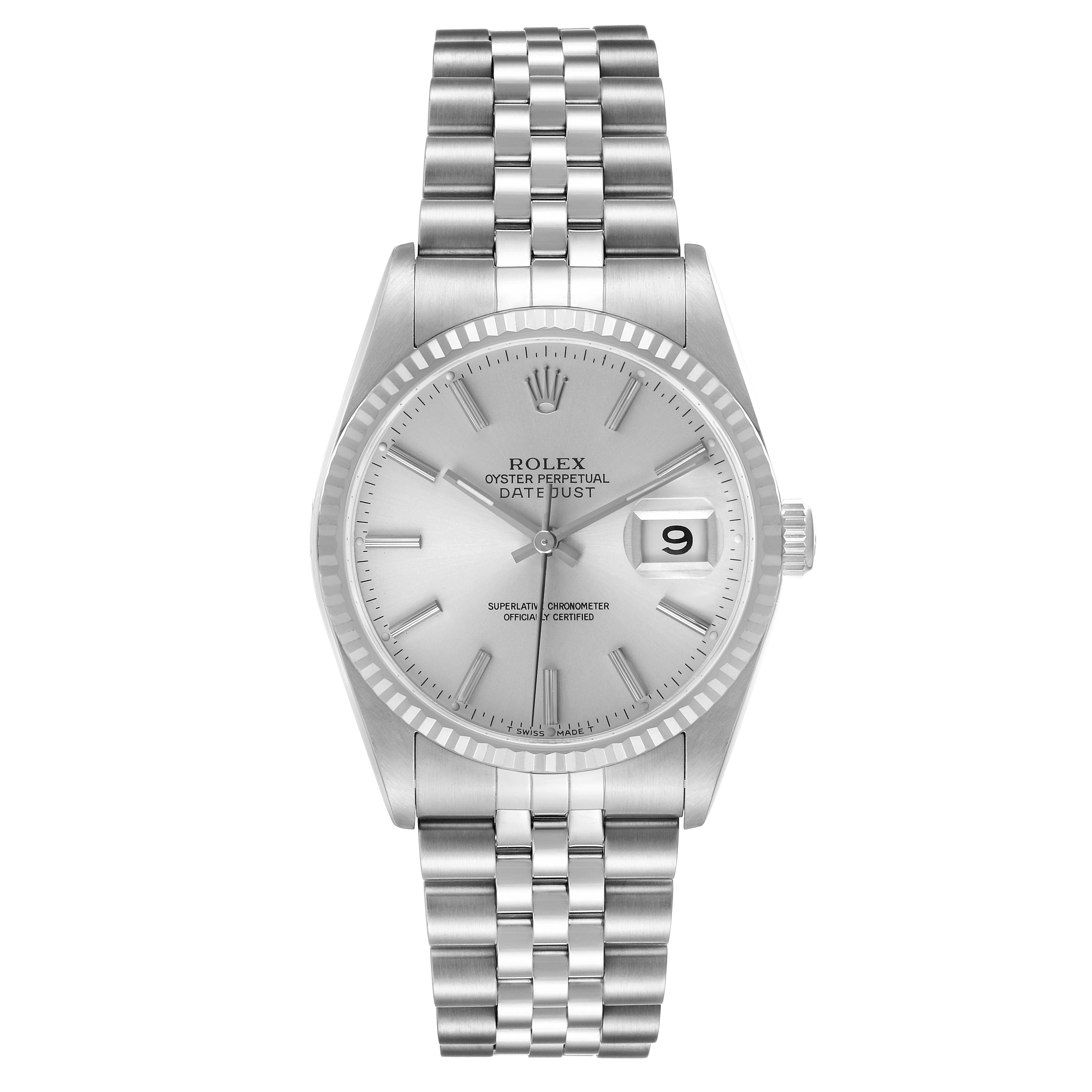Rolex Datejust Steel White Gold Silver Roman Dial Mens Watch 16234. Officially certified chronometer automatic self-winding movement. Stainless steel oyster case 36.0 mm in diameter. Rolex logo on the crown. 18K white gold fluted bezel. Scratch resistant sapphire crystal with a cyclops magnifier. Silver dial with white gold baton hour markers baton hands. Date calendar at the 3 o'clock aperture. Outer minute marker track. Stainless steel jubilee bracelet with a foldover clasp. Fits an 8" wrist.
