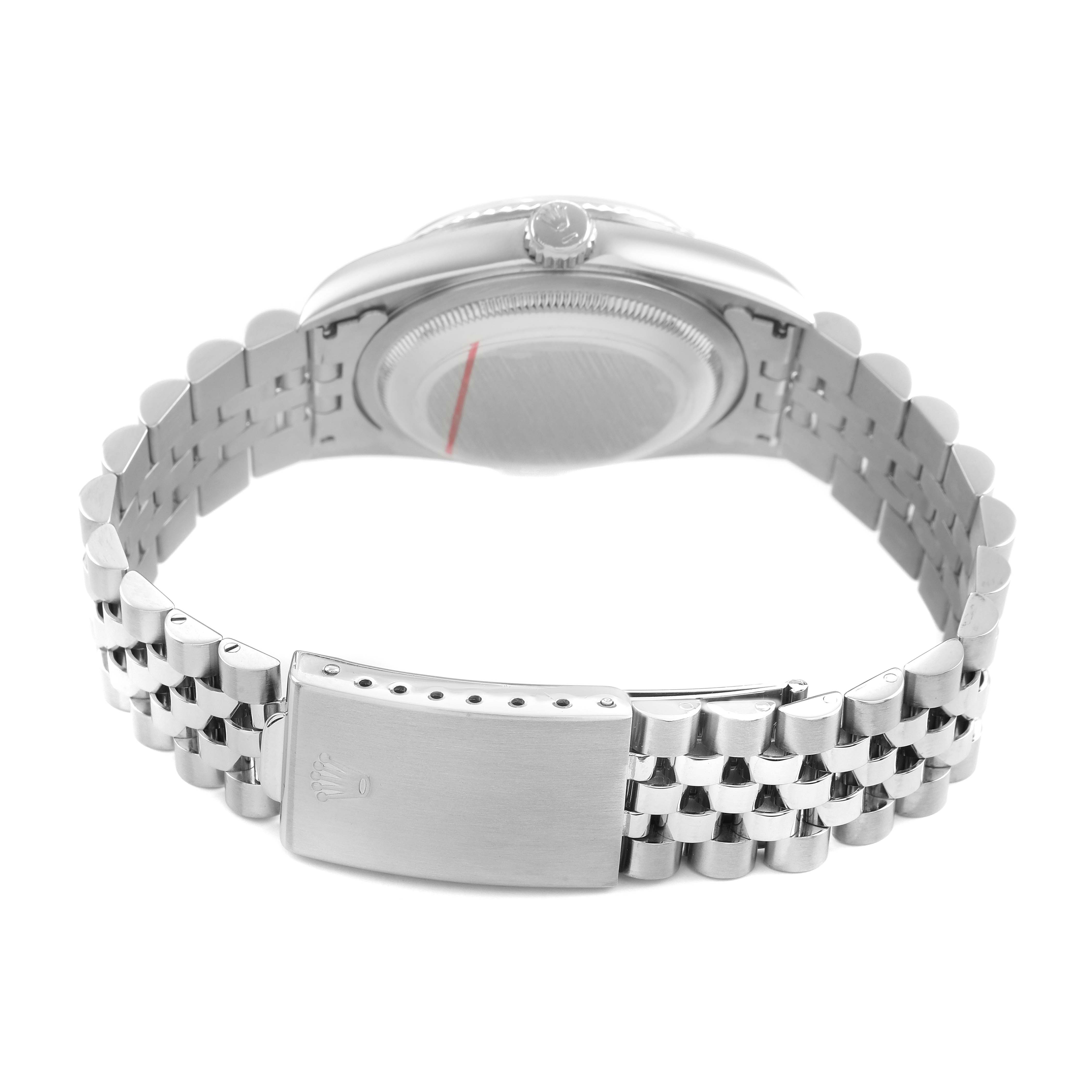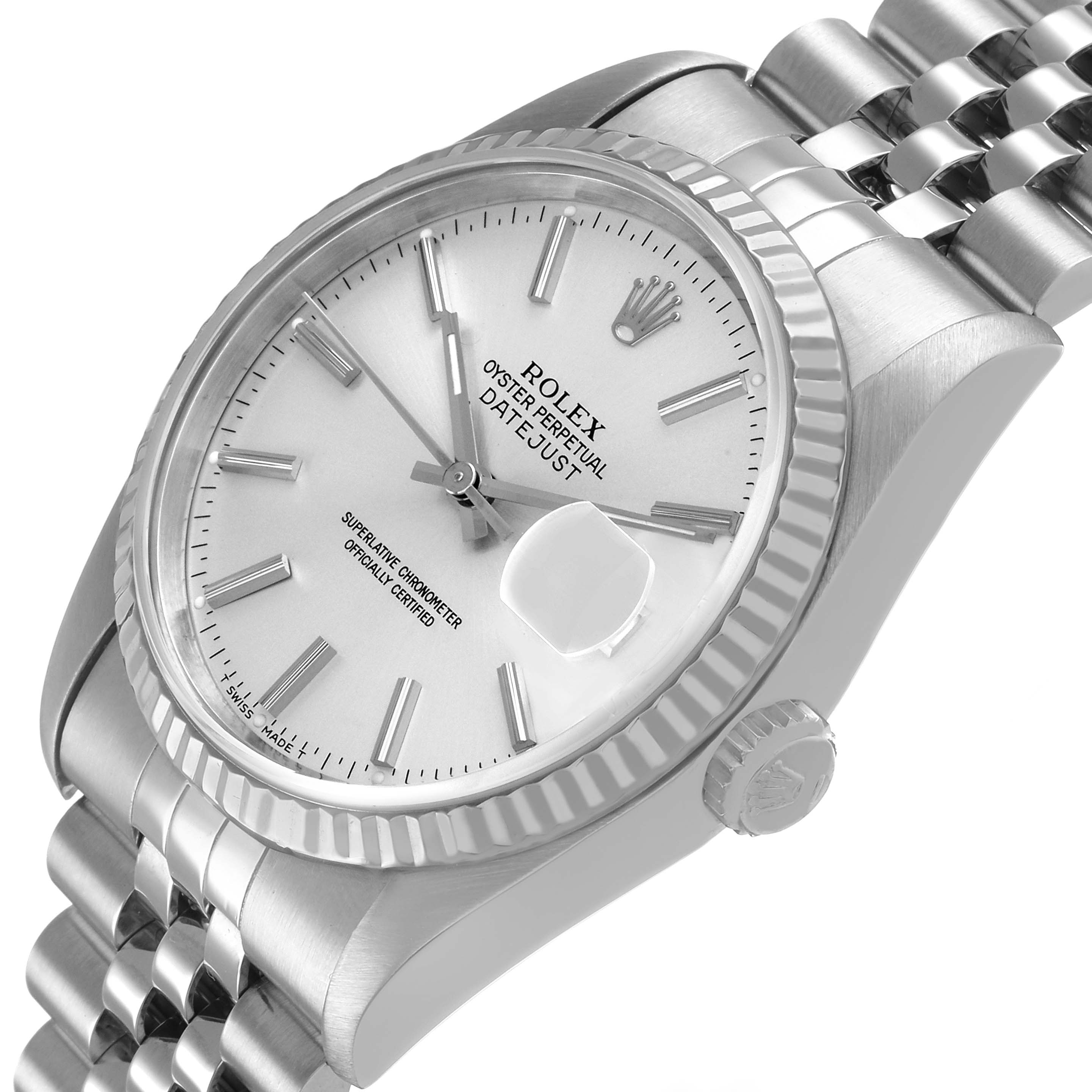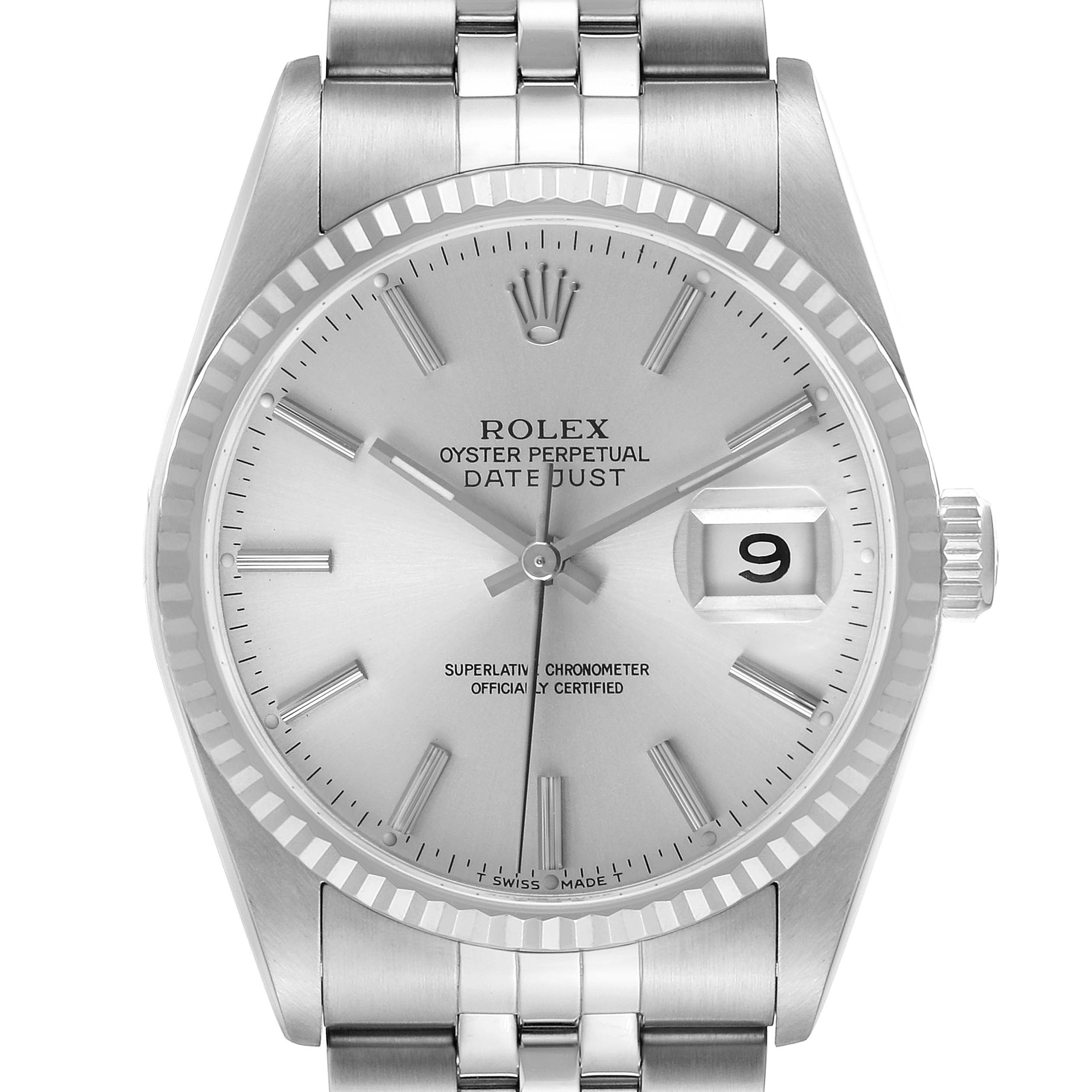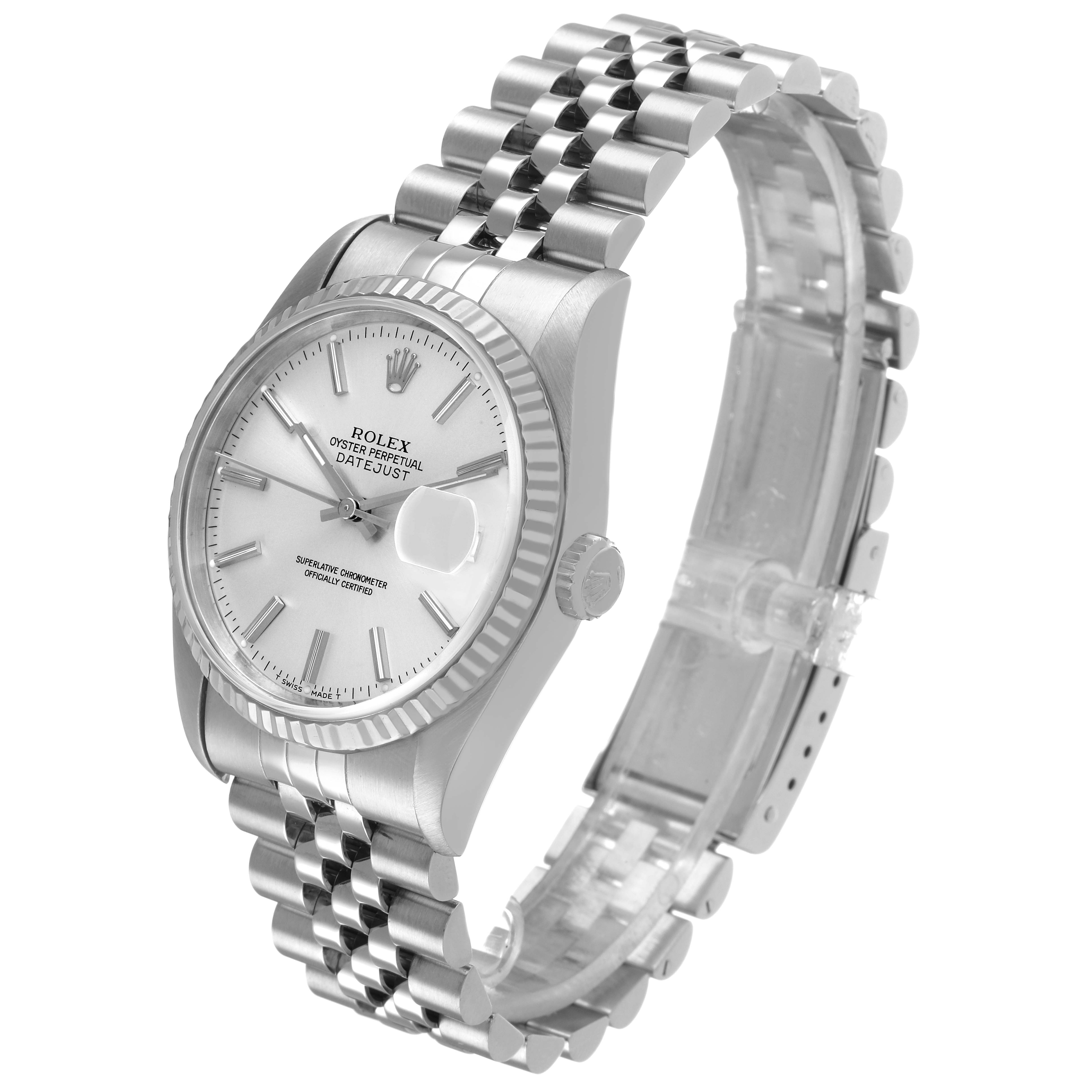 Rolex Datejust Steel White Gold Silver Roman Dial Mens Watch 16234. Officially certified chronometer automatic self-winding movement. Stainless steel oyster case 36.0 mm in diameter. Rolex logo on the crown. 18K white gold fluted bezel. Scratch resistant sapphire crystal with a cyclops magnifier. Silver dial with white gold baton hour markers baton hands. Date calendar at the 3 o'clock aperture. Outer minute marker track. Stainless steel jubilee bracelet with a foldover clasp. Fits an 8" wrist.