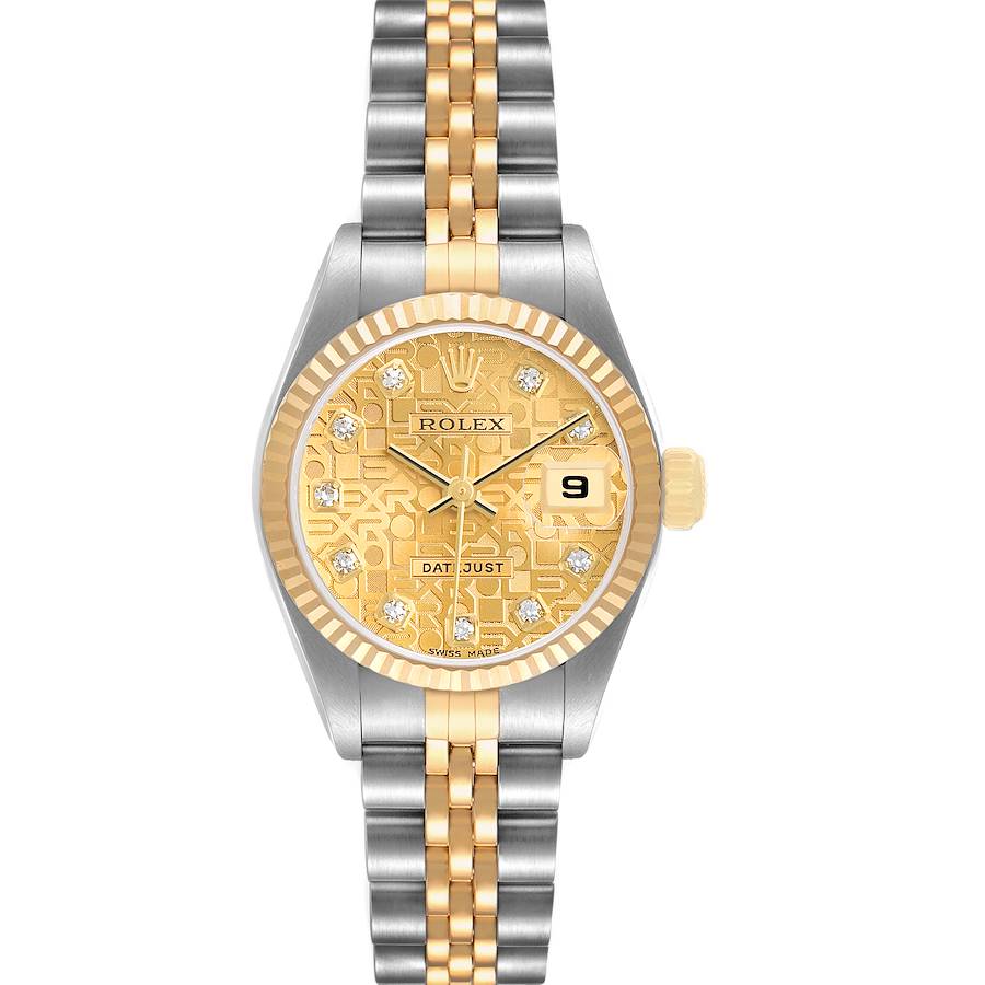 Rolex Datejust Steel Yellow Gold Anniversary Diamond Dial Ladies Watch 79173. Officially certified chronometer automatic self-winding movement. Stainless steel oyster case 26.0 mm in diameter. Rolex logo on an 18K yellow gold crown. 18k yellow gold fluted bezel. Scratch resistant sapphire crystal with cyclops magnifier. Champagne jubilee anniversary dial with original Rolex factory diamond hour markers and yellow gold baton hands. Date calendar at the 3 o'clock aperture. Stainless steel and 18k yellow gold jubilee bracelet with a fold over clasp. Fits a 6 1/2" wrist.