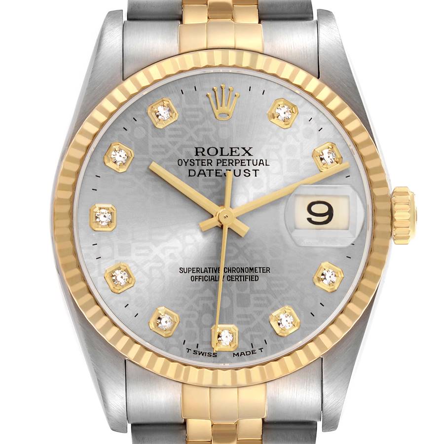 Rolex Datejust Steel Yellow Gold Anniversary Diamond Dial Mens Watch 16233. Officially certified chronometer automatic self-winding movement. Stainless steel oyster case 36.0 mm in diameter. Rolex logo on the 18K yellow gold crown. 18k yellow gold fluted bezel. Scratch resistant sapphire crystal with a cyclops magnifier. Grey anniversary dial with original Rolex factory diamond hour markers and yellow gold baton hands. Date calendar at the 3 o'clock aperture. Stainless steel and 18k yellow gold jubilee bracelet with a fold-over clasp. Fits up to a 7 1/4" wrist.