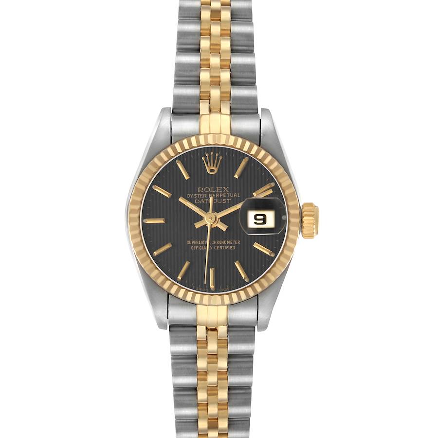 Rolex Datejust Steel Yellow Gold Black Tapestry Dial Ladies Watch 69173. Officially certified chronometer automatic self-winding movement. Stainless steel oyster case 26.0 mm in diameter. Rolex logo on the crown. 18k yellow gold fluted bezel. Scratch resistant sapphire crystal with cyclops magnifier. Black tapestry dial with yellow gold baton hour markers. Date calendar at 3 o'clock aperture. Stainless steel and 18k yellow gold jubilee bracelet with fold-over clasp. Fits 6 1/4" wrist.