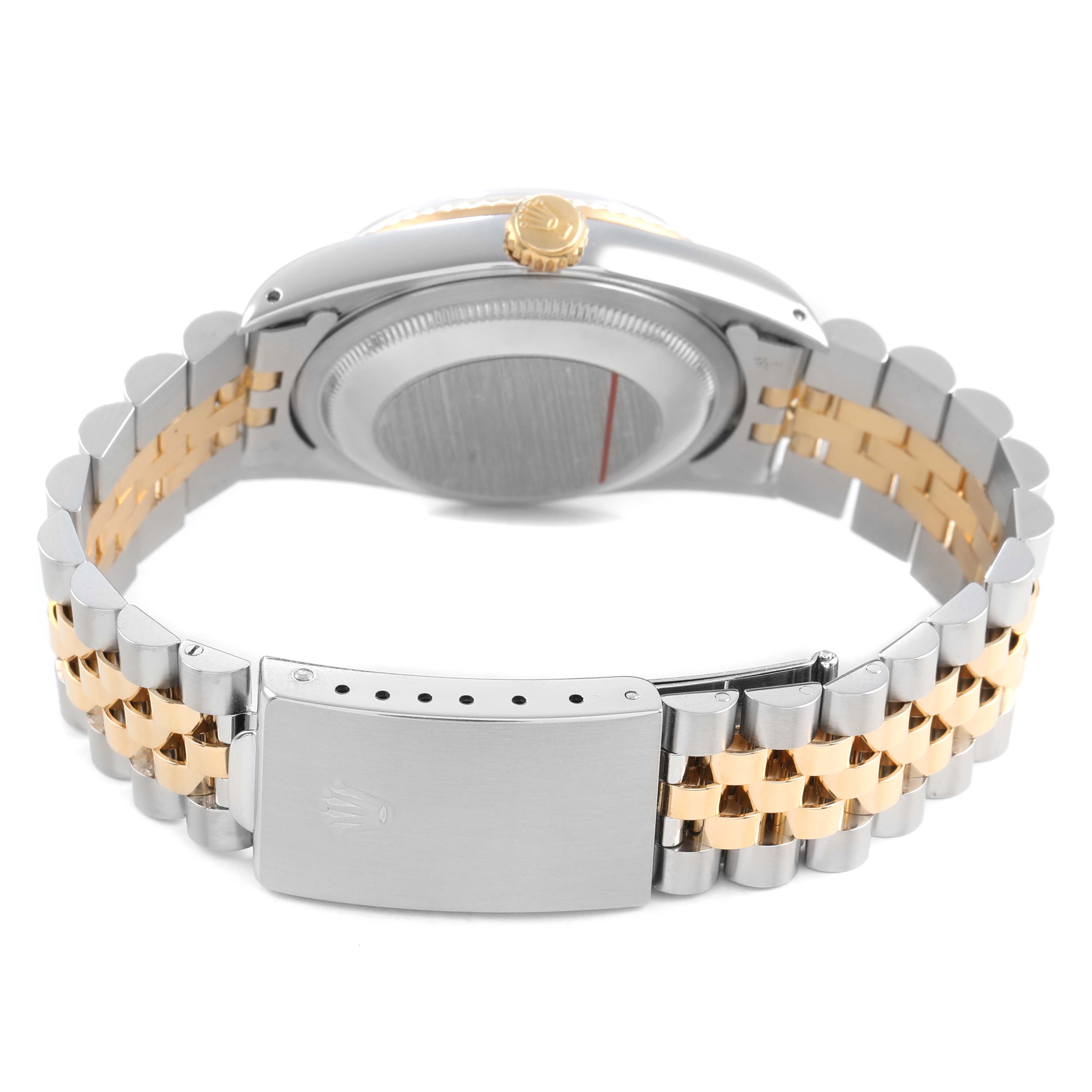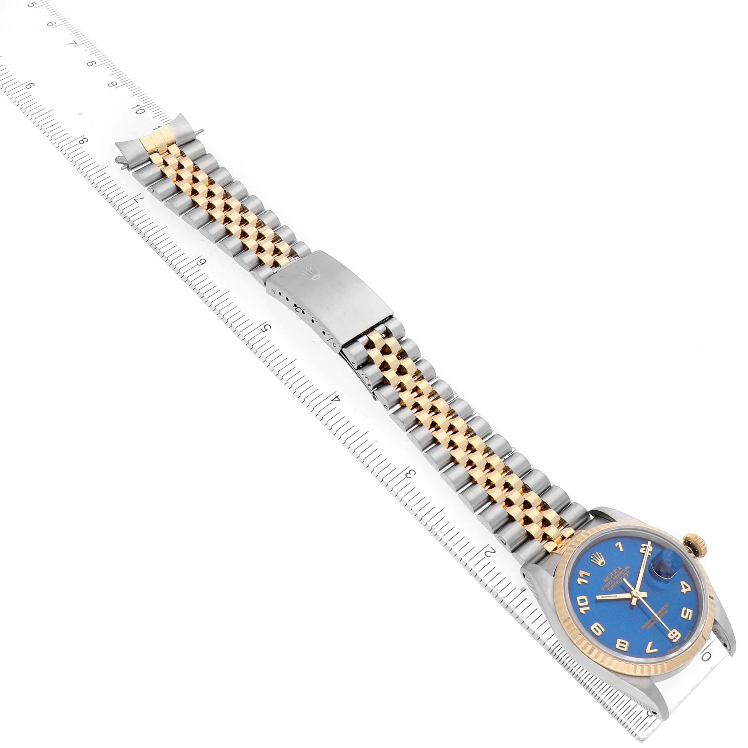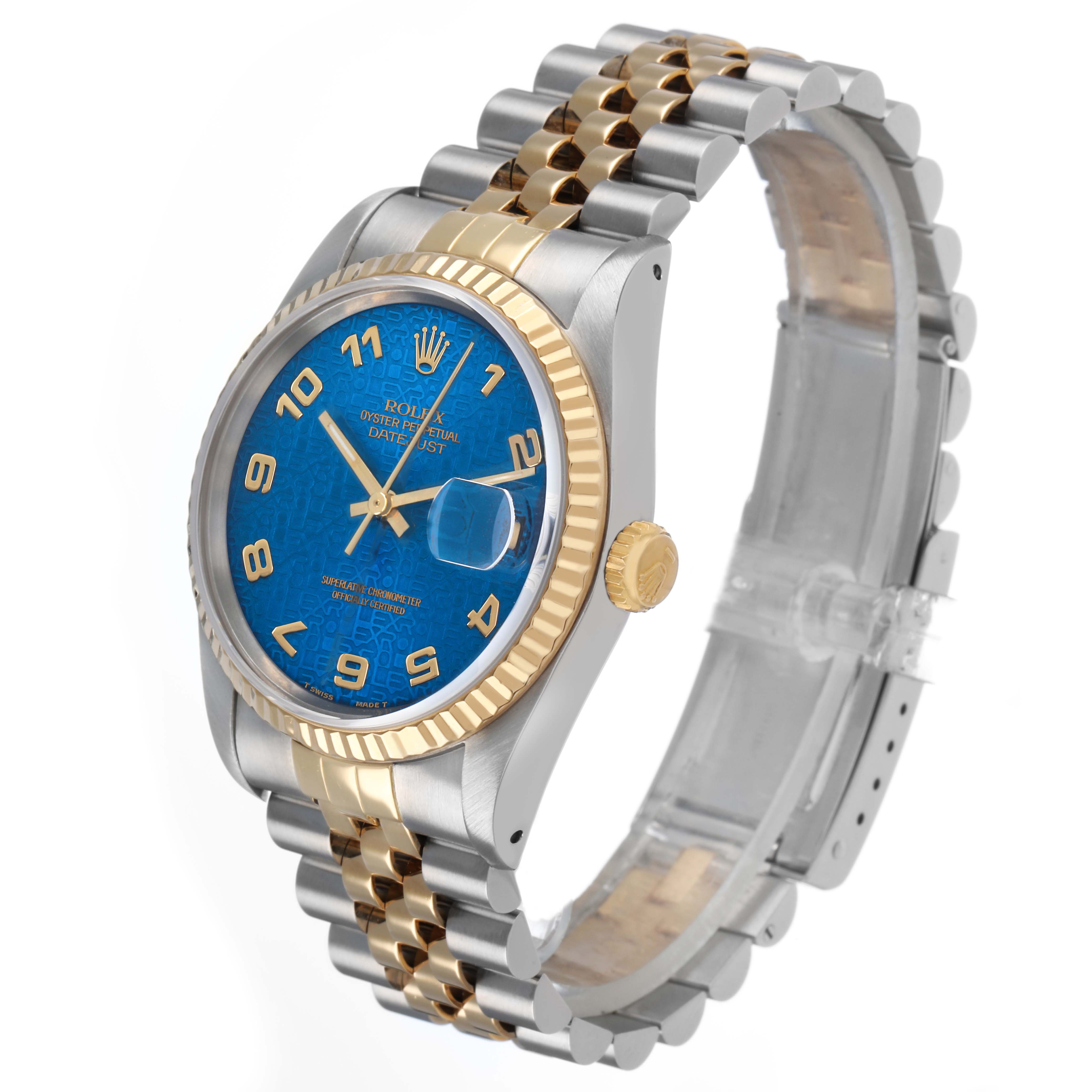 Rolex Datejust Steel Yellow Gold Blue Anniversary Dial Mens Watch 16233. Officially certified chronometer automatic self-winding movement. Stainless steel oyster case 36.0 mm in diameter. Rolex logo on the 18k yellow gold crown. 18k yellow gold fluted bezel. Scratch resistant sapphire crystal with a cyclops magnifier. Blue jubilee anniversary dial with raised 18K yellow gold Arabic hour markers and yellow gold baton hands. Date calendar at the 3 o'clock aperture. Stainless steel and 18k yellow gold jubilee bracelet with a hidden clasp. Fits a 7 1/4" wrist.