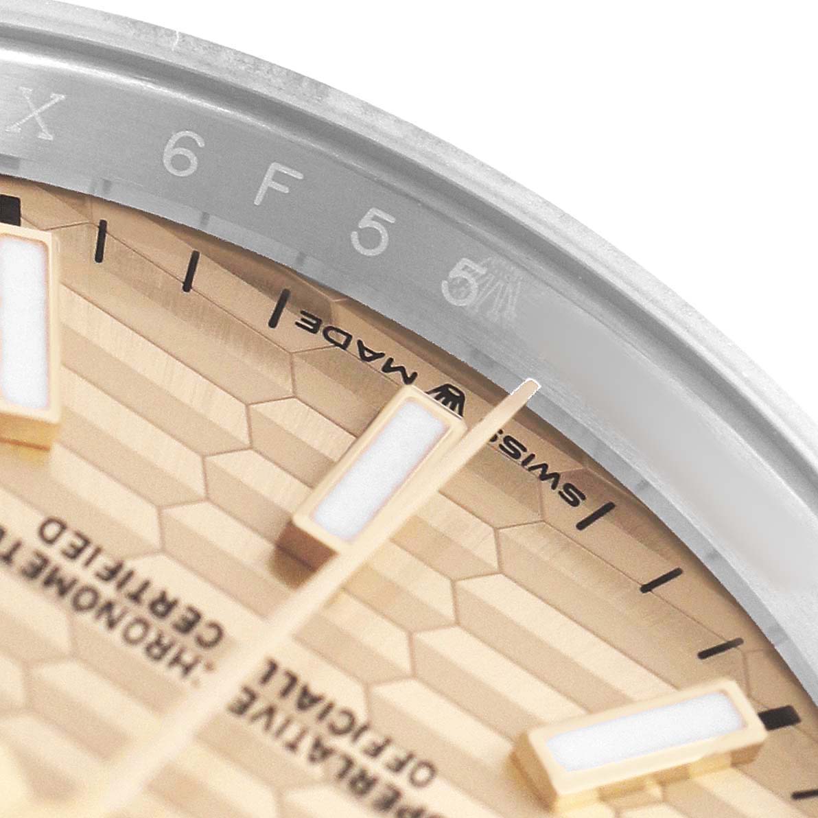 | Dial: | Fluted champagne dial with luminescent yellow gold hands and baton hour markers. Date window at 3 o'clock aperture. |