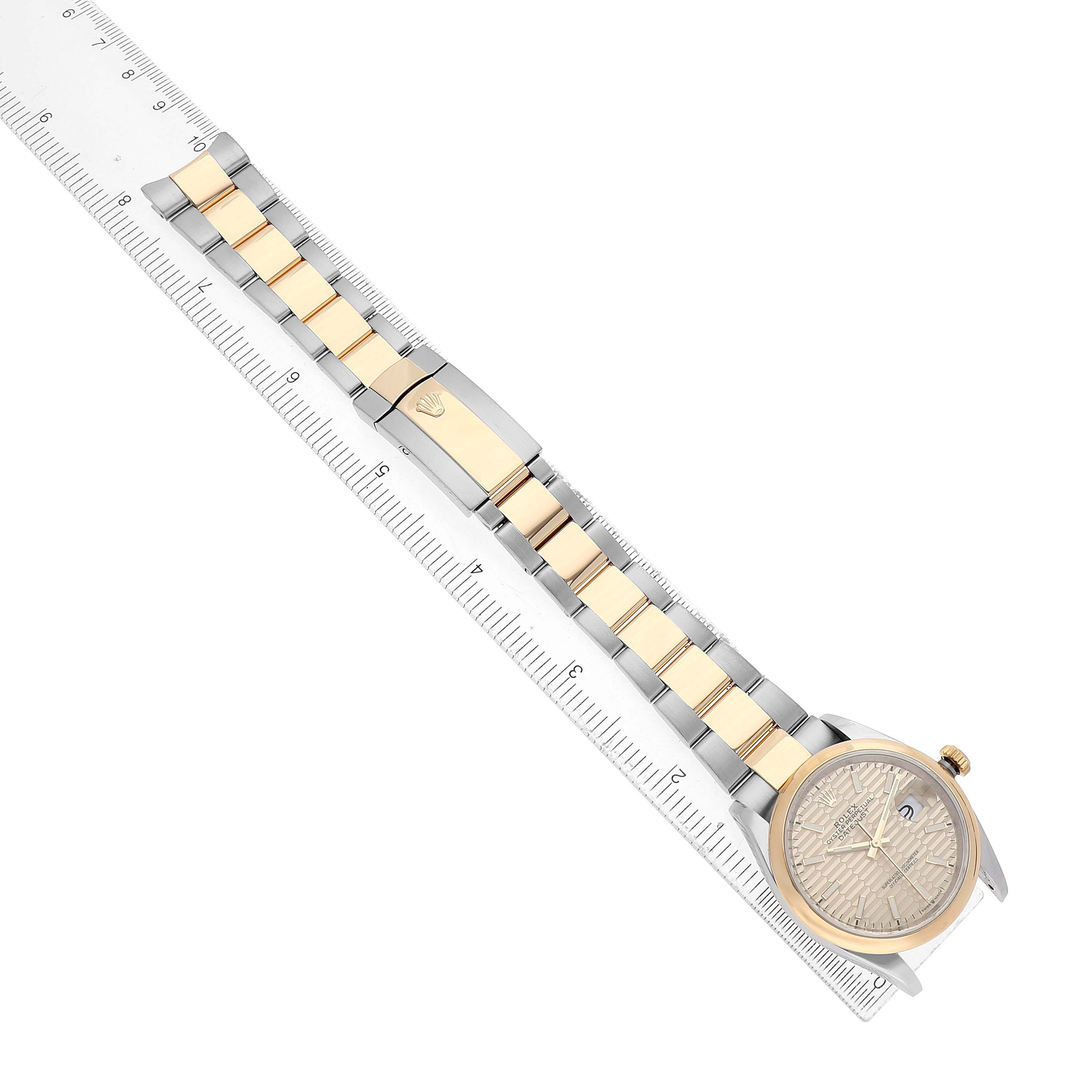 | Bracelet: | Stainless steel and 18k yellow gold oyster bracelet with Oysterlock clasp. Fits a 7 1/2" wrist. |