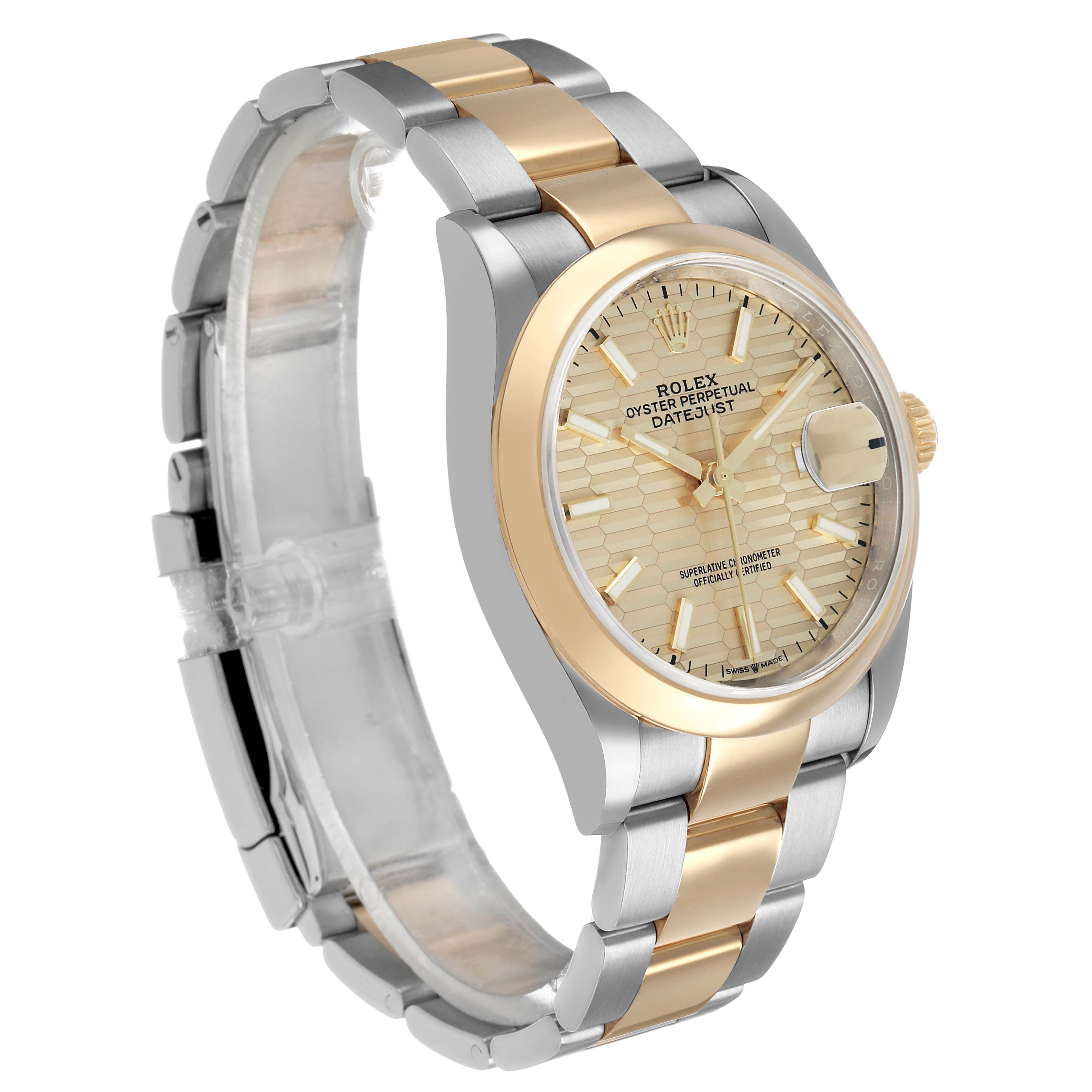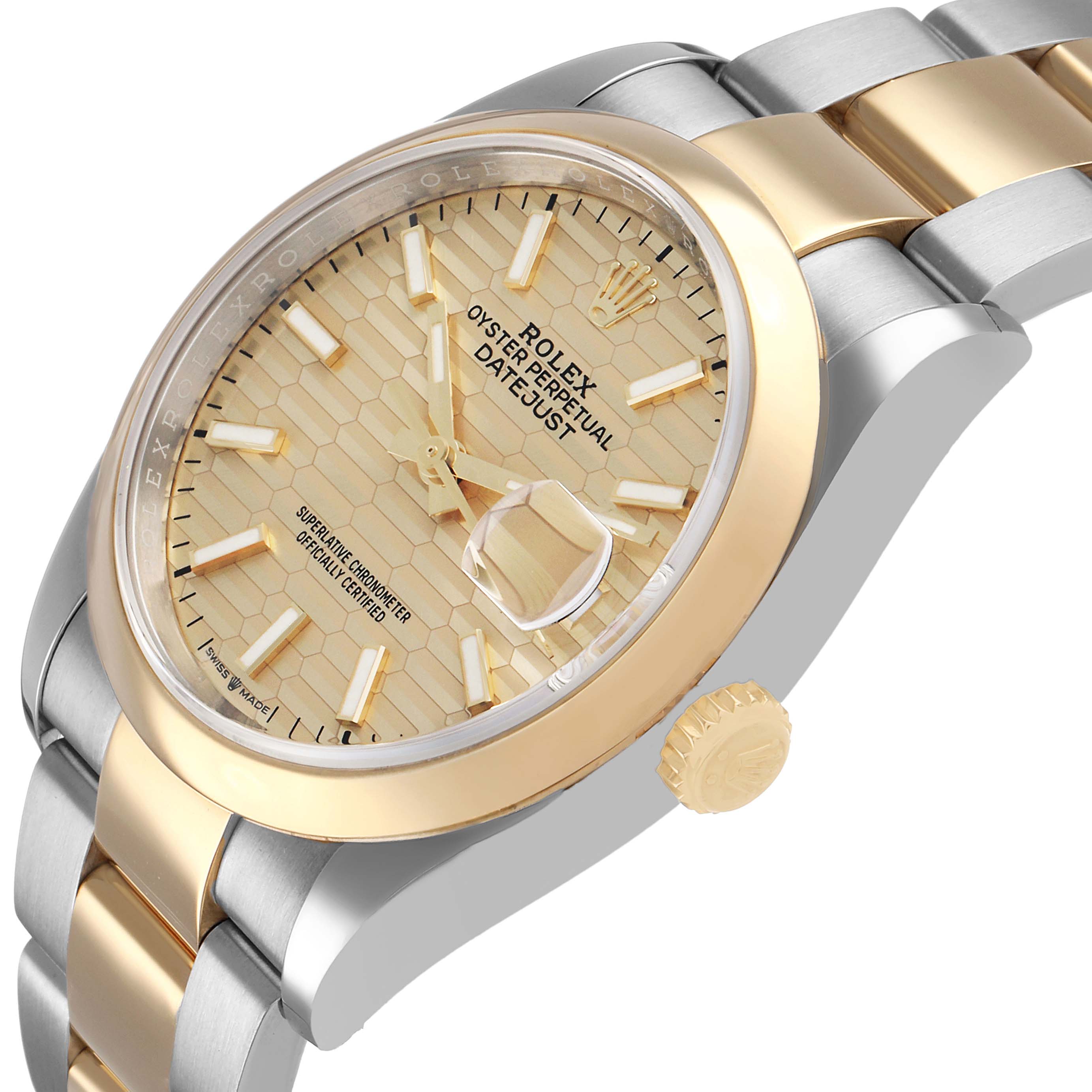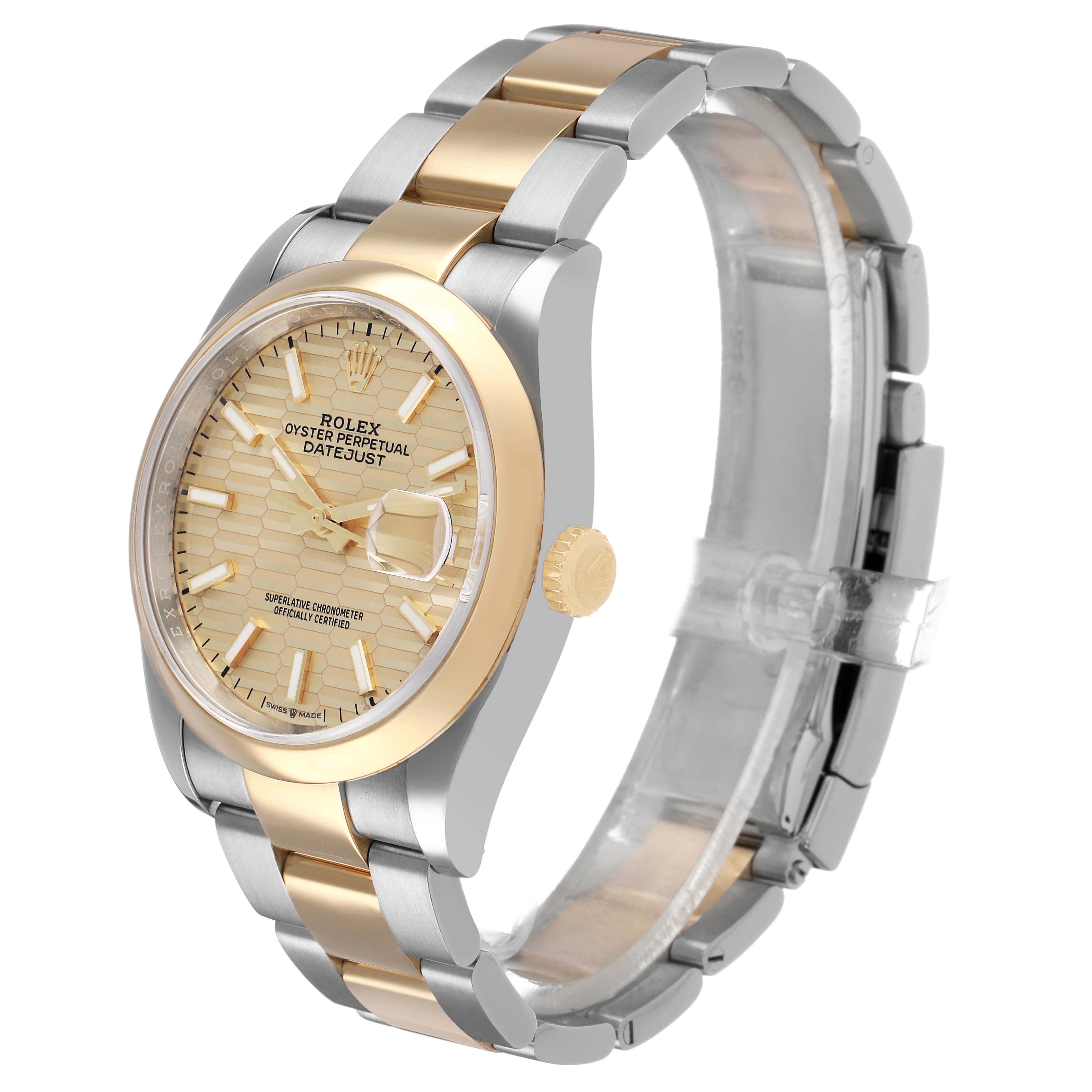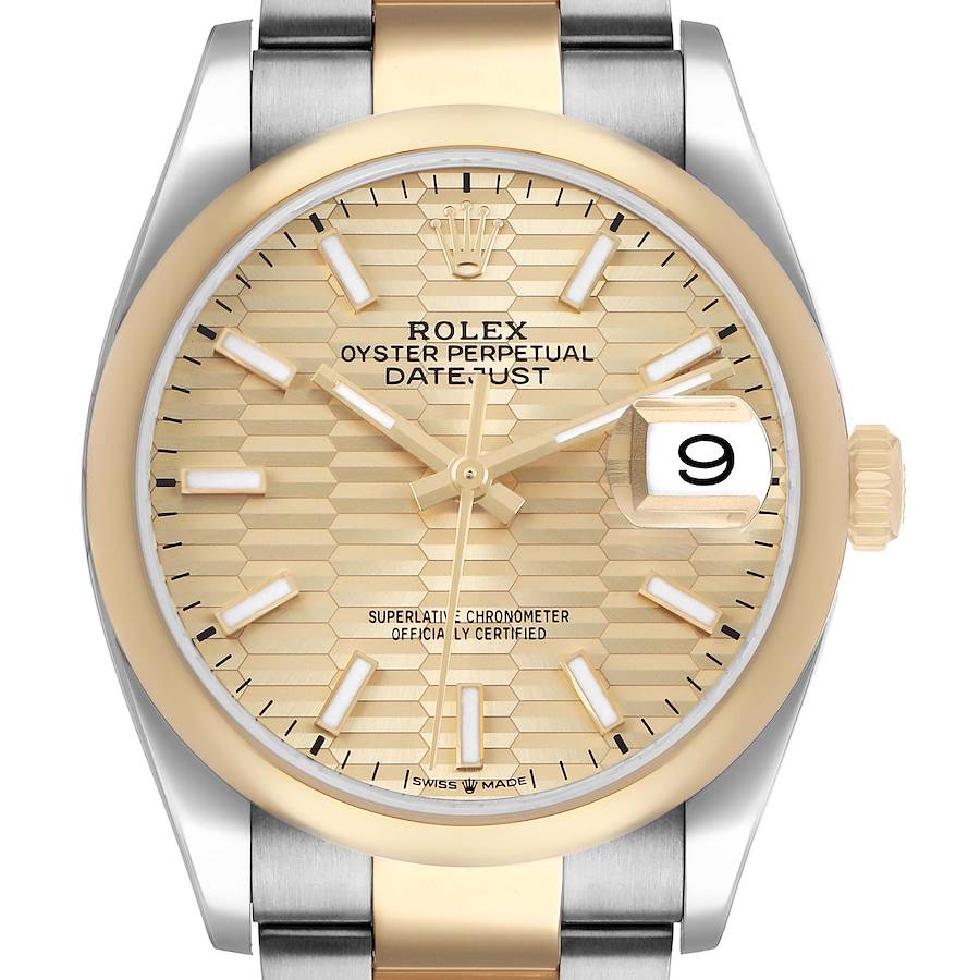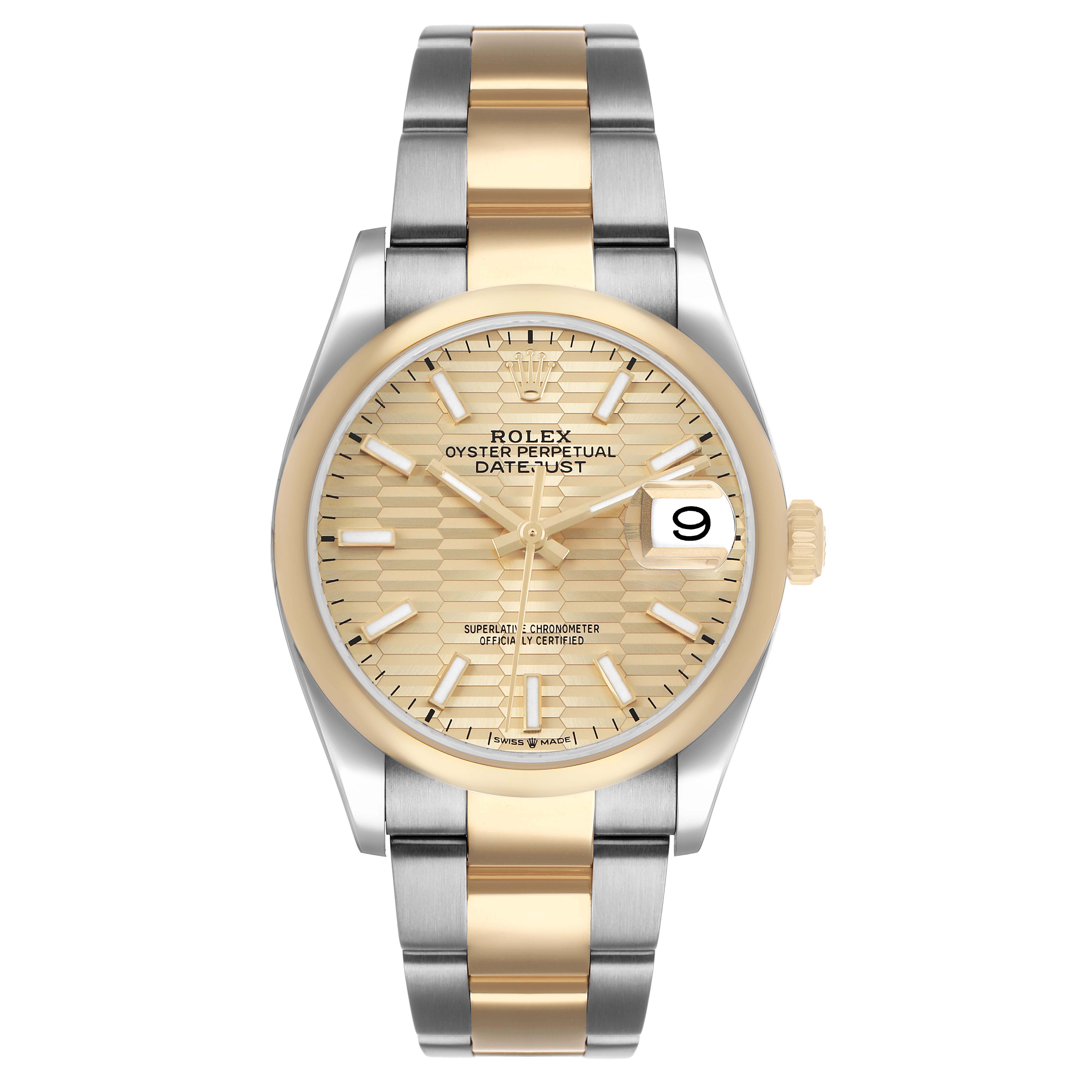 Rolex Datejust Steel Yellow Gold Champagne Dial Mens Watch 126203 Card. Officially certified chronometer automatic self-winding movement. Stainless steel case 36.0 mm in diameter. Rolex logo on an 18k yellow gold crown. 18k yellow gold smooth bezel. Scratch resistant sapphire crystal with cyclops magnifier. Fluted champagne dial with luminescent yellow gold hands and baton hour markers. Date window at 3 o'clock aperture. Stainless steel and 18k yellow gold oyster bracelet with Oysterlock clasp. Fits a 7 1/2" wrist.
