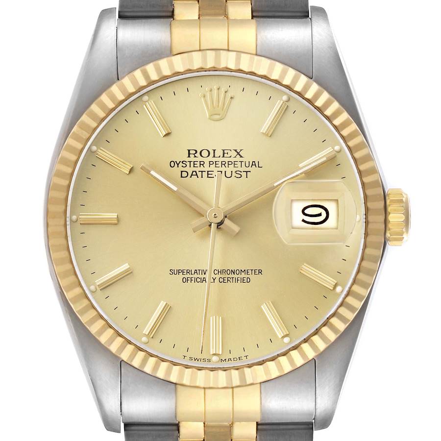 Rolex Datejust Steel Yellow Gold Champagne Dial Vintage Mens Watch 16013. Officially certified chronometer automatic self-winding movement. Stainless steel and 18k yellow gold oyster case 36.0 mm in diameter. Rolex logo on the 18k yellow gold crown. 18k yellow gold fluted bezel. Acrylic crystal with a cyclops magnifier. Champagne dial with yellow gold baton hour markers and luminescent-inlayed hands. Date calendar at the 3 o'clock aperture. Stainless steel and 18k yellow gold jubilee bracelet with a fold-over clasp. Fits a 7 1/2" wrist.