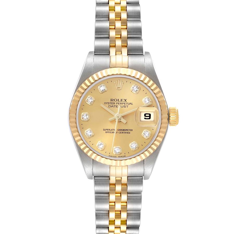 Rolex Datejust Steel Yellow Gold Champagne Diamond Dial Ladies Watch 79173. Officially certified chronometer automatic self-winding movement. Stainless steel oyster case 26.0 mm in diameter. Rolex logo on the 18K yellow gold crown. 18k yellow gold fluted bezel. Scratch resistant sapphire crystal with a cyclops magnifier. Champagne dial with original Rolex factory diamond hour markers. Date calendar at the 3 o'clock aperture. Stainless steel and 18k yellow gold jubilee bracelet with a fold-over clasp. Fits a 6 1/4" wrist.