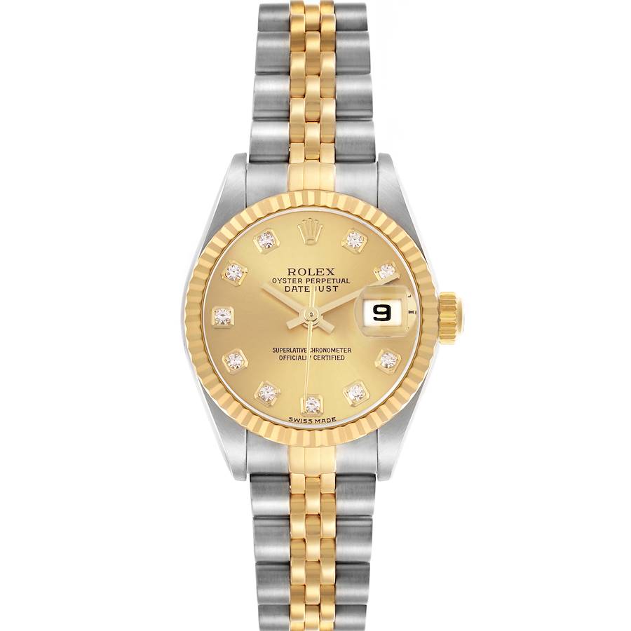 Rolex Datejust Steel Yellow Gold Champagne Diamond Dial Ladies Watch 79173 Papers. Officially certified chronometer automatic self-winding movement. Stainless steel oyster case 26.0 mm in diameter. Rolex logo on the 18K yellow gold crown. 18k yellow gold fluted bezel. Scratch resistant sapphire crystal with a cyclops magnifier. Champagne dial with original Rolex factory diamond hour markers. Date calendar at the 3 o'clock aperture. Stainless steel and 18k yellow gold jubilee bracelet with a fold-over clasp. Fits a 6 1/4" wrist.