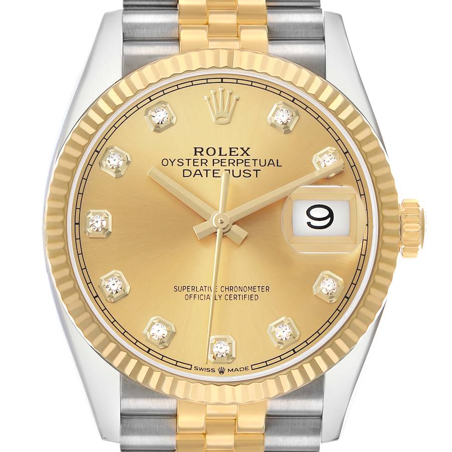 Rolex Datejust Steel Yellow Gold Champagne Diamond Dial Mens Watch 126233. Officially certified chronometer automatic self-winding movement. Stainless steel and 18K yellow gold case 36.0 mm in diameter. Rolex logo on the crown. 18K yellow gold fluted bezel. Scratch resistant sapphire crystal with cyclops magnifier. Champagne dial with original Rolex factory diamond hour markers. Date window at 3 o'clock aperture. Stainless steel 18K yellow gold jubilee bracelet with an oysterlock clasp. Fits up to 7.5" wrist.