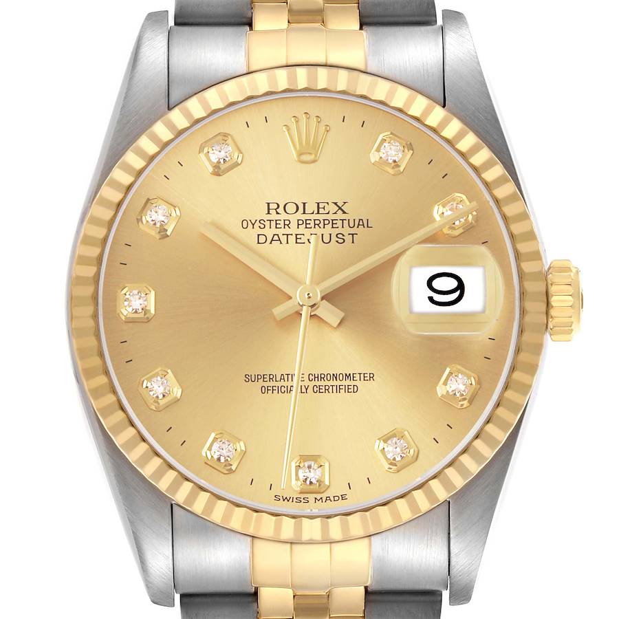 Rolex Datejust Steel Yellow Gold Champagne Diamond Dial Mens Watch 16233. Officially certified chronometer automatic self-winding movement. Stainless steel oyster case 36.0 mm in diameter. Rolex logo on the 18k yellow gold crown. 18k yellow gold fluted bezel. Scratch resistant sapphire crystal with a cyclops magnifier. Champagne dial with original Rolex factory diamond hour markers and luminescent yellow gold baton hands. Date calendar at the 3 o'clock aperture. Stainless steel and 18k yellow gold jubilee bracelet with a fold-over clasp. Fits a 7 1/4" wrist.