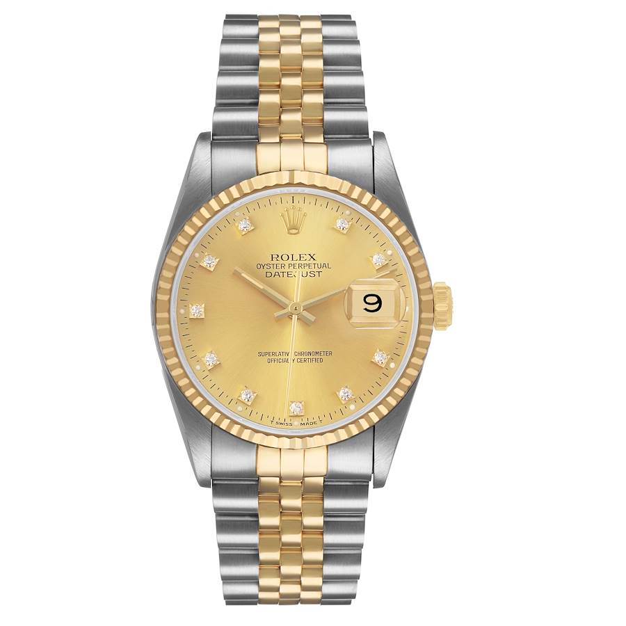 Rolex Datejust Steel Yellow Gold Champagne Diamond Dial Mens Watch 16233. Officially certified chronometer automatic self-winding movement. Stainless steel oyster case 36.0 mm in diameter. Rolex logo on the 18k yellow gold crown. 18k yellow gold fluted bezel. Scratch resistant sapphire crystal with a cyclops magnifier. Champagne dial with original Rolex factory diamond hour markers and luminescent yellow gold baton hands. Date calendar at the 3 o'clock aperture. Stainless steel and 18k yellow gold jubilee bracelet with a folding clasp. Fits a 7 3/4" wrist.