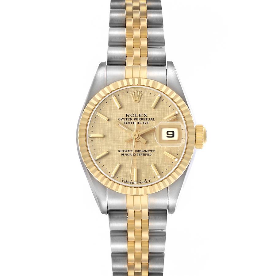 Rolex Datejust Steel Yellow Gold Champagne Linen Dial Ladies Watch 79173. Officially certified chronometer automatic self-winding movement. Stainless steel oyster case 26.0 mm in diameter. Rolex logo on the 18K yellow gold crown. 18k yellow gold fluted bezel. Scratch resistant sapphire crystal with cyclops magnifier. Champagne linen dial with yellow gold baton hour markers and hands. Date calendar at the 3 o'clock aperture. Stainless steel and 18k yellow gold jubilee bracelet with a fold-over clasp. Fits a 6.5" wrist.
