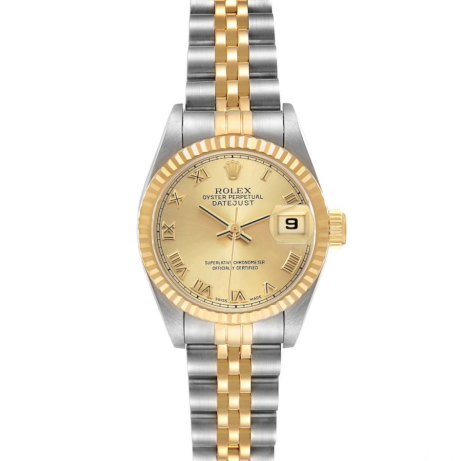 Rolex Datejust Steel Yellow Gold Champagne Roman Dial Ladies Watch 69173. Officially certified chronometer automatic self-winding movement. Stainless steel oyster case 26.0 mm in diameter. Rolex logo on the 18k yellow gold crown. 18k yellow gold fluted bezel. Scratch-resistant sapphire crystal with a cyclops magnifier. Champagne dial with yellow gold raised Roman numeral hour markers and baton hands. Date calendar at the 3 o'clock aperture. Stainless steel and 18k yellow gold jubilee bracelet with a folding clasp. Fits a 6.5" wrist.