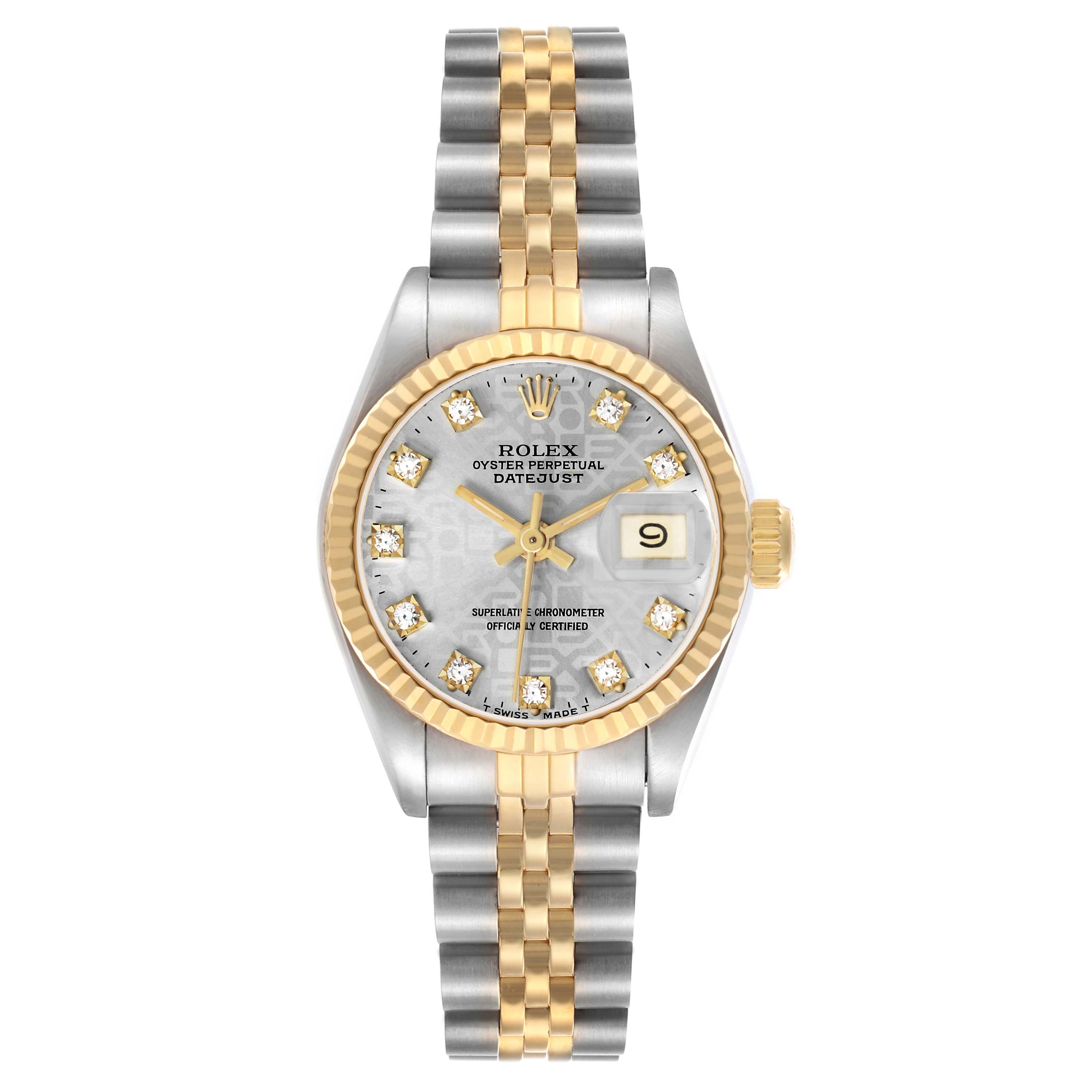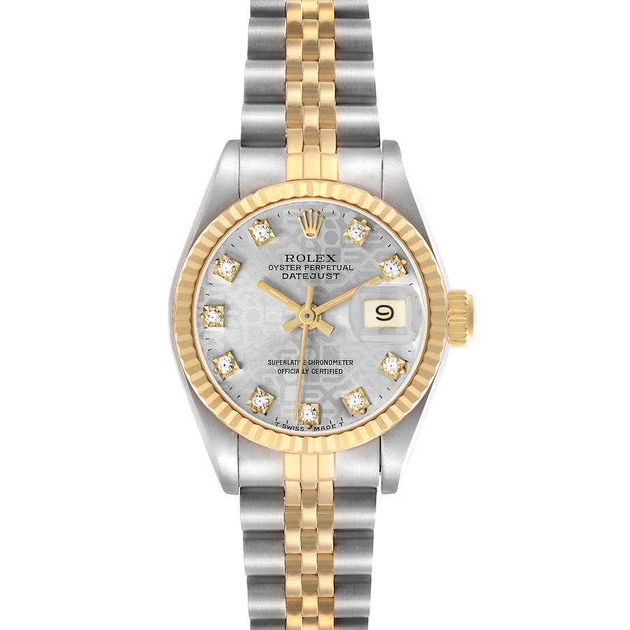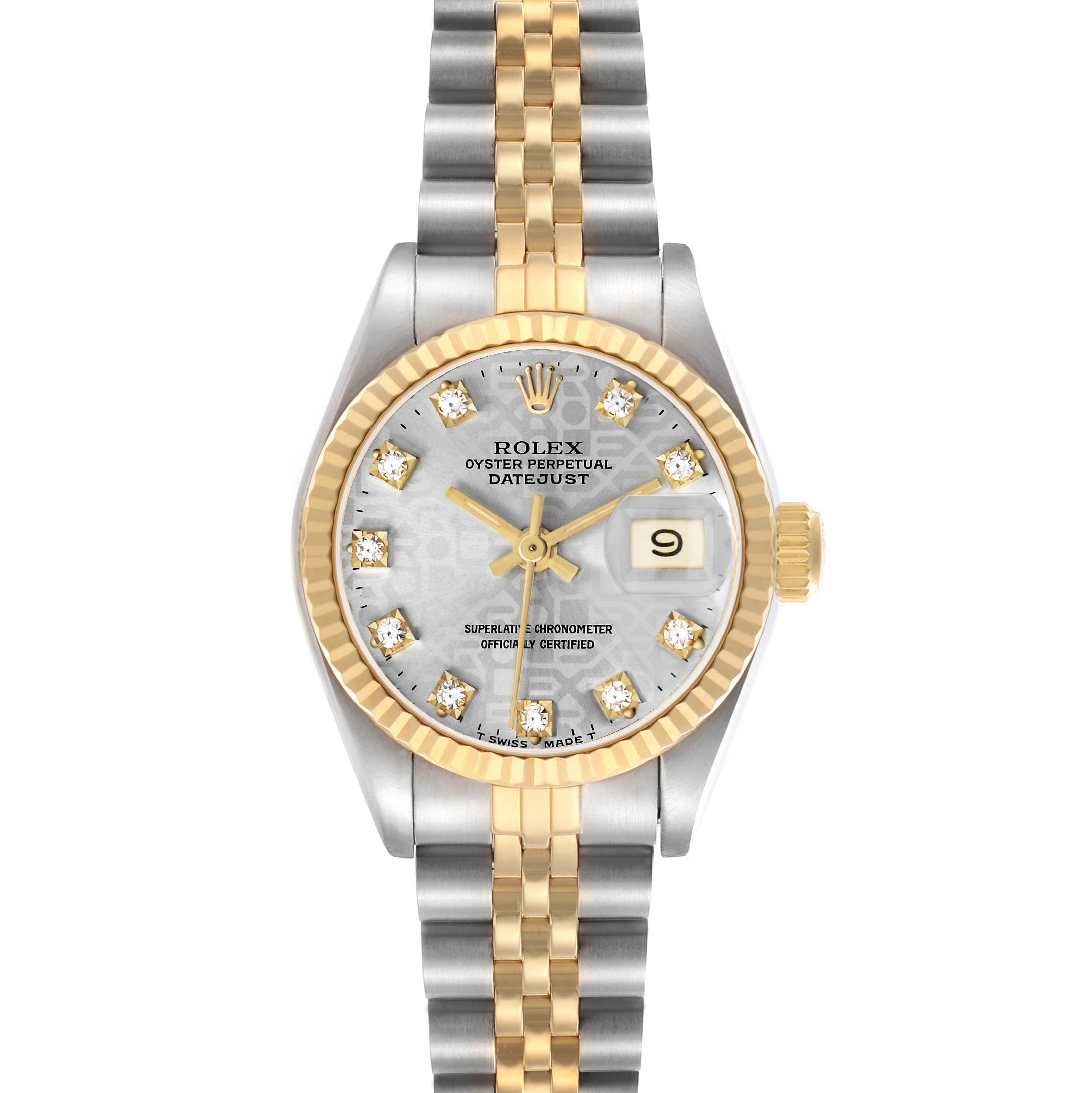 Rolex Datejust Steel Yellow Gold Diamond Ladies Watch 69173. Officially certified chronometer automatic self-winding movement. Stainless steel and 18k yellow gold oyster case 26.0 mm in diameter. Rolex logo on the 18k yellow gold crown. 18k yellow gold fluted bezel. Scratch resistant sapphire crystal with a cyclops magnifier. Silver jubilee anniversary dial with original Rolex factory hour markers and yellow gold baton hands. Date calendar at the 3 o'clock aperture. Stainless steel and 18k yellow gold jubilee bracelet with a fold-over clasp. Fits a 6.5" wrist.