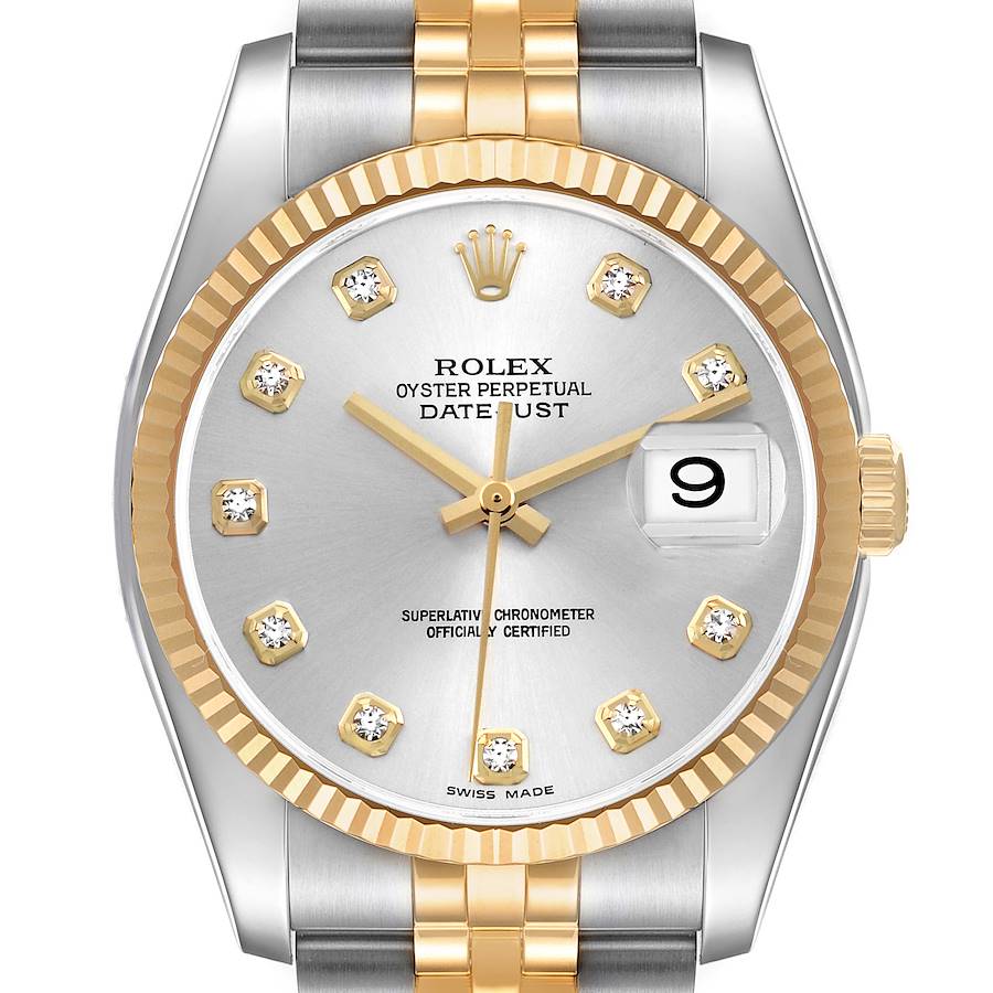 Rolex Datejust Steel Yellow Gold Diamond Silver Dial Mens Watch 116233. Officially certified chronometer automatic self-winding movement. Stainless steel oyster case 36.0 mm in diameter. Rolex logo on the 18k yellow gold crown. 18k yellow gold fluted bezel. Scratch resistant sapphire crystal with a cyclops magnifier. Silver dial with original Rolex factory diamond hour markers and yellow gold baton hands. Date calendar at the 3 o'clock aperture. Stainless steel and 18k yellow gold jubilee bracelet with a hidden clasp. Fits a 7" wrist.