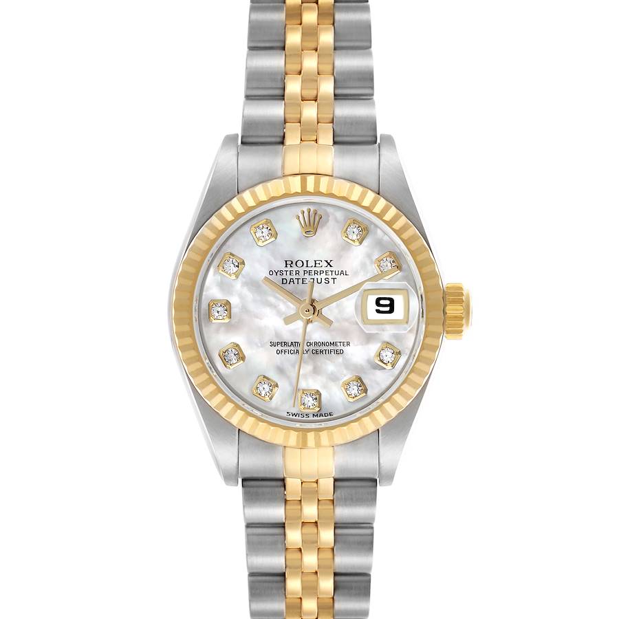 Rolex Datejust Steel Yellow Gold MOP Diamond Dial Ladies Watch 79173 Papers. Officially certified chronometer automatic self-winding movement. Stainless steel oyster case 26.0 mm in diameter. Rolex logo on the 18K yellow gold crown. 18k yellow gold fluted bezel. Scratch resistant sapphire crystal with cyclops magnifier. Mother-of-pearl dial with original Rolex factory diamond hour markers. Date calendar at the 3 o'clock aperture. Stainless steel and 18k yellow gold jubilee bracelet with a fold-over clasp. Fits a 6.5" wrist.
