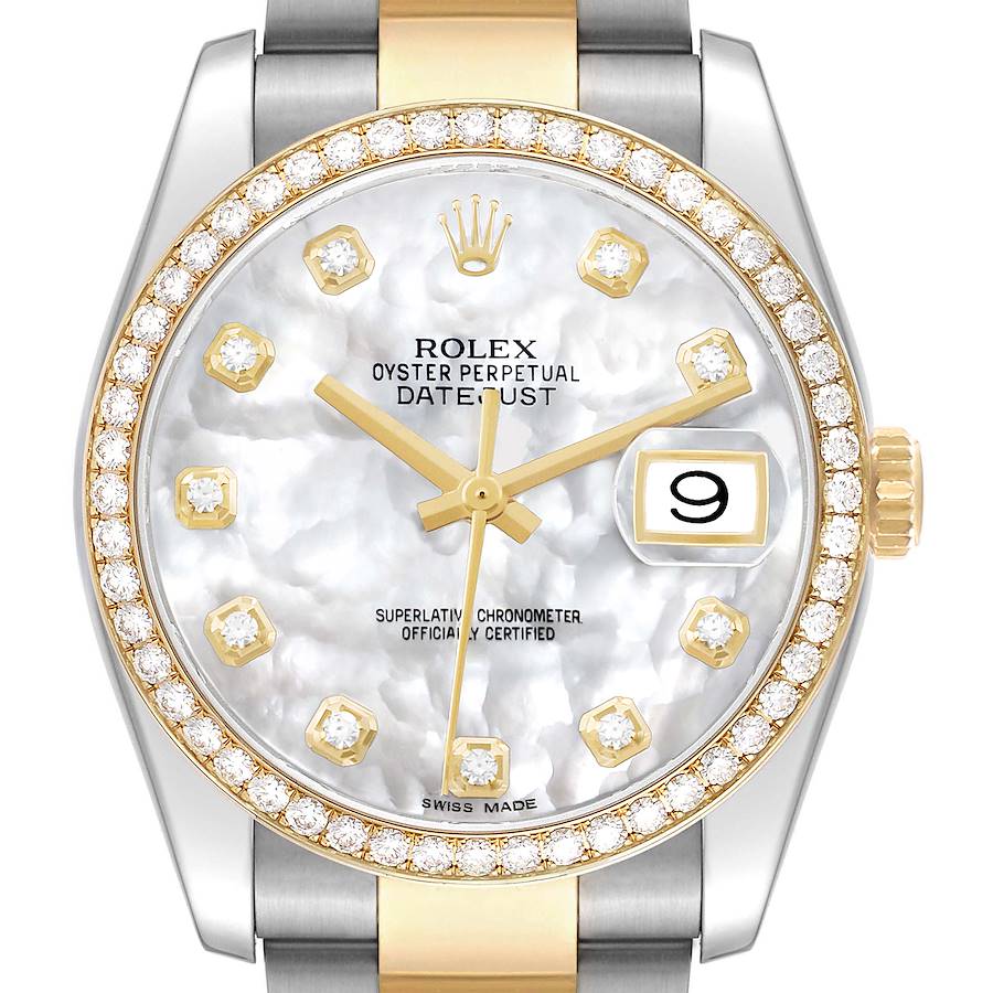 Rolex Datejust Steel Yellow Gold Mother of Pearl Diamond Mens Watch 116243. Officially certified chronometer automatic self-winding movement. Stainless steel oyster case 36.0 mm in diameter. Rolex logo on an 18k yellow gold crown. 18k yellow gold original Rolex factory diamond set bezel. Scratch resistant sapphire crystal with cyclops magnifier. Mother-of-pearl dial with original Rolex factory diamond hour markers and yellow gold baton hands. Date window at the 3 o'clock aperture. Stainless steel and 18k yellow gold oyster bracelet with hidden clasp. Fits a 7 1/4" wrist.
