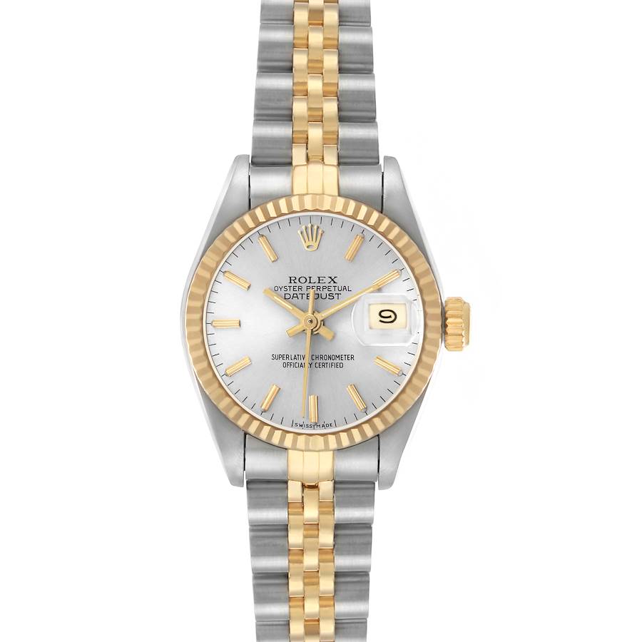 Rolex Datejust Steel Yellow Gold Silver Dial Ladies Watch 69173. Officially certified chronometer automatic self-winding movement. Stainless steel oyster case 26.0 mm in diameter. Rolex logo on the 18k yellow gold crown. 18k yellow gold fluted bezel. Scratch resistant sapphire crystal with a cyclops magnifier. Silver dial with yellow gold baton hour markers and yellow gold baton hands. Date calendar at the 3 o'clock aperture. Stainless steel and 18k yellow gold jubilee bracelet with a fold-over clasp. Fits a 6 1/4" wrist.