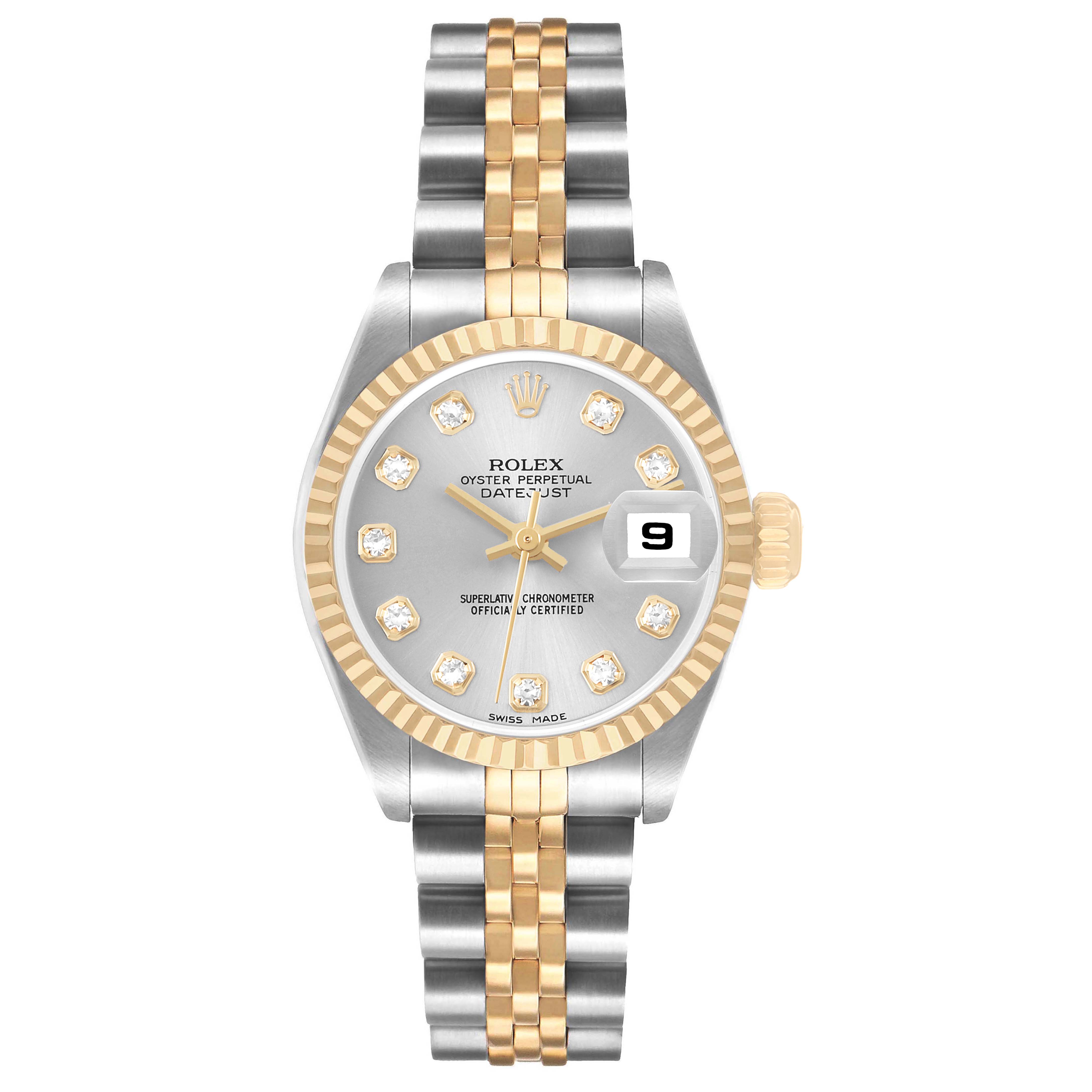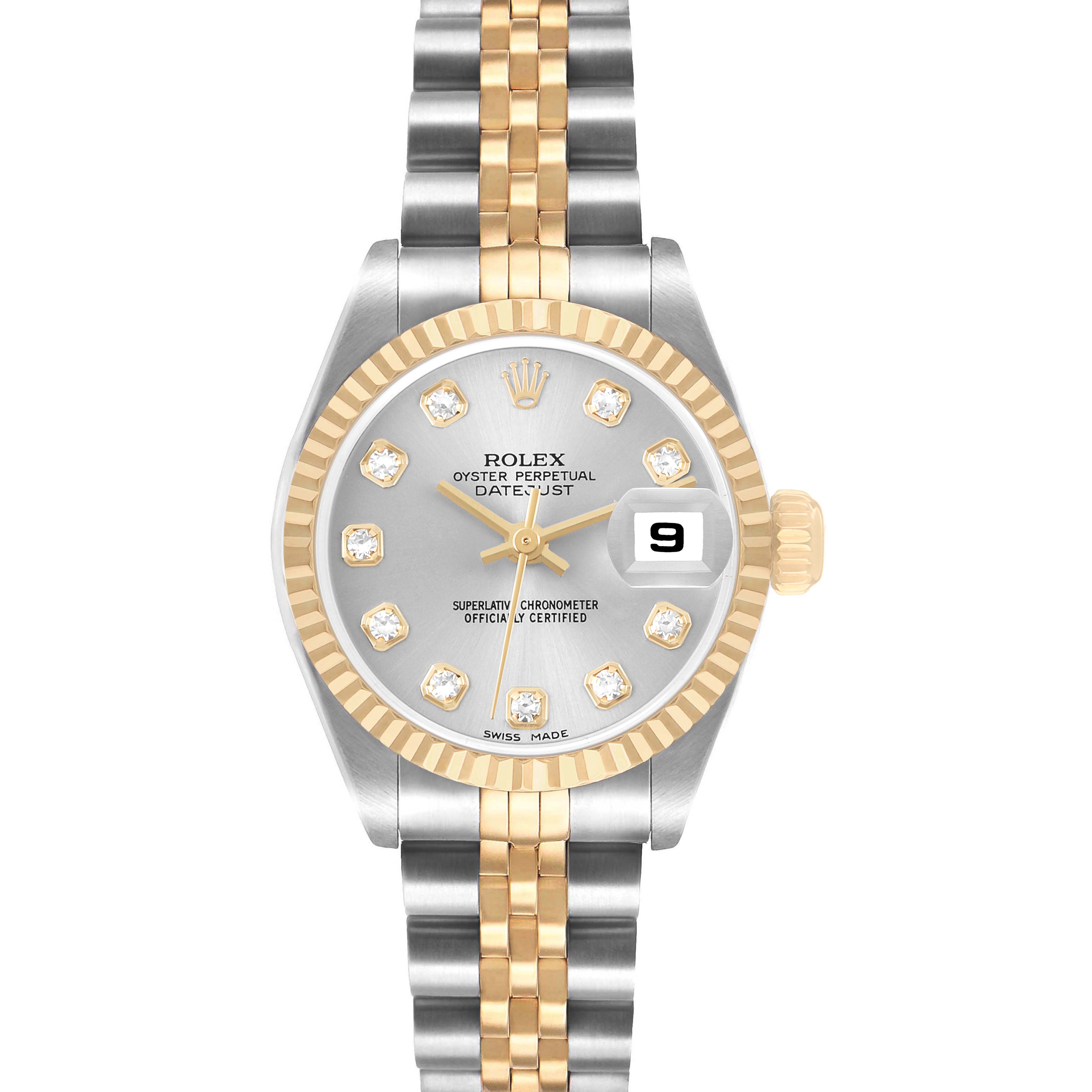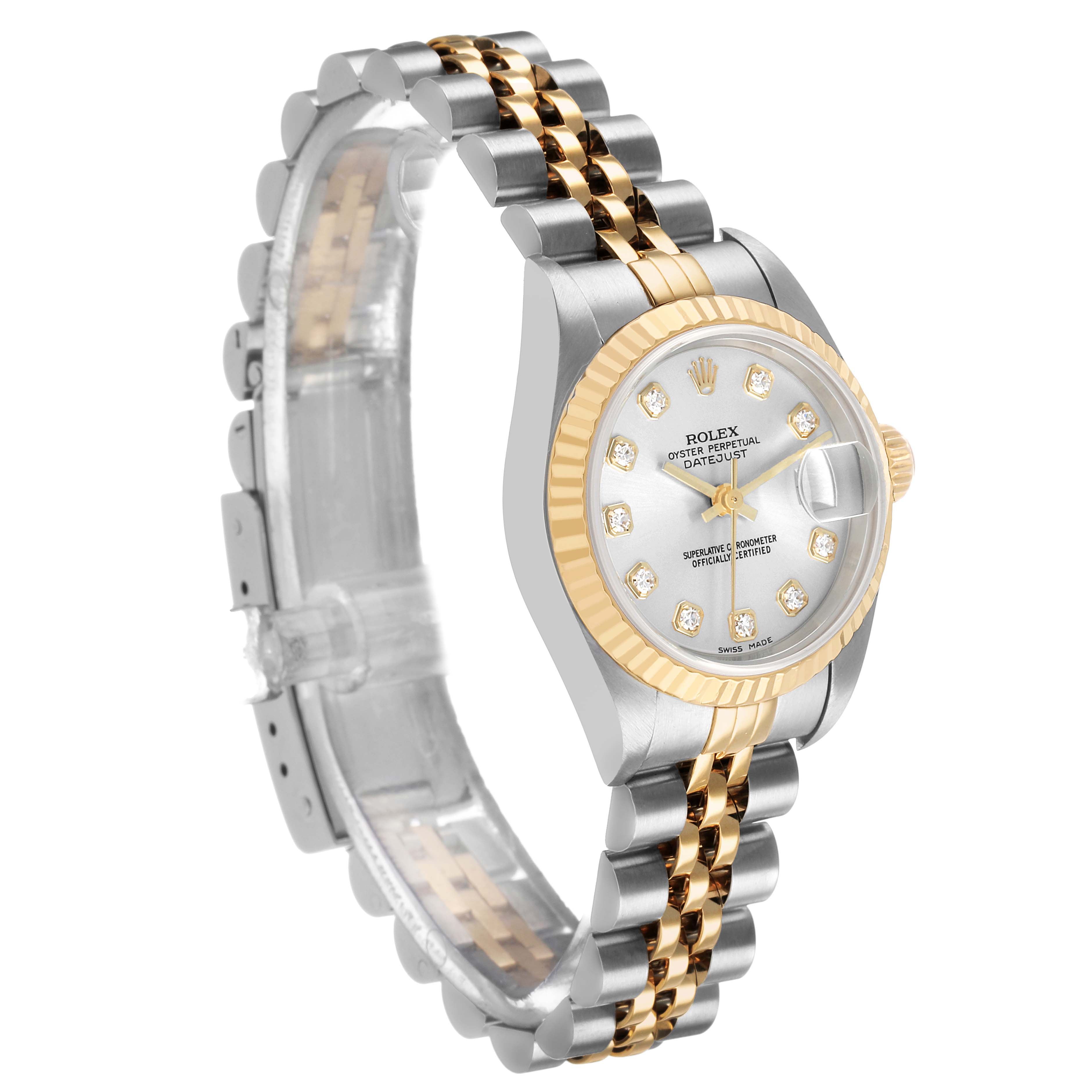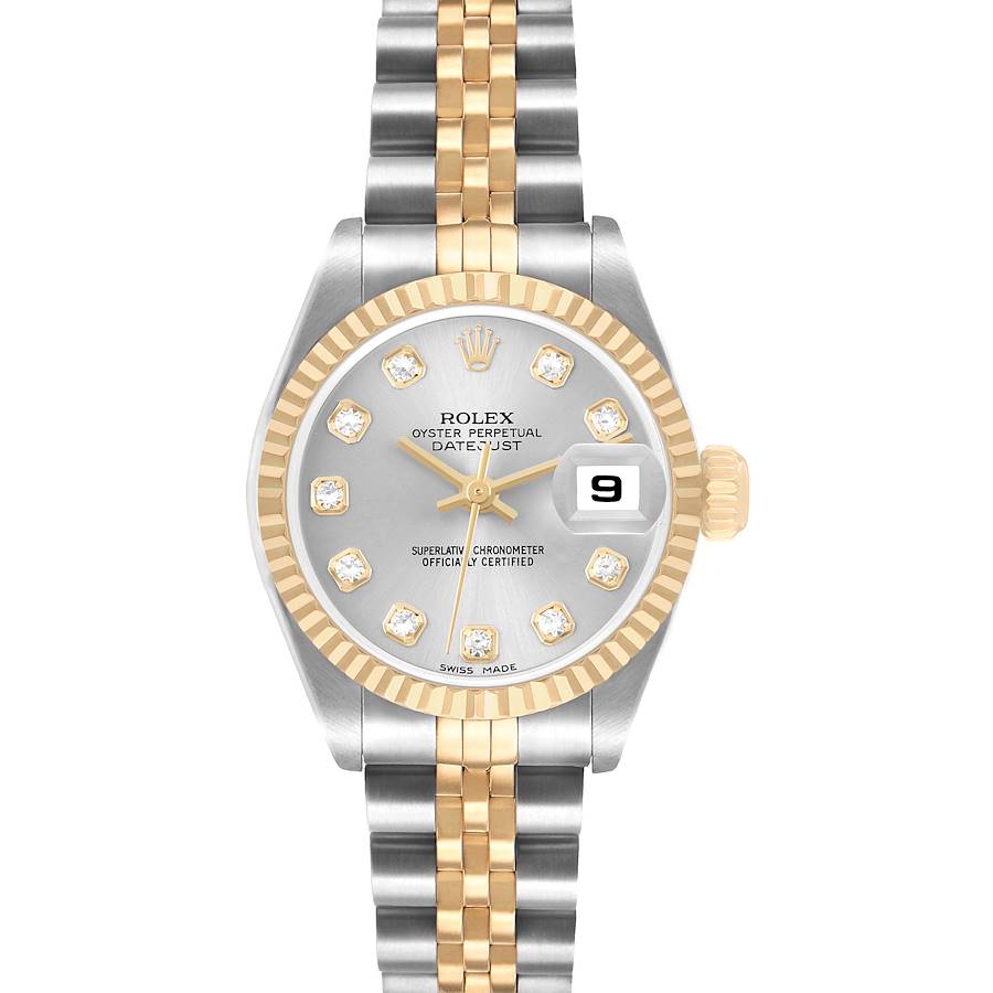 Rolex Datejust Steel Yellow Gold Silver Diamond Dial Ladies Watch 79173. Officially certified chronometer automatic self-winding movement. Stainless steel oyster case 26.0 mm in diameter. Rolex logo on the 18K yellow gold crown. 18k yellow gold fluted bezel. Scratch resistant sapphire crystal with cyclops magnifier. Silver dial with original Rolex factory diamond hour markers and yellow gold baton hands. Date calendar at the 3 o'clock aperture. Stainless steel and 18k yellow gold jubilee bracelet foldover clasp. Fits a 6 1/2" wrist.