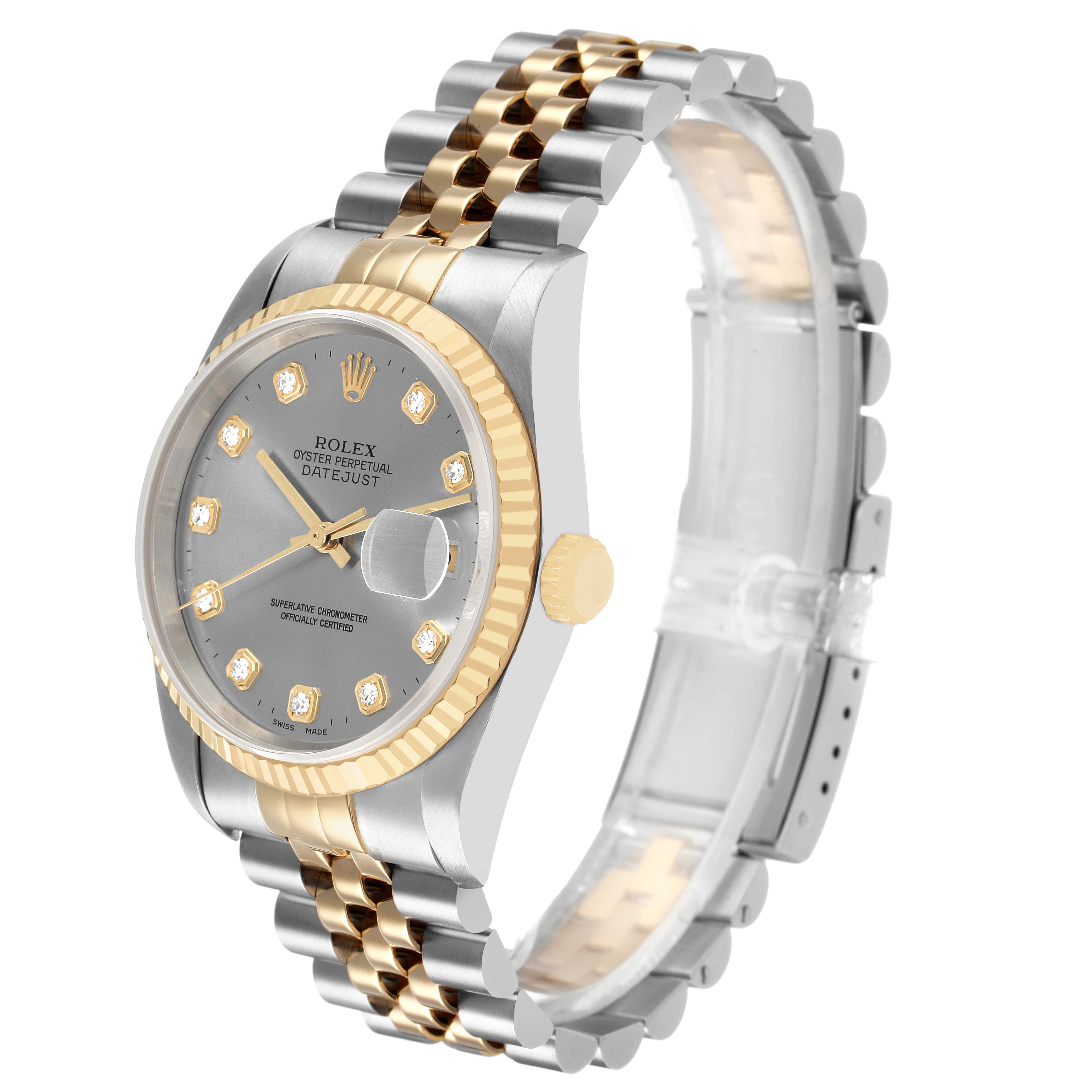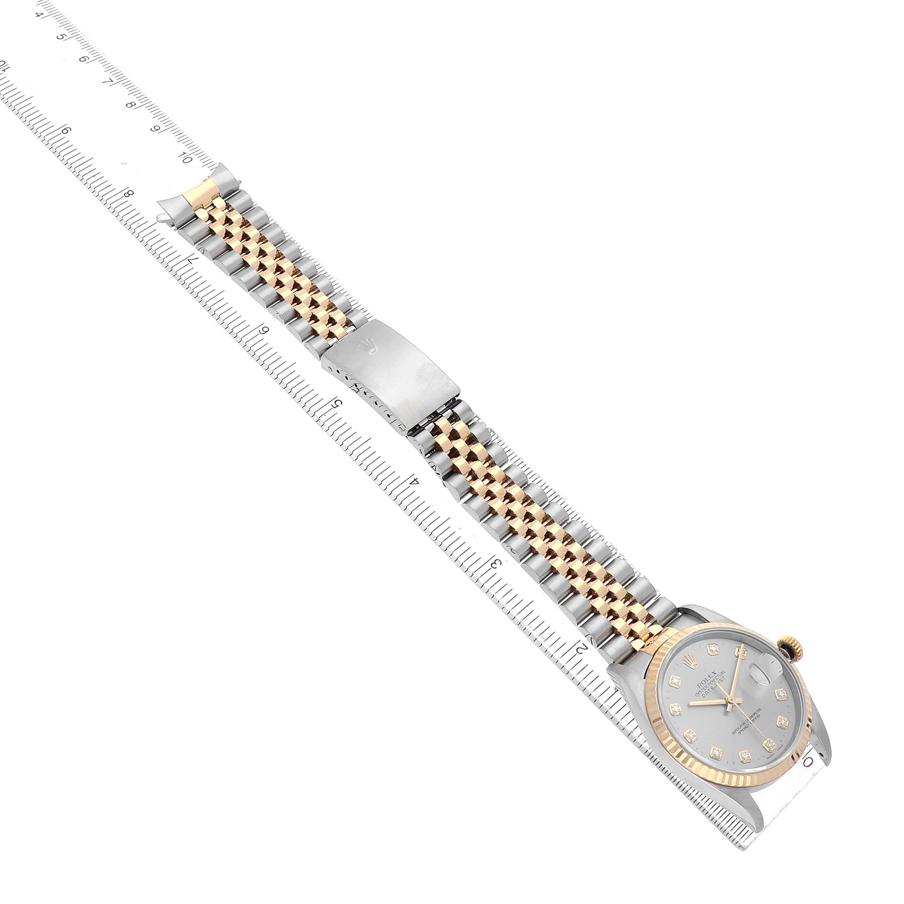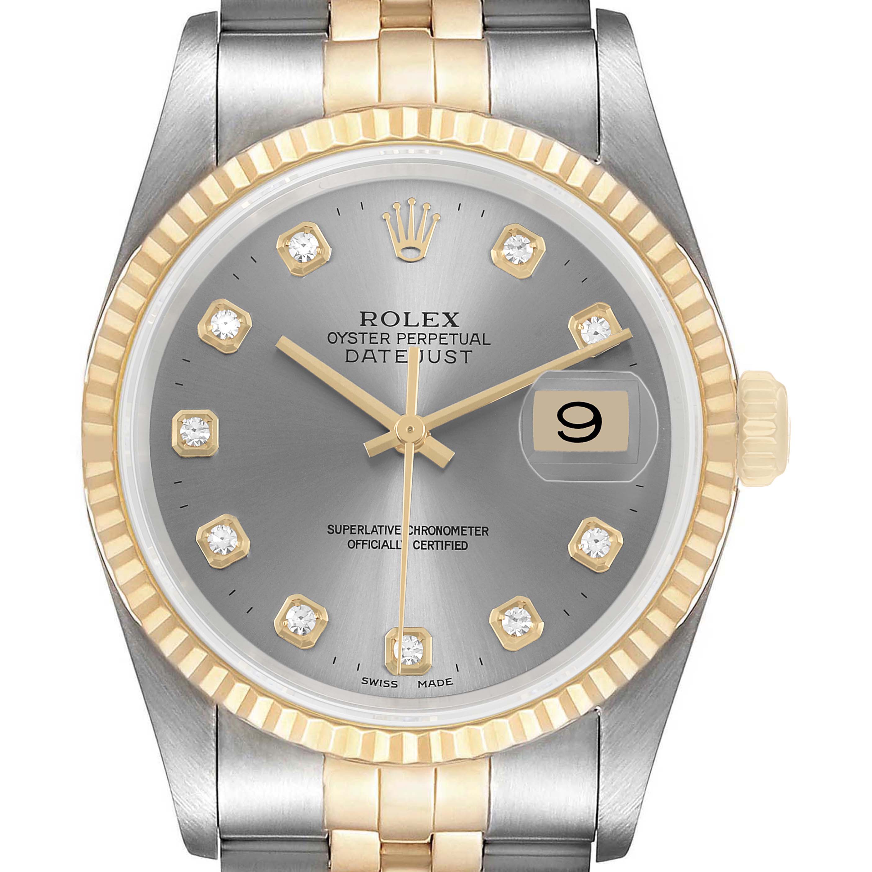 Rolex Datejust Steel Yellow Gold Silver Diamond Dial Mens Watch 16233. Officially certified chronometer automatic self-winding movement. Stainless steel oyster case 36.0 mm in diameter. Rolex logo on the 18k yellow gold crown. 18k yellow gold fluted bezel. Scratch resistant sapphire crystal with a cyclops magnifier. Silver dial with original Rolex factory diamond hour markers and luminescent yellow gold baton hands. Date calendar at the 3 o'clock aperture. Stainless steel and 18k yellow gold jubilee bracelet with a fold-over clasp. Fits a 7 1/4" wrist.