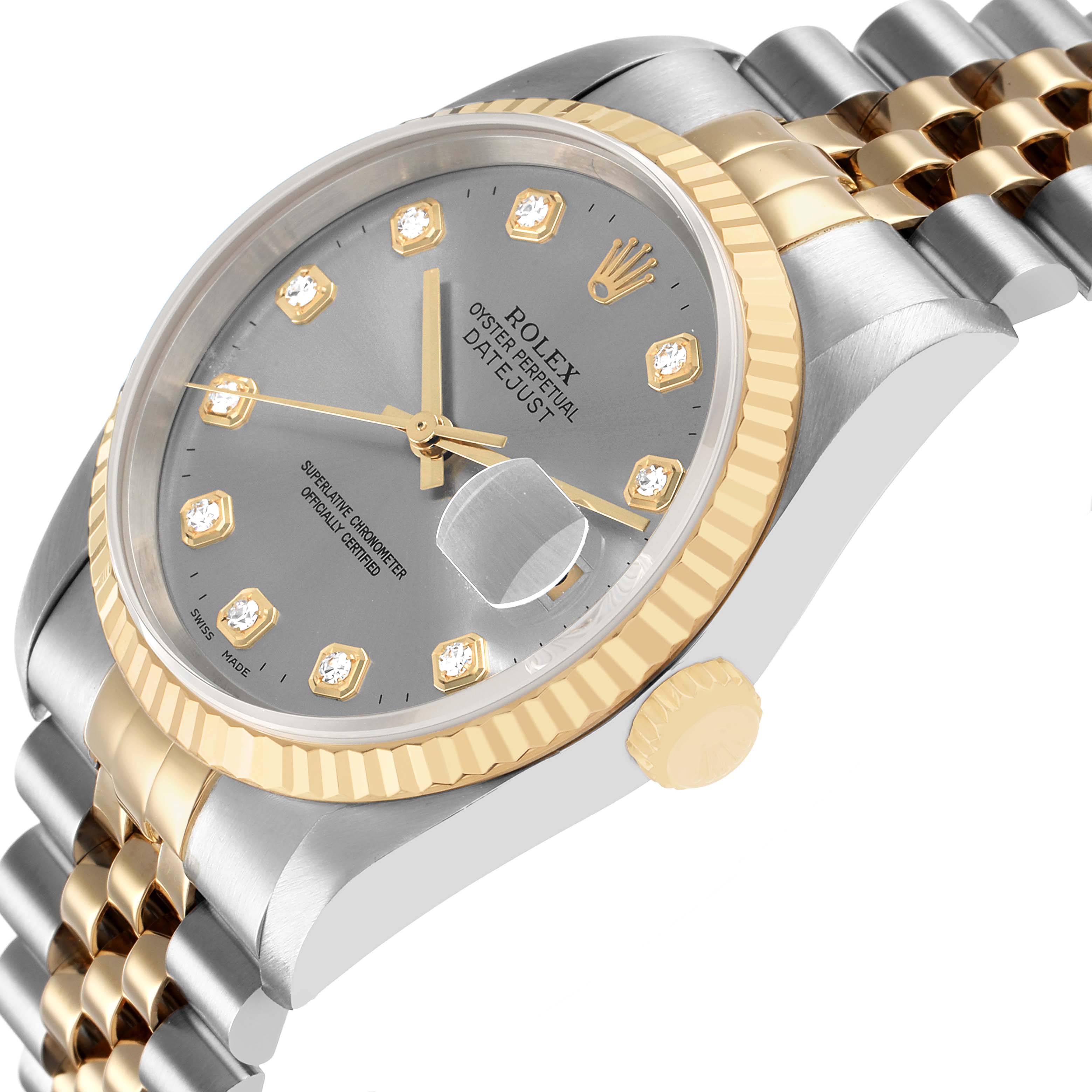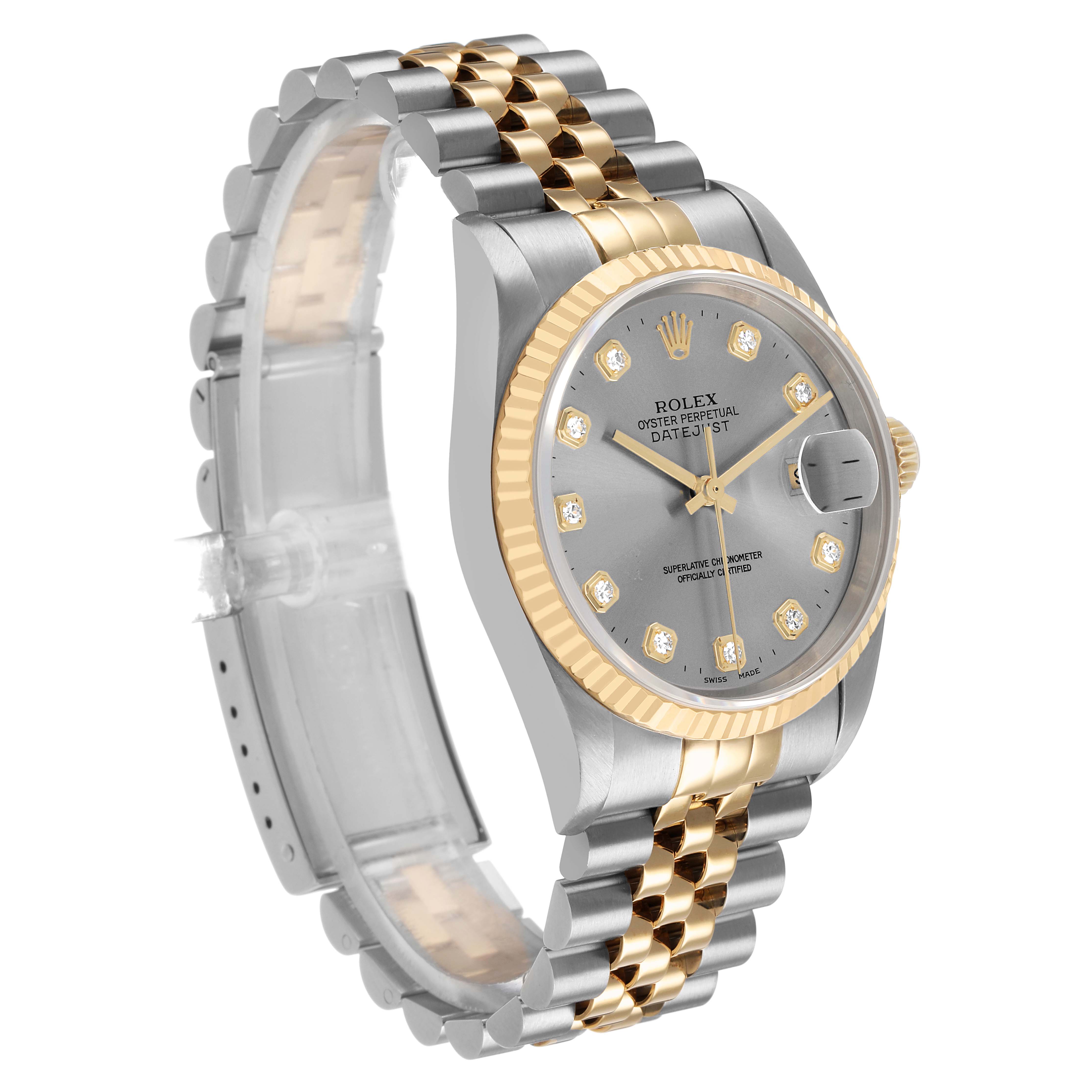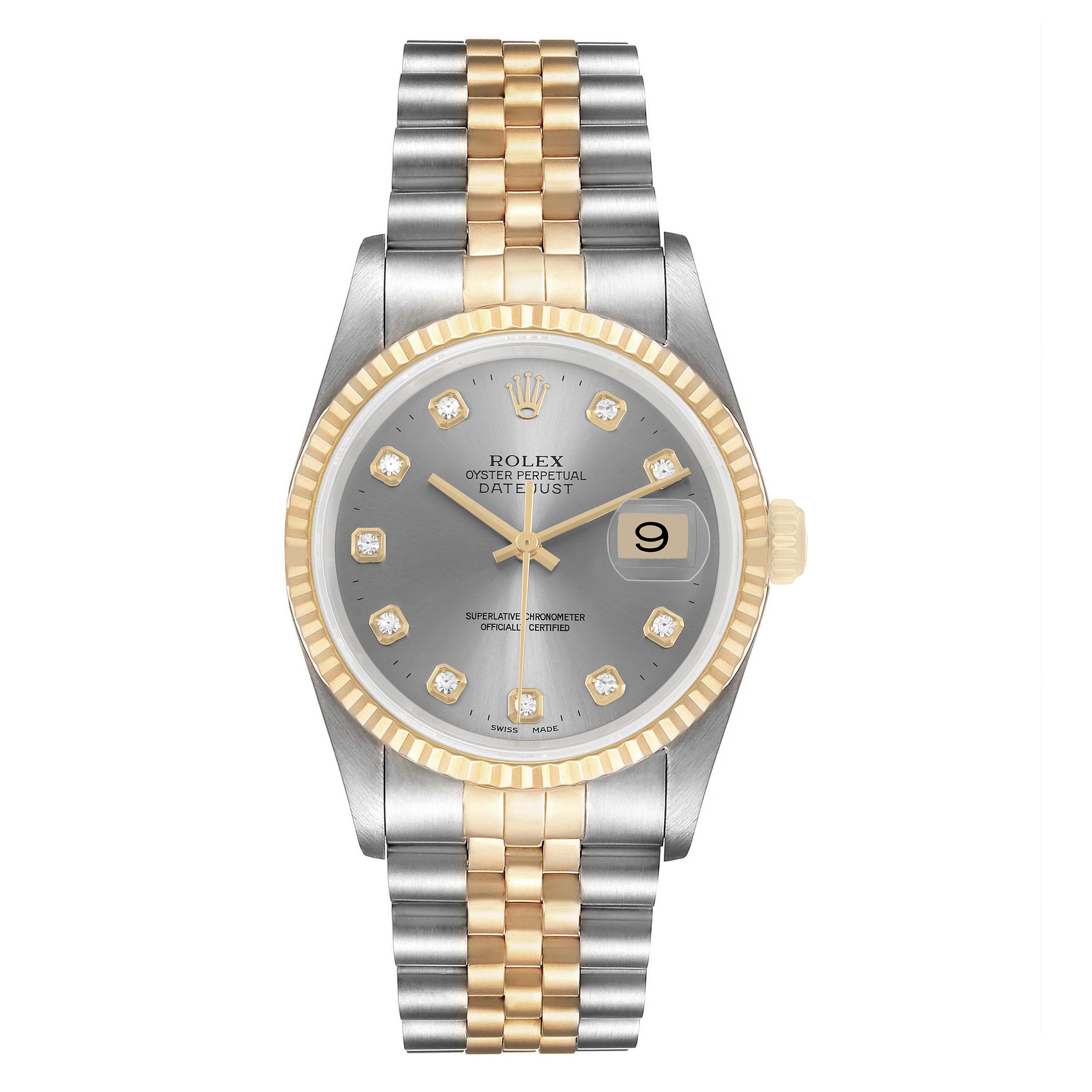 Rolex Datejust Steel Yellow Gold Silver Diamond Dial Mens Watch 16233. Officially certified chronometer automatic self-winding movement. Stainless steel oyster case 36.0 mm in diameter. Rolex logo on the 18k yellow gold crown. 18k yellow gold fluted bezel. Scratch resistant sapphire crystal with a cyclops magnifier. Silver dial with original Rolex factory diamond hour markers and luminescent yellow gold baton hands. Date calendar at the 3 o'clock aperture. Stainless steel and 18k yellow gold jubilee bracelet with a fold-over clasp. Fits a 7 1/4" wrist.