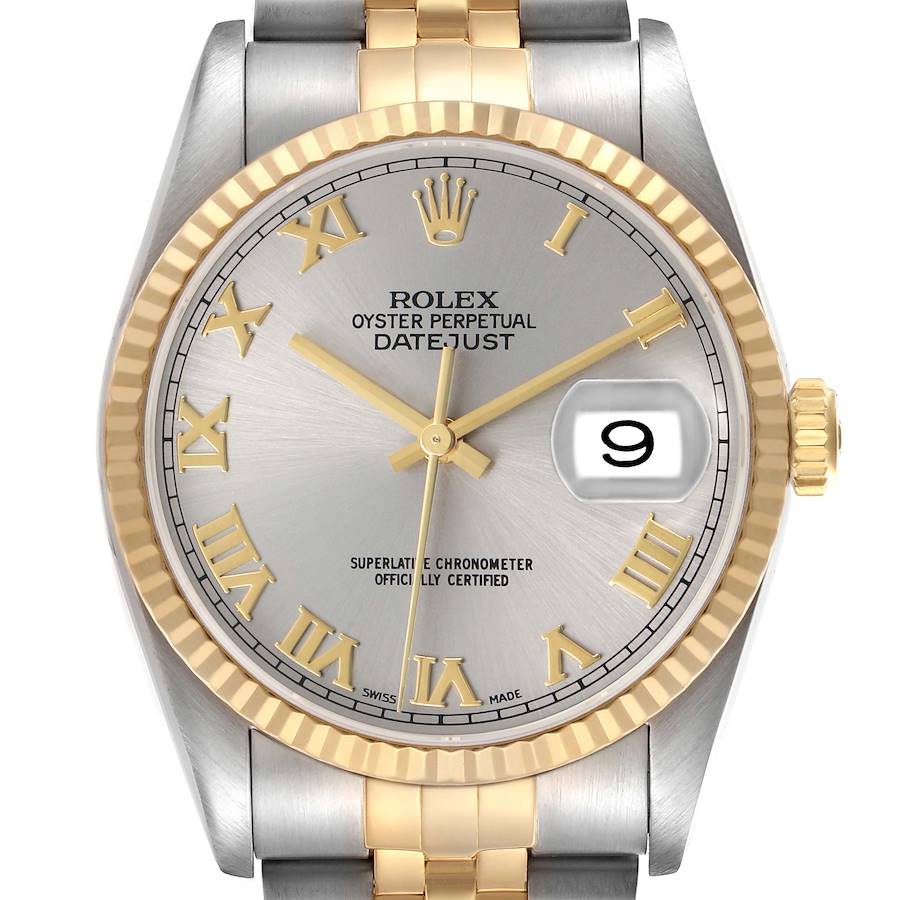Rolex Datejust Steel Yellow Gold Slate Roman Dial Mens Watch 16233. Officially certified chronometer automatic self-winding movement. Stainless steel oyster case 36.0 mm in diameter. Rolex logo on the 18K yellow gold crown. 18k yellow gold fluted bezel. Scratch resistant sapphire crystal with a cyclops magnifier. Slate grey dial with raised yellow gold Roman numeral hour markers and luminescent yellow gold hands. Date calendar at the 3 o'clock aperture. Stainless steel and 18k yellow gold jubilee bracelet with a fold-over clasp. Fits a 7" wrist.