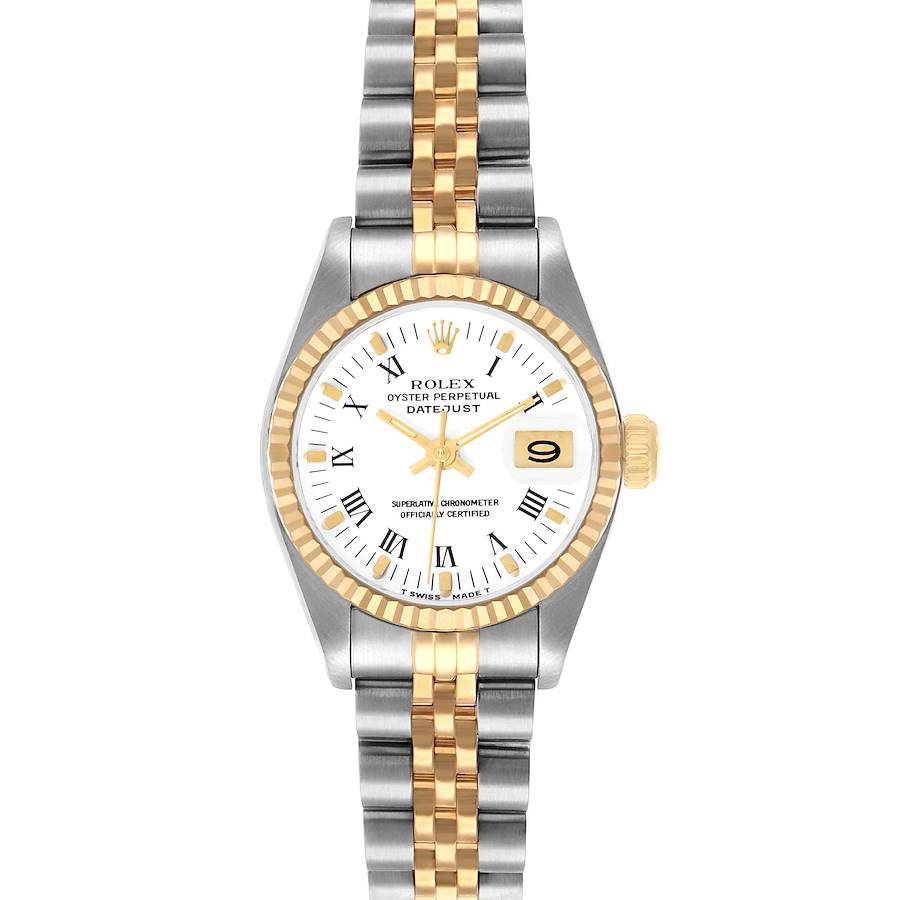Rolex Datejust Steel Yellow Gold White Dial Ladies Watch 69173. Officially certified chronometer automatic self-winding movement. Stainless steel and 18k yellow gold oyster case 26.0 mm in diameter. Rolex logo on the 18k yellow gold crown. 18k yellow gold fluted bezel. Scratch resistant sapphire crystal with a cyclops magnifier. White dial with black painted Roman numeral hour markers with yellow gold square accents. Luminescent yellow gold baton hands. Outer dot minute marker track. Date calendar at the 3 o'clock aperture. Stainless steel and 18k yellow gold jubilee bracelet with a fold-over clasp. Fits a 6.5" wrist.