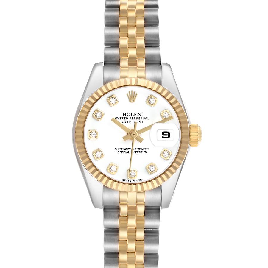Rolex Datejust Steel Yellow Gold White Diamond Dial Ladies Watch 179173. Officially certified chronometer automatic self-winding movement. Stainless steel oyster case 26.0 mm in diameter. Rolex logo on the 18K yellow gold crown. 18k yellow gold fluted bezel. Scratch resistant sapphire crystal with a cyclops magnifier. White dial with original Rolex factory diamond hour markers and yellow gold baton hands. Date calendar at the 3 o'clock aperture. Stainless steel and 18k yellow gold jubilee bracelet with a hidden clasp. Fits a 6 1/4" wrist.