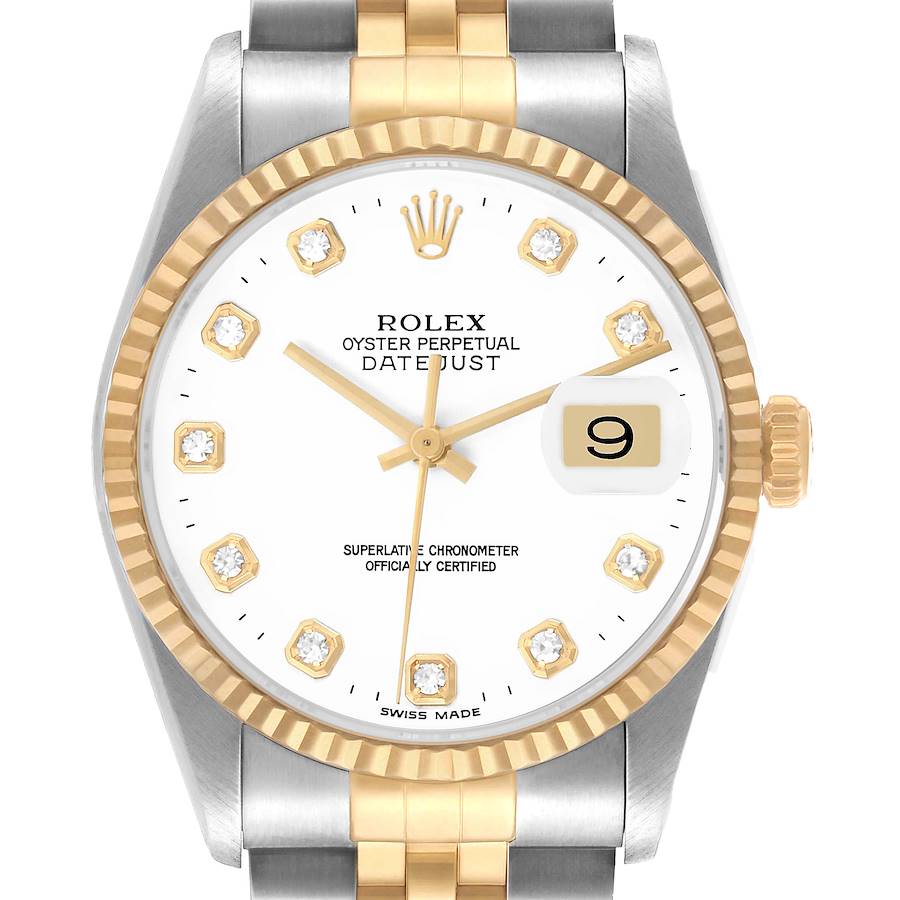 Rolex Datejust Steel Yellow Gold White Diamond Dial Mens Watch 16233. Officially certified chronometer automatic self-winding movement. Stainless steel oyster case 36.0 mm in diameter. Rolex logo on the 18K yellow gold crown. 18k yellow gold fluted bezel. Scratch resistant sapphire crystal with a cyclops magnifier. White dial with original Rolex factory diamond hour markers and yellow gold baton hands. Date calendar at the 3 o'clock aperture. Stainless steel and 18k yellow gold jubilee bracelet with a fold-over clasp. Fits up to a 7" wrist.