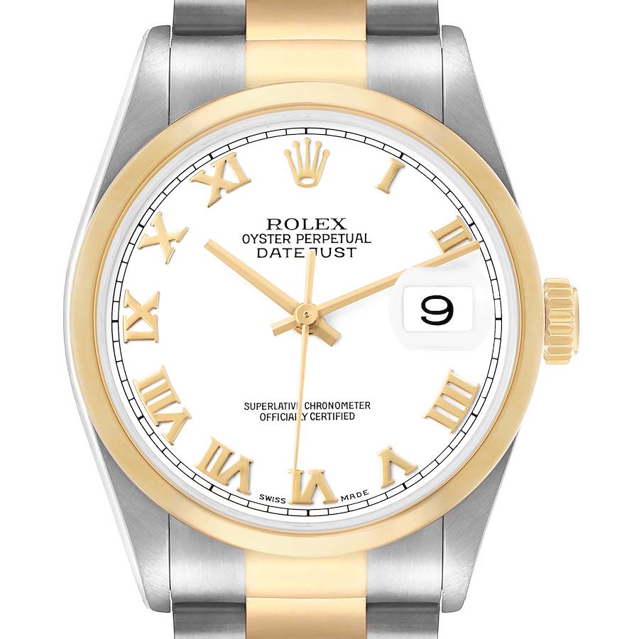 Rolex Datejust Steel Yellow Gold White Roman Dial Mens Watch 16203 Box Papers. Officially certified chronometer automatic self-winding movement. Stainless steel oyster case 36.0 mm in diameter. Rolex logo on the 18K yellow gold crown. 18k yellow gold smooth bezel. Scratch resistant sapphire crystal with a cyclops magnifier. White dial with raised yellow gold Roman numeral hour markers and baton hands. Date calendar at the 3 o'clock aperture. Outer minute marker track. Stainless steel and 18k yellow gold oyster bracelet with a fold-over clasp. Fits a 7.5" wrist.