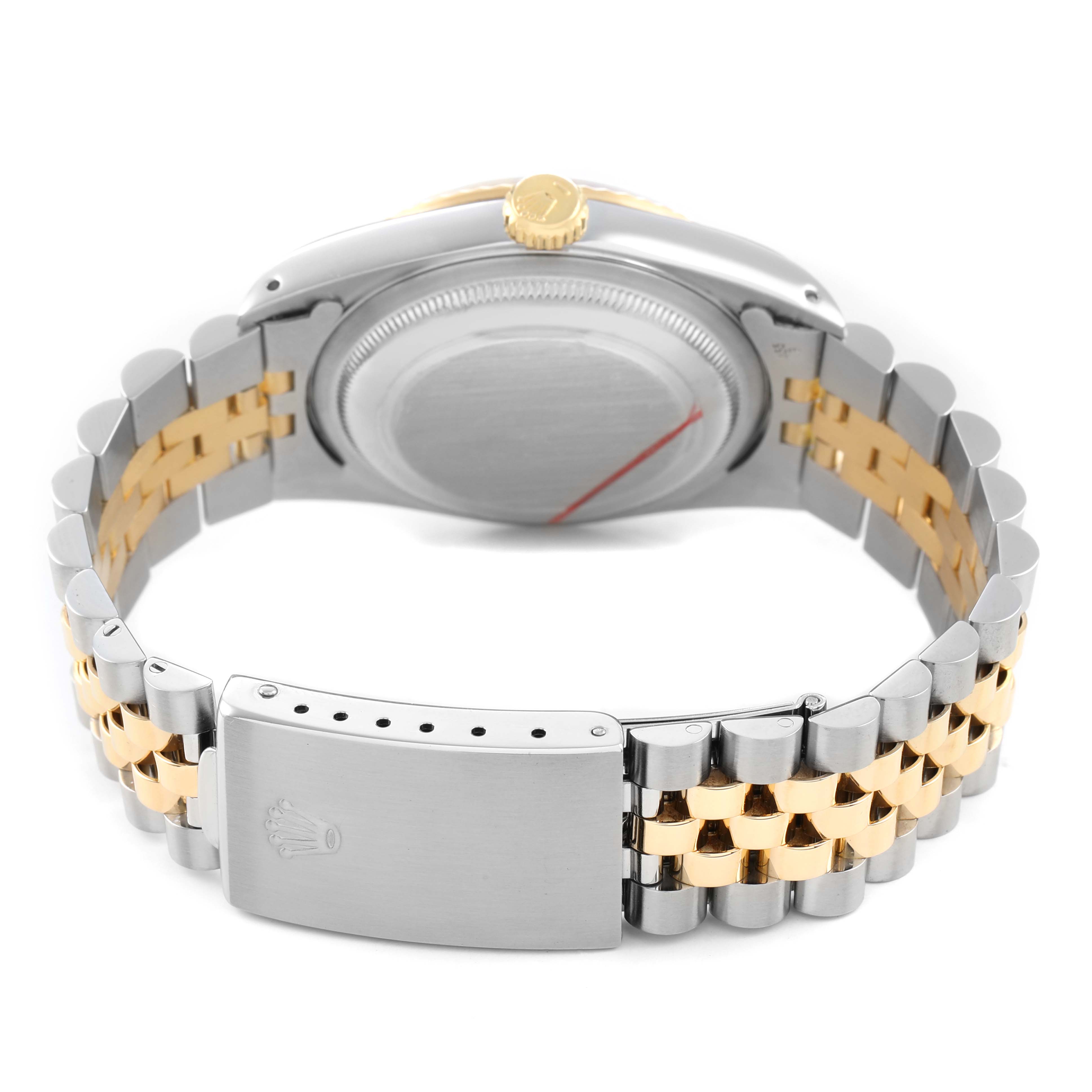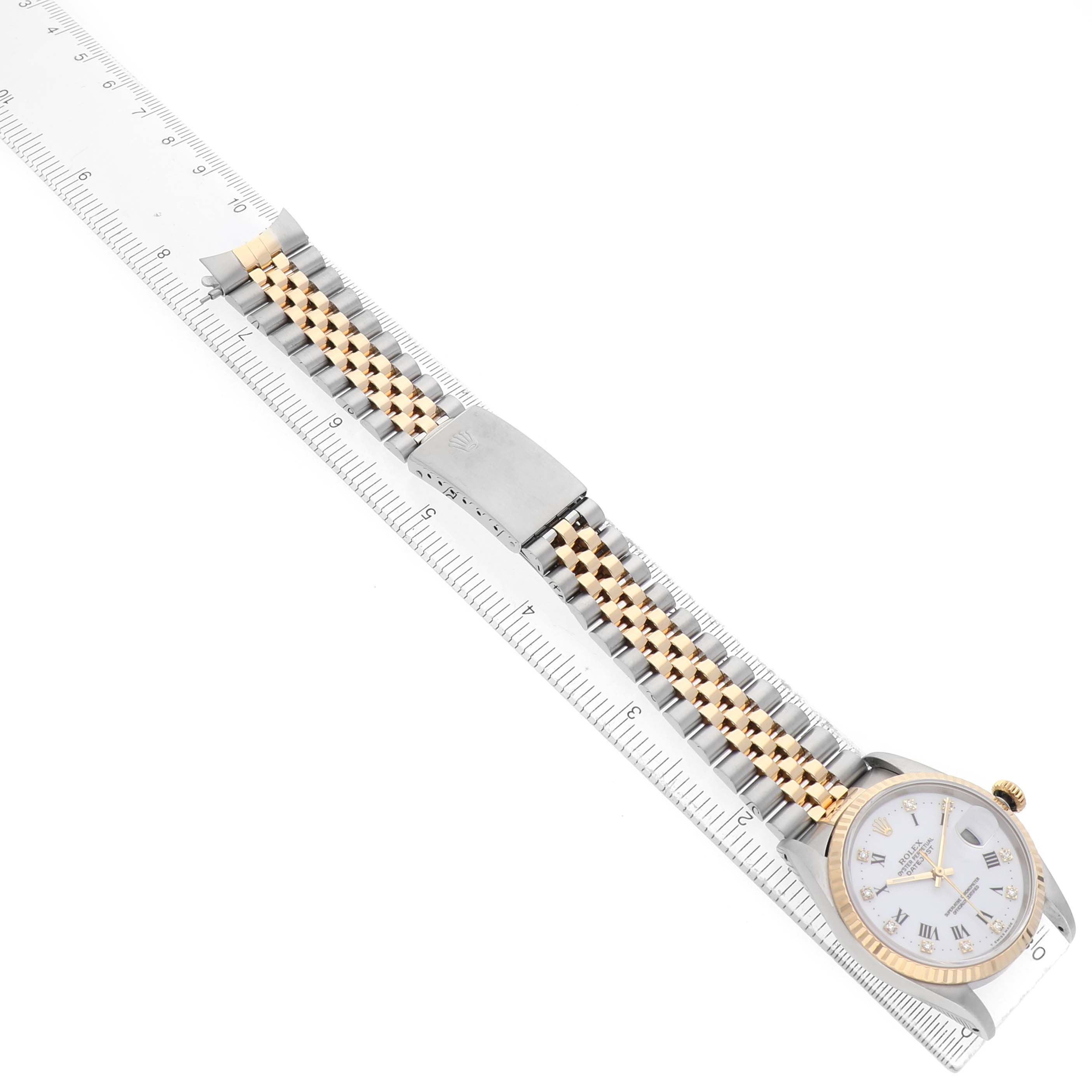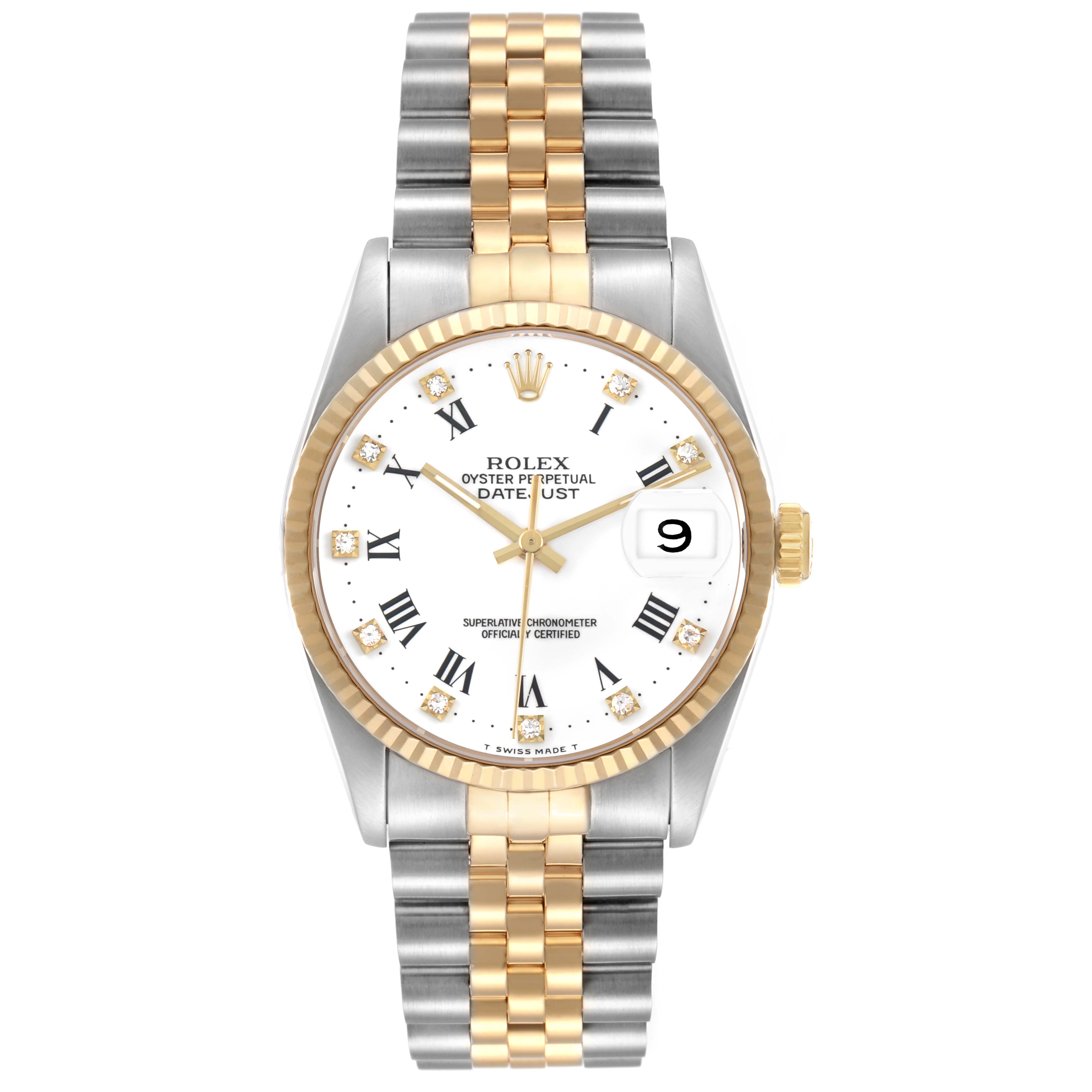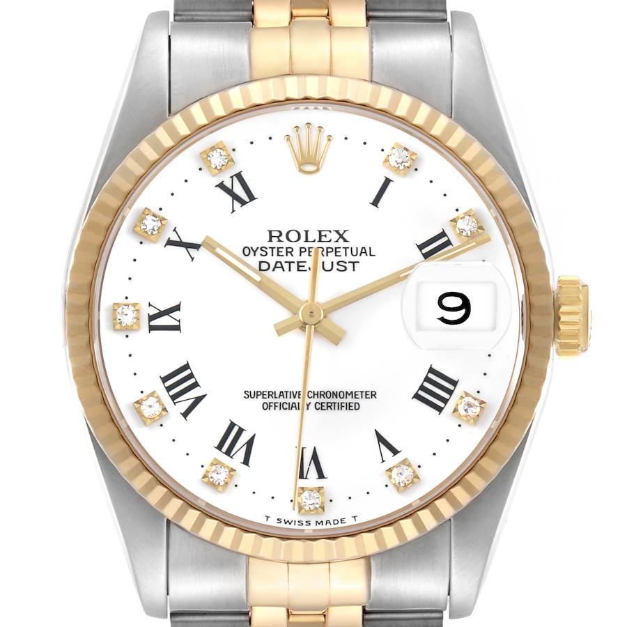 Rolex Datejust Steel Yellow Gold White Roman Diamond Dial Mens Watch 16233. Officially certified chronometer automatic self-winding movement. Stainless steel oyster case 36.0 mm in diameter. Rolex logo on the 18k yellow gold crown. 18k yellow gold fluted bezel. Scratch resistant sapphire crystal with a cyclops magnifier. White dial with black painted Roman numeral hour markers with yellow gold original Rolex factory diamonds square accents. Luminescent yellow gold baton hands. Outer dot minute markers. Date calendar at the 3 o'clock aperture. Stainless steel and 18k yellow gold jubilee bracelet with a folding clasp. Fits a 7 1/4" wrist.